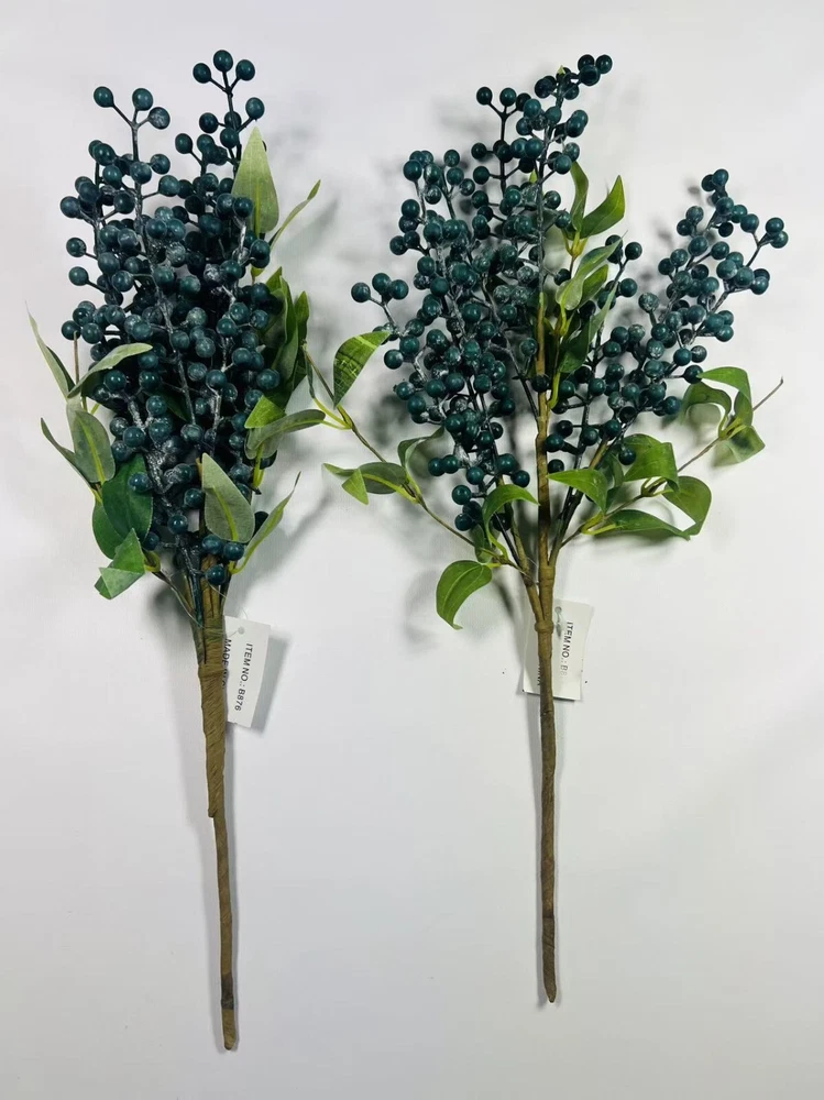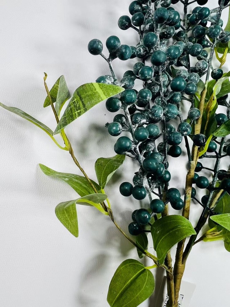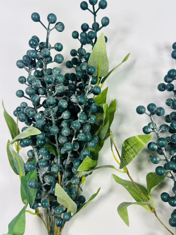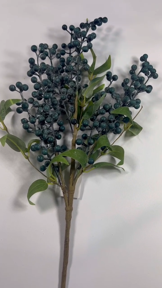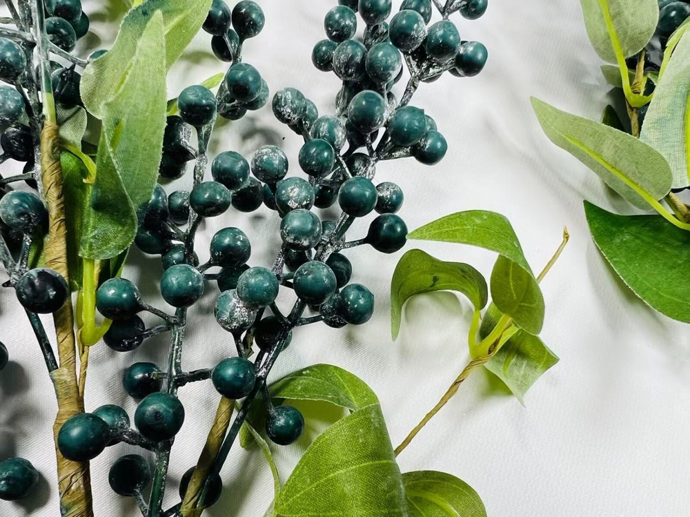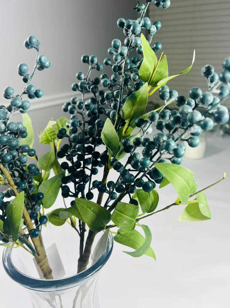 Add a refreshing botanical element to your space with this 24-inch artificial blueberry spray. Featuring dense clusters of lifelike navy blue berries and lush green leaves, this faux stem is perfect for vases, table centerpieces, wedding arrangements, and everyday home styling. The flexible brown stem allows for easy bending, shaping, and styling in various decor settings. Reusable and low-maintenance, it’s a timeless touch for any rustic or farmhouse theme.