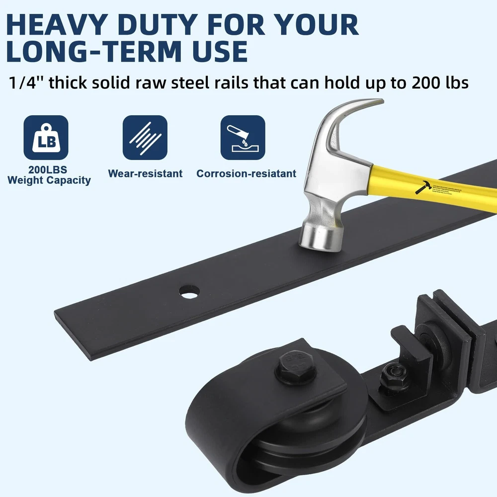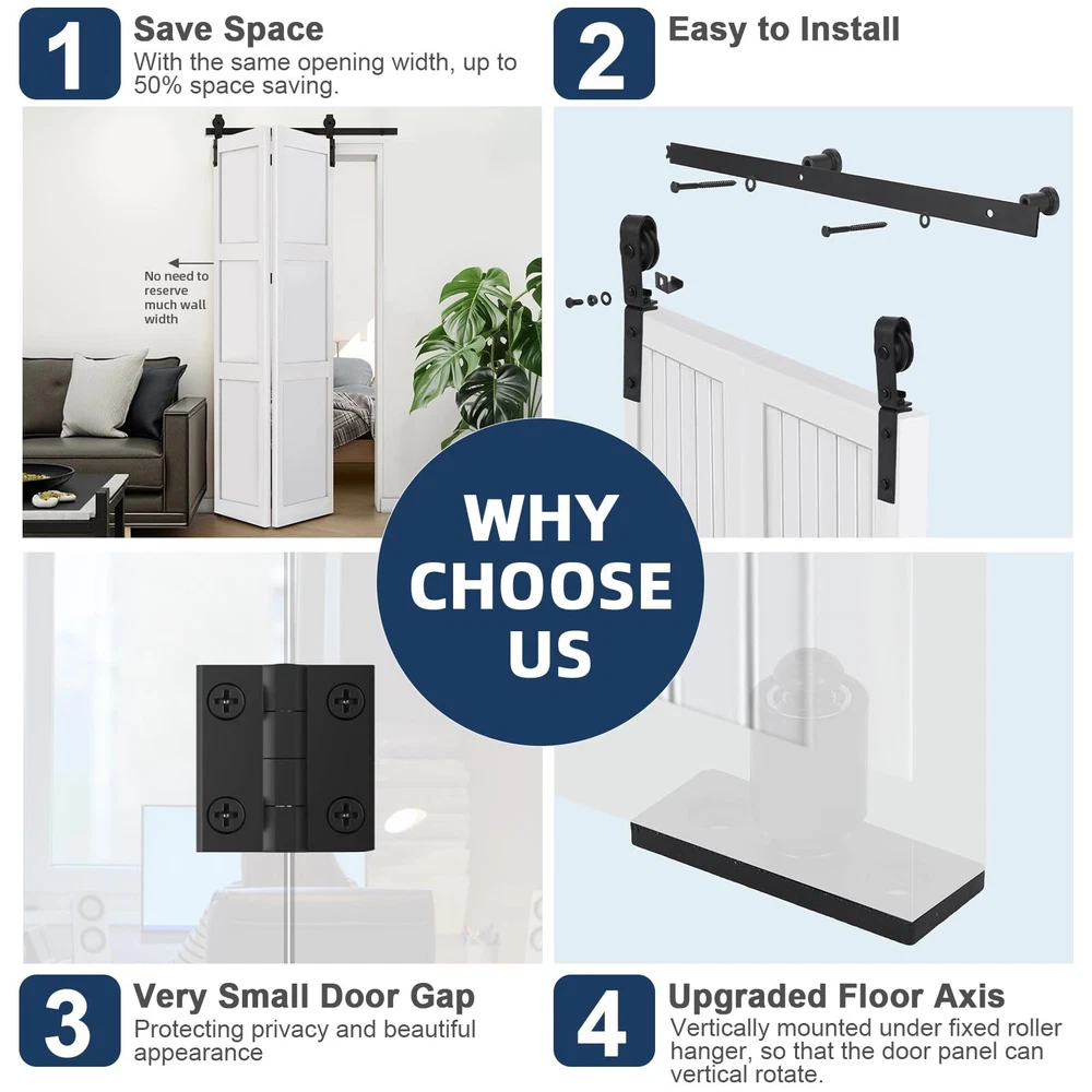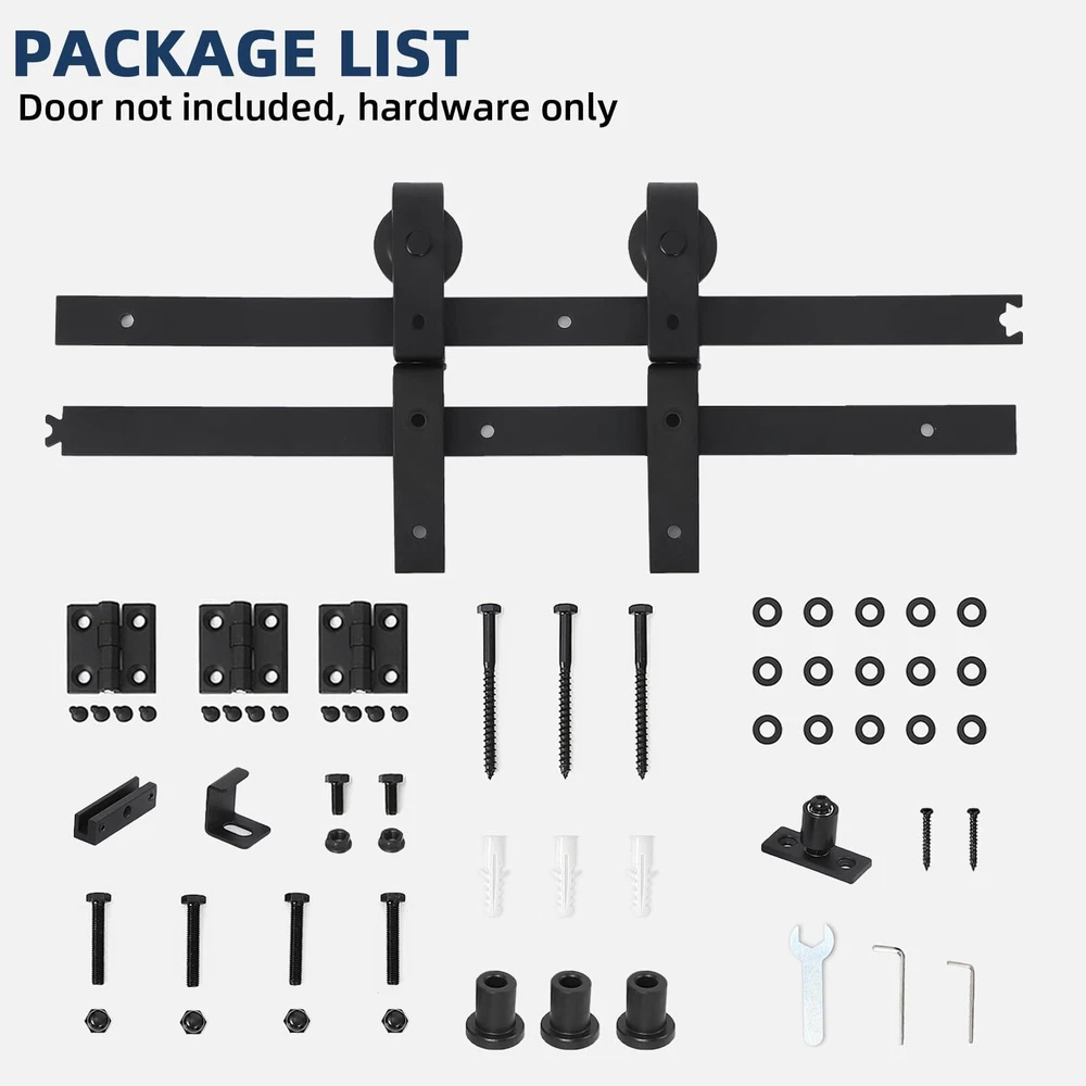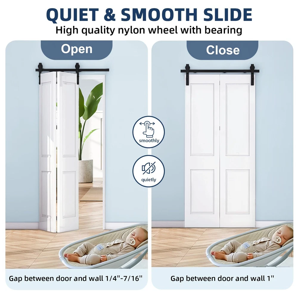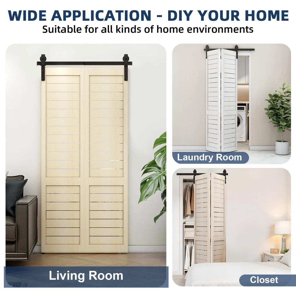 Durable and Heavy Duty: Our bifold barn door hardware kit is made of high quality steel with a black -coated finish that can hold up to 200 lbs of door weight and is corrosion resistant, rust proof, durable and strong. Tested over 100,000 times to ensure years of beauty and longevity! Smooth and Quiet Operation: The sliding mechanism of our hardware kit is designed to provide a smooth and quiet sliding experience, allowing you to open and close doors effortlessly. Ball bearing rollers ensure that the rollers glide smoothly and quietly on the track - gliding like butter Space-Saving Folding Design: Different from the traditional hardware kit on the market, our innovative folding door kit can greatly save you space, making it perfect for small rooms or areas with limited space. Can be used in a variety of occasions, such as living room, dining room, study, etc. Easy Installation & 24 Hours Stand By: Our bifold door hardware package is attached with the most detailed product installation and operation instructions available to help you through the installation step-by-step, or you can us online and we'll work with you throughout the process for a smooth installation Choose the Right Bifold Barn Door Hardware: Fit up to 10" wide bifold doors; Fit Door Thickness: 1-3/8" ~ 1-3/4"; Door weight capacity: 200lb. Package List: 1x24" Rail, 2x Rollers, 2x Roller Rotating Bracket, 1x Roller Fixator, 3x Spacer, 3x Hinge, 1x Floor Guide. All necessary parts are included. (DOOR IS NOT INCLUDED.)