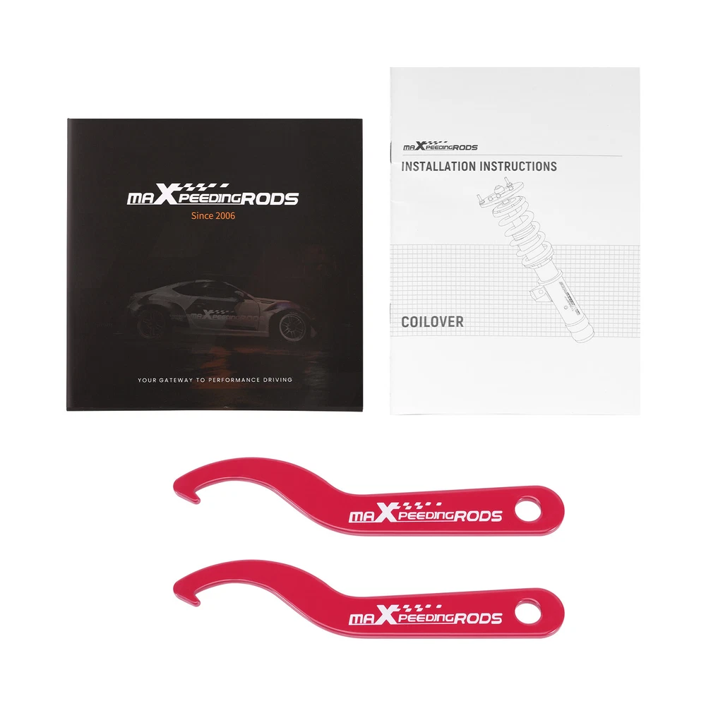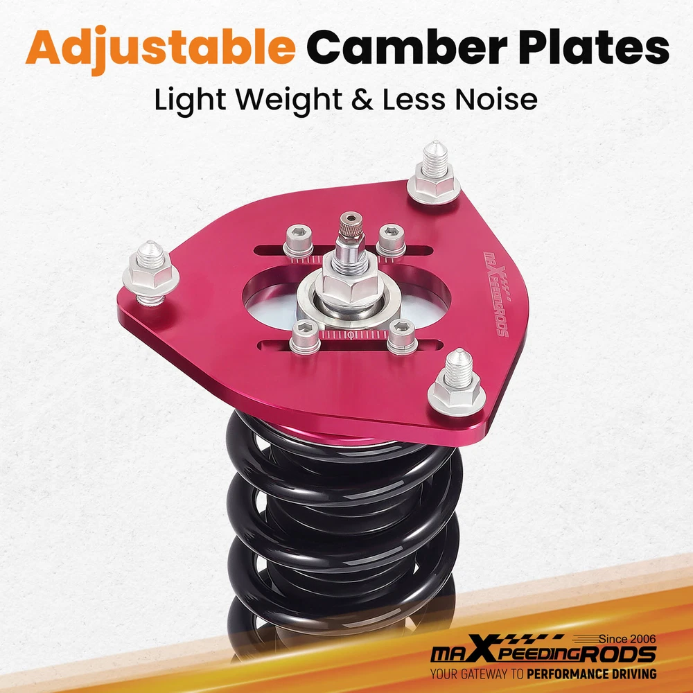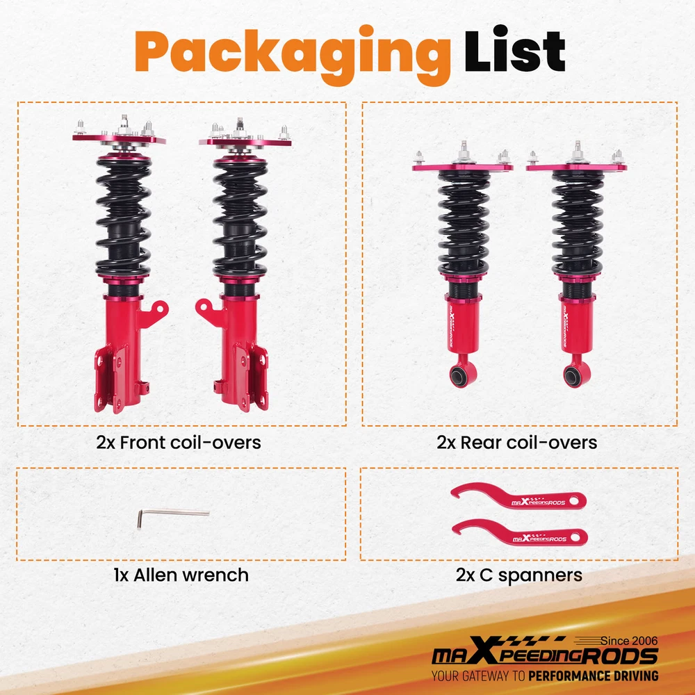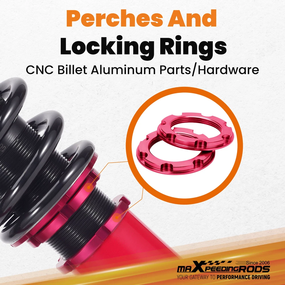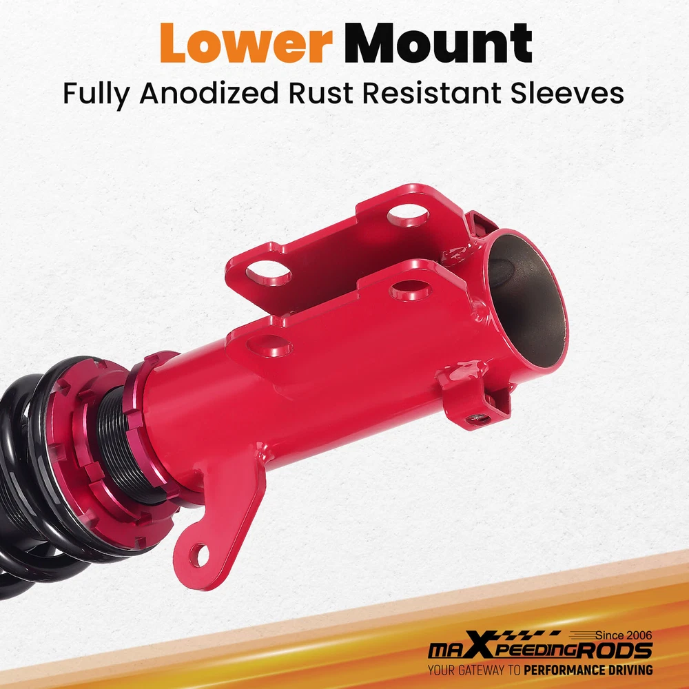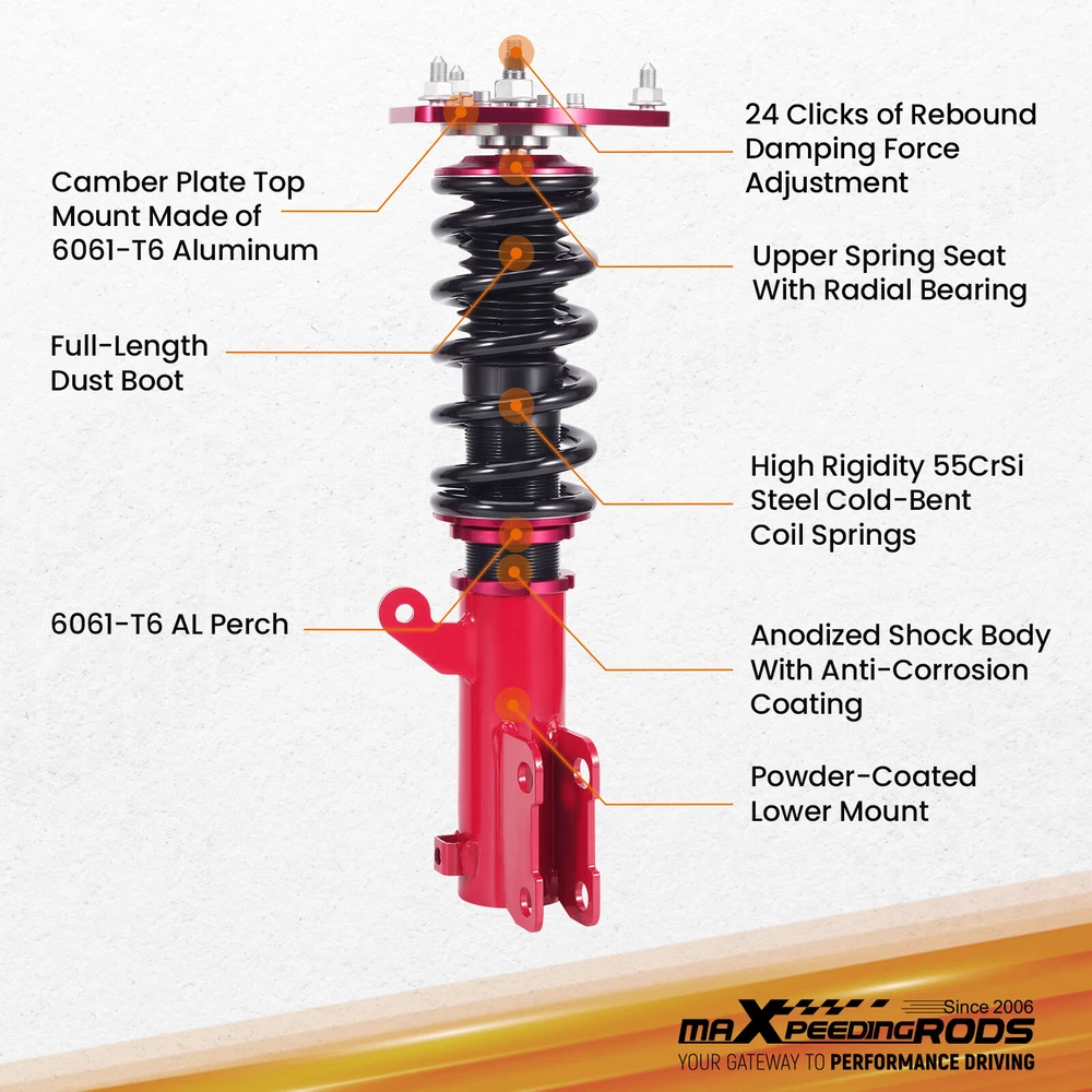 ZJPSS 24 Click Damper Coilovers Lowering Kit for Mitsubishi Eclipse 06-12 Coilovers 24 Way Damper Adjustable Lowering Kit for MITSUBISHI LANCER 2002-2006 Camber Plate with Pillow Ball Mount Provides More Precise Feel From Suspension And Steering Top Camber Plate with Pillow Ball Mount Provides More Precise Feel From Suspension And Steering Rebound Damping Force Adjustable 24 Step To Adjust Soft / Hard Adjustment According To Your Preference. Anodized Shock Body With Anti-Corrosion Coating Manufactured From High Quality T-6061 Billet Aluminum With Anodized Finish For Superior Strength And Corrosion Protection. Specification Front Spring rate 7 kg/mm (392 lbs/in) Rear Spring rate 6 kg/mm (336 lbs/in) Adjustable camber plate Yes Damping adjustable Yes, 24 levels of rebound damping force Height adjustable Yes, lowering 25-75mm depending on the vehicle models Package included 2 Front + 2 Rear Warranty 2 Years Maxpeedingrods' street coilovers are designed and developed for all motoring enthusiasts that want excellent handling without sacrificing comfort. This suspension system is ideal for daily driving and occasional, light track use. High quality components are adopted to ensure product durability and stability. Each application is fully test fitted and completely road tested to guarantee all our customers perfect performance and comfort expectations. Features - Independent ride height adjustable: Easily adjust the height of your ride! This coilover also allows for height and preload adjustments. This means you can reach optimal suspension tuning while maintaining a stable, comfortable ride at all times. - 24 Levels Damping Force Adjustable : Provides an extensive range of adjustability, making it easy to customize for various purposes and achieve desired ride comfort. - High Durability Bearing and Thrust Seat : Utilizes top-quality components for durability and noise reduction, ensuring long-lasting performance and silent operation. - Reinforced Rubber Bushing Upper Mount : Specifically designed for each vehicle, enhances silence and comfort. Adjustable camber angle for certain strut mechanism suspension cars. Full Length Adjustable Type: Allows ride height adjustment without affecting suspension stroke, maintaining comfort while customizing height. - 55CrSi Steel Cold-bent Spring : Features extreme lightweight and high durability with world-class tensile strength, reducing metal fatigue and enhancing performance. - Balanced Comfort & Performance : Strikes a harmonious blend between sporty handling dynamics and daily drivability. Application For Mitsubishi Eclipse IV 2006–2012 (DK2A/DK4A) For Mitsubishi Galant (DJ) 2004-2012 Specification - Front top mount: Pillow ball with camber plate - Rear top mount: Standard rubber - Damping adjustable: Available, 24 levels of rebound damping force - Camber adjustable: Available, front only - Height adjustable: Yes, lowering 25-75mm depending on the vehicle models - Spring Rate Front: 7 kg/mm(392lbs/in) - Spring Rate Rear: 6 kg/mm(336lbs/in) - Front spring inner diameter: 70.5 mm - Rear spring inner diameter: 70.5 mm - Spring length Front: 200 mm - Spring length Rear: 180 mm - Spring Preload advised: 7-10 mm - Color: Red body with black spring Package included 2x Front coil-overs 2x Rear coil-overs 1x Allen wrench 2x C spanners ★ 30-day Money Back & 12-Month Replacement Guarantee. Please feel free to contact us if there is any question. Height Adjustable Lowering Kit; Independent Ride Height And Spring Tension Settings; 24 Clicks of Rebound Damping Force Adjustment; High Rigidity 55CrSi Steel Cold-bent Springs; Anodized Shock Body With Anti-Corrosion Coating; Top Camber Plate with Pillow Ball Mount Provides More Precise Feel From Suspension And Steering; Full 1 Year Limited Warranty From Date Of Purchase. Other items you might also like 2-4" Lift Front Upper Control Arms For 95-04 Toyota Tacoma / 96-02 4Runner 6 Lug Front Passenger Right Side Power Window Lift Motor for Toyota RAV4 2001-2005 4 Ignition Coils & Spark Plugs For Mazda 3 6 CX-7 L4 2.0/2.3/2.5L UF540 90083 Intake + Exhaust Camshaft Phaser for Ford Mustang Taurus Edge 3.5L AT4Z6C525B 20AN Nylon Braided Stainless Steel Hose Hose Fuel line Oil Cooling Line 5Ft Steering Torque Sensor For Saturn Aura l4 2.4L 2007-2009 23232310 New 1PC Turbo Intercooler for Ford F-150 Expedition for Lincoln Navigator FL3Z6K775B Power Steering Gear Box for Chevy Malibu Chevelle Camaro Monte Carlo 27-6509 Dual Steering Stabilizers For Dodge Ram 2500 3500 Truck 2014-2022 6 Ignition Coils & Spark Plugs For BMW 320i 325Ci 325i 325xi 330Ci UF522 7092 Engine Motor & Trans Mount Set of 3 for Scion XA/XB 04-06 for Toyota Echo 00-05 12 V 125 A Alternator for Chevy Malibu Cobalt for Pontiac G5 for Saturn Vue Aura Shipping Terms of Sales Payment Contact us All orders will be shipped within 1 business day after payment has been processed. For orders placed before 5:30 AM PST on business days, most items will be shipped out on the same day. All orders will be shipped with a tracking number via USPS, UPS, or FedEx Express and delivered within 2-6 business days We do not ship to P.O. Boxes, APO/FPO addresses, or Military Mail Boxes. Please ensure your address is confirmed by PayPal before checkout, as we only ship to confirmed addresses. 30-day free return and money back guarantee If you are not satisfied with your purchase, you can return the item with its original packaging to us for a full refund with no restocking fee. Please note that the return cost should be paid by the seller. One Year Unlimited Mileage Quality Guarantee If you receive incorrect items, items that are damaged during transportation, or defective items, we will accept returns and cover the return freight. Please note that the return cost should be prepaid by the buyer. After inspecting the faulty item, we will issue a refund of the return cost to the buyer. We offer a full refund or replacement for all faulty items, which includes the cost of original s