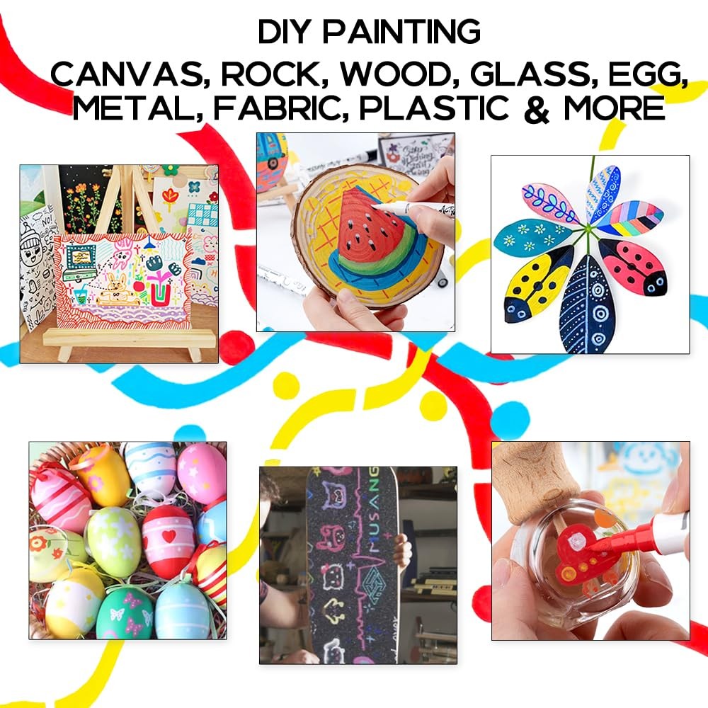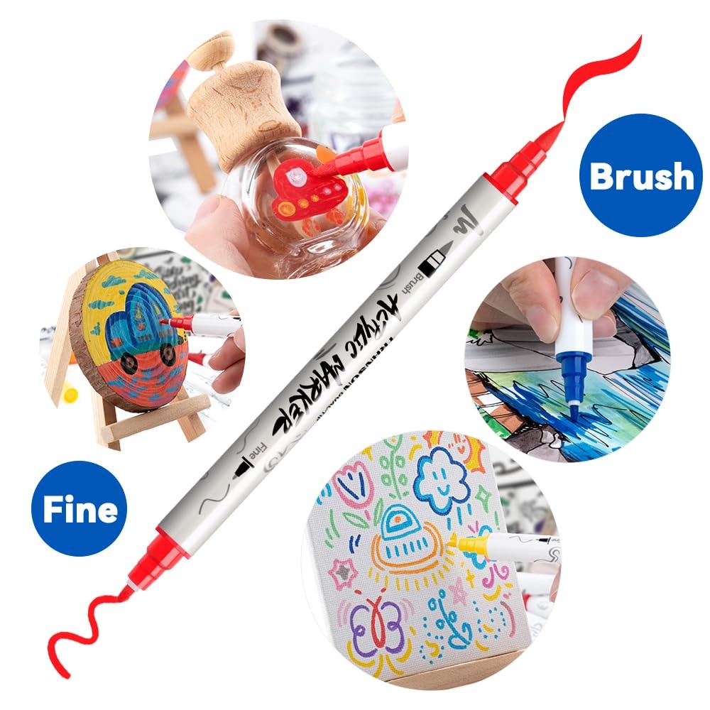24 Color Dual-tip Acrylic Paint Pen Set. These premium quality dual-tip pens enabling you to express your creativity with precision and accuracy. The non-toxic, quick-drying, and water-resistant paint ensures a long-lasting color effect, and the set includes 24 vibrant colors to choose from. Ideal for both beginners and professional artists, you can explore endless possibilities and bring your imagination to life with the Dual-tip Acrylic Paint Pen Set. It's time to let your artistic flair shine through! dual tip acrylic paint marker set 24 colors. 2 tips: one end with 0.7-1mm(approx.) fine tip, the other end with 0.5-5mm (approx.) brush tip. Brush tip markers allow for a wide range of strokes and effects. They offer greater control and precision. Artists can create thin lines, broad strokes, and even achieve variations in line thickness by adjusting the pressure on the brush tip. These acrylic paint pens are user-friendly, so you can start painting and drawing right away. Simply uncap the pen, and you're ready to go! high-quality acrylic paint pens are safe to use, non-toxic, confirms to ASTM D-4236. They are also waterproof and quick-drying acrylic paint pens! Making your artwork stay strong and vibrant even in harsh outdoor conditions. Introducing our new acrylic paint pen set, designed to inspire your creativity and elevate your art projects to the next level! With 24 vibrant colors to choose from, this set is perfect for artists and crafters who want to add a pop of color to their work. These popular and vivid colors will bring your artwork to life and make your ideas stand out. Versatile acrylic paint pen set - These acrylic paint pens are suitable for wide range of surfaces like: rock, canvas, paper, leather, plastic, etc. Making it perfect for unleashing your creativity and exploring new artistic possibilities. To ensure the longevity of our acrylic markers, it's important to them properly when not in use. Best them horizontally.