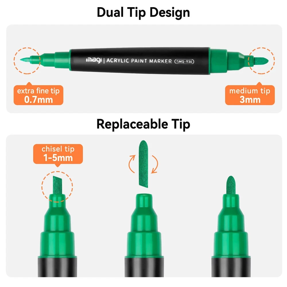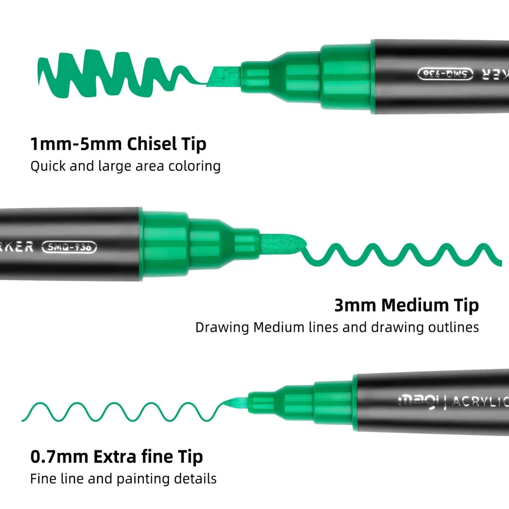 【Double Tipped】: fine point paint pens and acrylic paint pens bold tip. The size is 0.77mm fine tip, 3mm broad bullet point tip, 1-5mm chisel tip 【Features】: vibrant colors and long-lasting , quick dry, water-based and opaque ink, waterproof and permanent paint pens, never fade and never abrasion. 【Suitable Users】: paint pens perfect for artists, art students, children, teens and adults to use on arts and crafts projects .arts and crafts supplies 【Multi-Purpose】: Creating art projects on a variety of surfaces like Rock painting, ceramic and mug painting, glass and wine glass painting, wood, fabric, stone, metal, plastic, canvas, Christmas ornament, Halloween pumpkin painting, custom mugs, tire, porcelain, wood signs, wood ornaments, plastic surfaces, metal surfaces, automotive, car, graffiti 【Gifts】: Suitable for people who wanna give creative and unique gifts. Ideal choice for DIY holiday ornaments project supplies like Christmas crafts for kids or adults, Halloween pumpkin, Birthday, Children’s Day, Easter, Valentine's Day,Thanksgiving Day, Party, New Year's gift