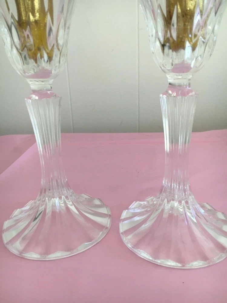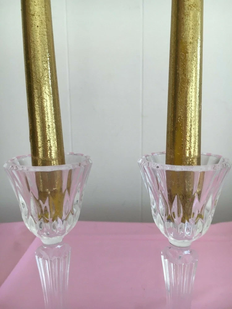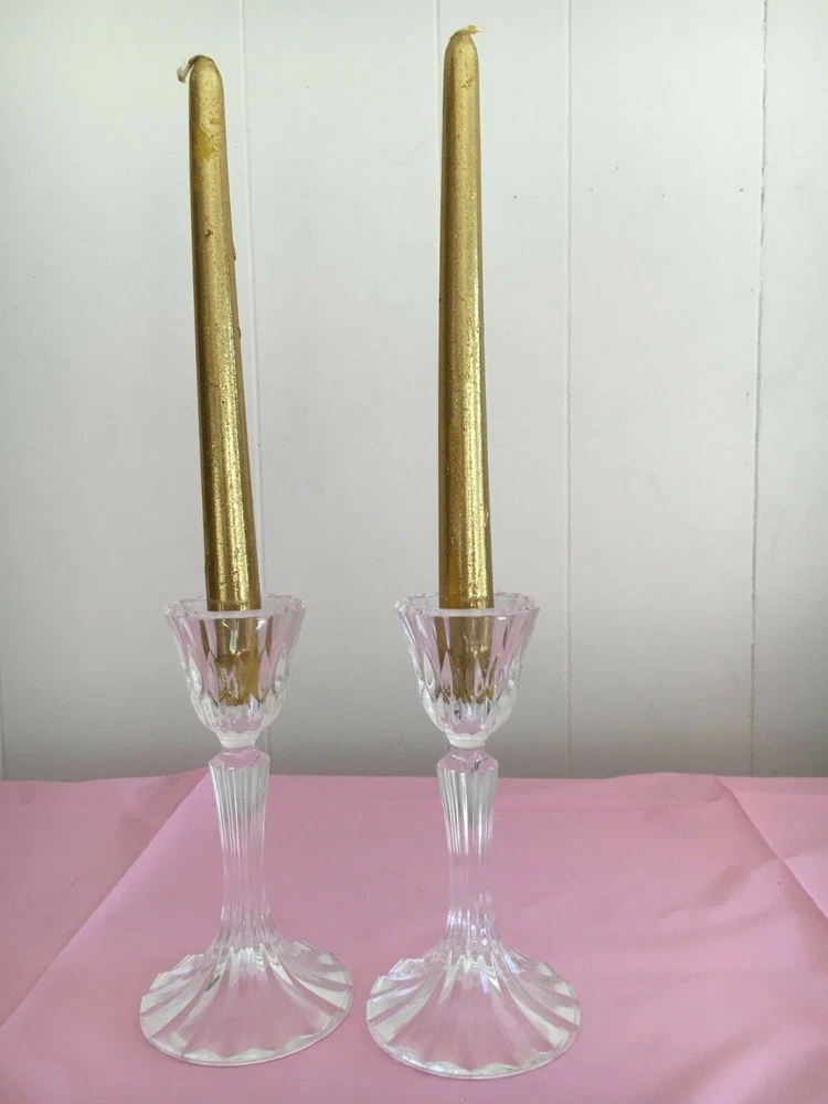 Set of 2 24 count lead crystal round candlesticks. Condition is New but no box. Detailed etching with round bottom. Splendid show piece for all occasions. They are a dramatic addition to any table setting. Measurements: 7 inches in height, 3.5 inches in width.