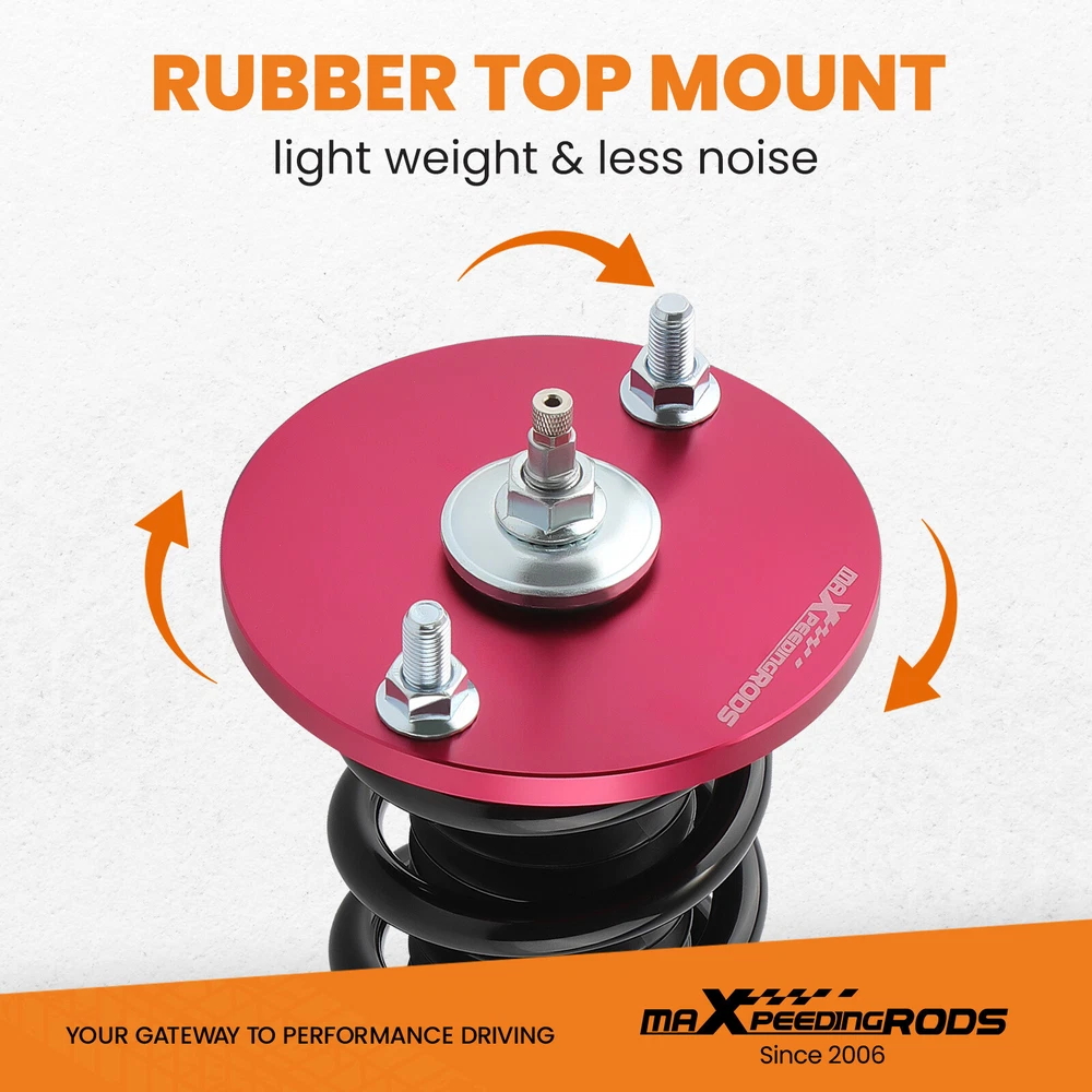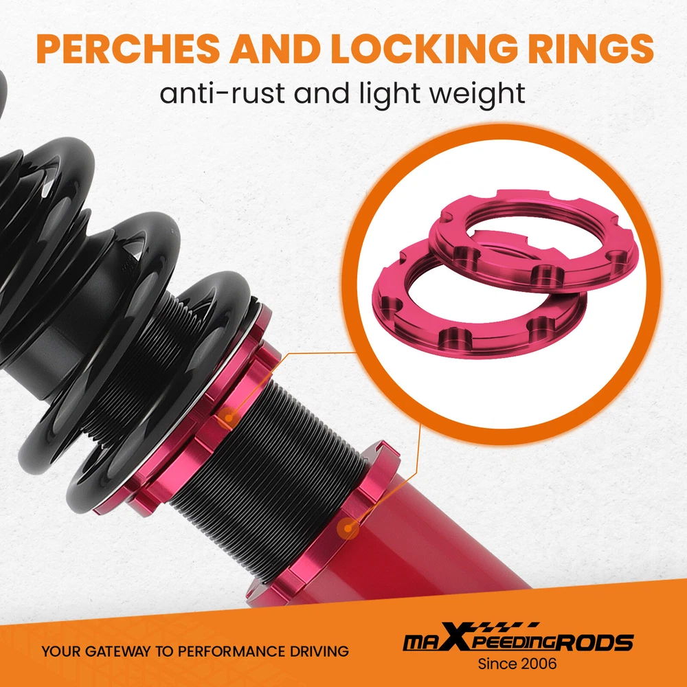 maXpeedingrods Canada Store Home About maXpeedingrods View Feedback Contact Us WHY CHOOSE US 24 Damping Levels Coilover Coilovers For Honda Accord DX/EX/LX CD5 CD7 1990-1997 Description Introduction MXR-SLC based on MXR-SNA coilovers, which is also height adjustable but adds damping adjustment ability by a knob the top of the shaft. They are also made for street use, but the 24 level rebound damping control allows you the ability to perfectly dial in your coilover setup. You will experience better ride quality in all road conditions. Application For Honda Accord DX/EX/LX 1990-1997, Chassis Code: CB7/CD5/CD7 For Honda Acura CL 1997-1999, Chassis Code: YA1 Notice: The coilovers kit will "Lower your car" and does not keep to the original ride height. Specification Front and Rear top mount: Rubber Damping: 24 levels rebound damping adjustable Spring rate Front: 10 kg/mm (560 lbs/in) Spring rate Rear: 7 kg/mm (392 lbs/in) Spring length Front: 200mm Spring length Rear: 200mm Adjustable height: lowering 1-3 inch Coilover overall length Front: 450mm-490mm Coilover overall length Rear: 525mm-620mm Shock type: Twin tube Spring Preload: 7-10 mm Color: Red body with black spring Package included Complete coilovers assembly 2 front and 2 rear A pair wrench for height adjustment Dimension Package dimension : 64*52*21 Weight: 23260g Features 1. Lowered height adjustment from 1" - 3" which allow lower center of gravity and also add a more aggressive stance 2. A 24 rebound damping adjustment level allows you the ability to perfectly dial in your coilover setup. You will experience better ride quality in all road conditions. 3. Rubber top mounts help to deliver a smooth and forgiving ride for city use at any speed and rubber joints assist in absorbing hard impacts. 4. Twin-Tube structure allows sufficient stroke within the shock absorber. 5. Complete Suspension Kit of 4 Shock Absorbers & 4 Springs for an easy installation. 6. Separate height adjustment does not affect damper stroke. 7. Height can be adjusted with coilovers installed on the vehicle. 8. High Tensile performance spring - STRESS TESTED OVER 600,000 times while the spring distortion is less than 0.04%. Plus the special surface treatment improves the durability and performance. 9. Height Adjustment tools included. 10. Most pieces in our coilover systems, including mounts, collars and spring perches, are designed from 6061-T6 Billet Aluminum resulting in lightweight, durable and rust resistant components. 11. Steel shock bodies with special surface treatment to improve the durability. 12. Full rebuildable. Notice - Hi-performance aftermarket parts; professional installation is suggested. - Please check our store for other auto parts you may be interested in. Other items you might also like Coilovers Coil Spring Shock Strusts For Mitsubishi Lancer (CX/CY) 2008-2016 24 Ways Adjustable Damper Coilovers For Lexus IS300 IS200 JCE10L GXE10 1999-2005 Street Coilovers Suspension For Nissan S13 Silvia 240SX 200SX 180SX 1989-1998 24 Ways Adjustable Damper Coilover For Honda Civic EJ EK EM 96-00 Acura Integra 24 Damping Level Coilover For Honda Civic 4-door Sedan FA1 FA2 FA3 FA4 FA5 06-11 Coilover Lowering Kit For BMW 3 E90 E91 RWD 330i 318i 320i 323i 325i 328i 04-11 maXpeedingrods T6 Adjustable Damper Coilover For Jaguar XJ8 XJR X358 2007-2009 Coilover Suspension Kit For Honda Civic VIII 2-door coupe Si FG1 FG2 2006-2011 Coilover Spring & Shock For Honda Accord CG2 CG3 1998-2002 Acura TL CL 99-03 Coilovers Suspension Kit For Ford Ford Mustang S-197 2005-2014 Spring & Shock Street Coilovers Suspension For Hyundai Genesis Coupe 2010-2016 2-Door ONLY maXpeedingrods T6 Adjustable Damper Coilover For MINI Clubman R55 Cooper 07–14 About MaXpeedingrods Shipping Policy Returns Policy