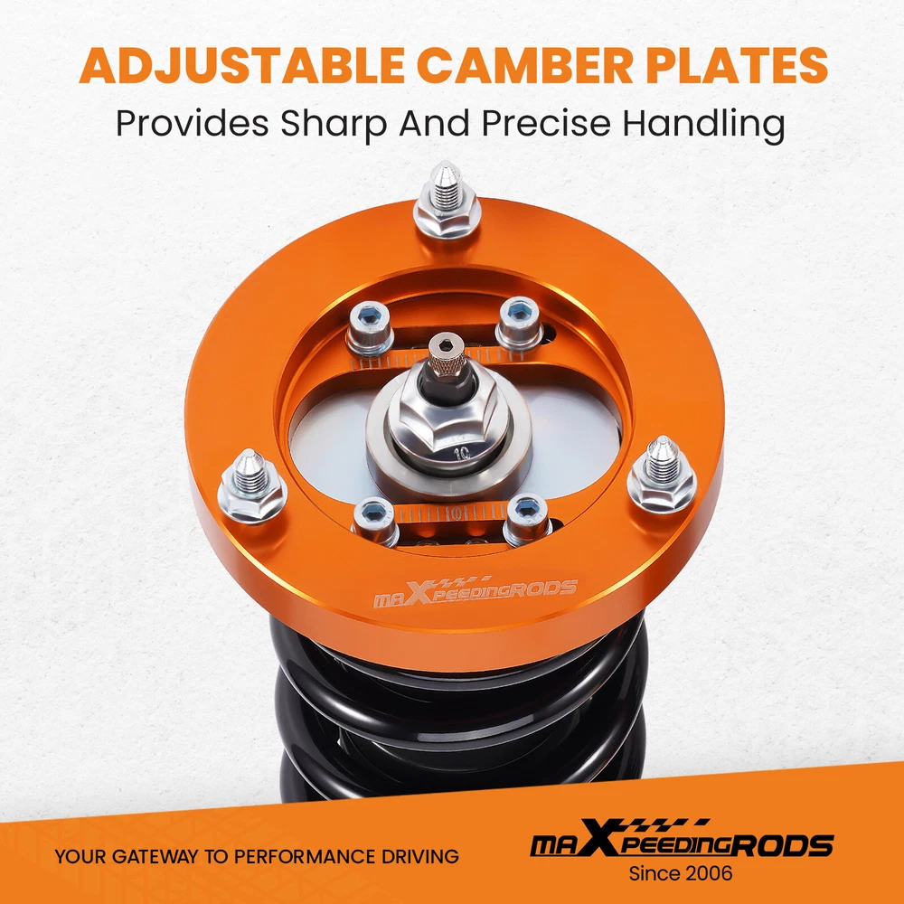 maXpeedingrods Canada Store Home About maXpeedingrods View Feedback Contact Us WHY CHOOSE US 24 Damping Levels Coilover For BMW 3 Series Convertible E93 318i 320i 2006-2013 Description Introduction MXR-SLC based on MXR-SNA coilovers, which is also height adjustable but adds damping adjustment ability by a knob the top of the shaft. They are also made for street use, but the 24-level rebound damping control allows you the ability to perfectly dial in your coilover setup. You will experience better ride quality in all road conditions. Application This product fit RWD vehicle only, not for the M3 model. For BMW 3 Coupe (E92) (2005-2013) 316i, 318i, 320i,323i,325i,328i,330i,335i,320d,325d,330d, 335d For BMW 3 Convertible (E93) (2006-2013) 318i, 320i, 323i, 325i, 330i, 335i, 320d, 330d, 325d. Note: We suggest adding washers to avoid the engine bar and drilling the front OE shock top mount upper part a little bigger to a diameter of 12mm. Specification Front Top mounts: Pillow ball top mount with camber plate Rear Top mounts: OE top mounts required Damping: 24 levels rebound damping adjustable Spring rate Front: 6 kg/mm (356 lbs/in) Spring rate Rear: 10kg/mm (560 lbs/in) Spring length Front: 180mm Spring length Rear: 230mm Adjustable height: lowering 1-3inch Coilover overall length Front: 540mm-640mm Coilover overall length Rear: 550mm-660mm Shock type: Twin tube Spring Preload: 7-10 mm Color: Gold Package included 2x Front coil-overs 2x Rear coil-overs 2x Sway bar end links 2x C spanners Dimension Weight: 26600g Size: 63*51*21 cm Feature 1. Lowered height adjustment from 1" - 3" which allow lower center of gravity and also add a more aggressive stance 2. A 24 rebound damping adjustment level allows you the ability to perfectly dial in your coilover setup. You will experience better ride quality in all road conditions. 3. Twin-Tube structure allows sufficient stroke within the shock absorber. 4. Separate height adjustment does not affect damper stroke. 5. High Tensile performance spring - STRESS TESTED OVER 600,000 times while the spring distortion is less than 0.04%. Plus, the special surface treatment improves the durability and performance. 6. Height Adjustment tools included. 7. Camber plate top mounts help to eliminate the need for a separate camber kit. 8. Pillow ball top mount - It improves the steering feel and response. 9. Most pieces in our coilover systems, including mounts, collars and spring perches, are designed from 6061-T6 Billet Aluminum resulting in lightweight, durable and rust resistant components. 10. Full rebuildable. Notice * Professional installation & alignment suggested. * Please check our store for other auto parts you may be interested in. Other items you might also like Coilovers Coil Spring Shock Strusts For Mitsubishi Lancer (CX/CY) 2008-2016 24 Ways Adjustable Damper Coilovers For Lexus IS300 IS200 JCE10L GXE10 1999-2005 Street Coilovers Suspension For Nissan S13 Silvia 240SX 200SX 180SX 1989-1998 24 Damping Level Coilover For Honda Civic 4-door Sedan FA1 FA2 FA3 FA4 FA5 06-11 24 Ways Adjustable Damper Coilover For Honda Civic EJ EK EM 96-00 Acura Integra maXpeedingrods T6 Adjustable Damper Coilover For Jaguar XJ8 XJR X358 2007-2009 Coilover Spring & Shock For Honda Accord CG2 CG3 1998-2002 Acura TL CL 99-03 Coilovers Suspension Kit For Ford Ford Mustang S-197 2005-2014 Spring & Shock Street Coilovers Suspension For Hyundai Genesis Coupe 2010-2016 2-Door ONLY maXpeedingrods T6 Adjustable Damper Coilover For MINI Clubman R55 Cooper 07–14 Coilover Lowering Kit For BMW 3 E90 E91 RWD 330i 318i 320i 323i 325i 328i 04-11 Coilover Suspension Kit For Honda Civic VIII 2-door coupe Si FG1 FG2 2006-2011 About MaXpeedingrods Shipping Policy Returns Policy