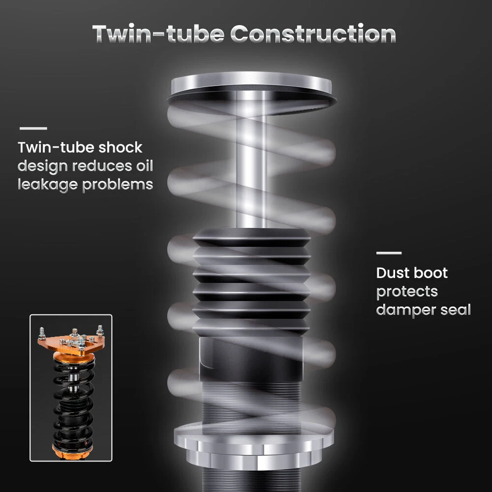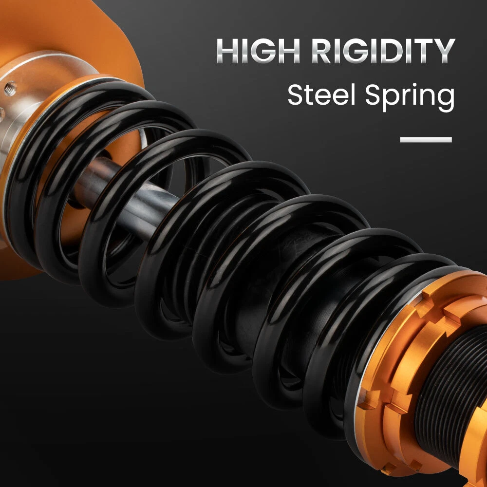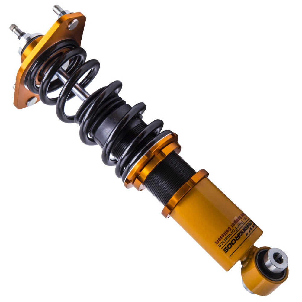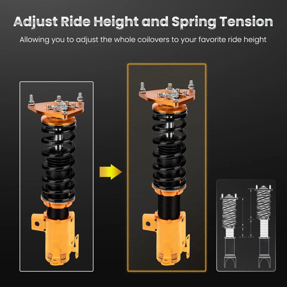 maXpeedingrods Canada Store Home About maXpeedingrods View Feedback Contact Us WHY CHOOSE US 24 Damping Levels Coilover For Subaru BRZ 2012-2020 Toyota 86 2012-2020 Scion Description Introduction MXR-SLC based on MXR-SNA coilovers, which is also height adjustable but adds damping adjustment ability by a knob the top of the shaft. They are also made for street use, but the 24 level rebound damping control allows you the ability to perfectly dial in your coilover setup. You will experience better ride quality in all road conditions. Applications For Subaru BRZ First generation (ZN6/ZC6) 2012-2020 For Scion FR-S 2012-2020 For Toyota 86 2012-2020 Specifications Top mounts: Front camber plate with pillow ball Damping: 24 clicks rebound damping adjustable Shock type: Twin tube Adjustable height: Yes, lowering 1'' to 3'' Adjustable camber plate: Yes Spring preload: 7-10 mm Spring rate Front: 6 kg/mm (336 lbs/in) Spring rate Rear: 5 kg/mm (280 lbs/in) Color: Golden Package included Complete coilovers 2 front and 2 rear as shown in the picture Dimension Size: 63*51*21 cm Weight: 21.24 kg Features 1. Quickly Install---Preload parameter is provided to save your 3-4 hours installation time. 2. Lowered height adjustment from 1" - 3" which allow lower center of gravity and also add a more aggressive stance. 3. A 24 rebound damping adjustment level allows you the ability to perfectly dial in your coilover setup. You will experience better ride quality in all road conditions. 4. Twin-Tube structure allows sufficient stroke within the shock absorber. 5. Pillow ball top mount - It improves the steering feel and response. 6. Rubber top mounts help to deliver a smooth and forgiving ride for city use at any speed and rubber joints assist in absorbing hard impacts. 7. Complete Suspension Kit of 4 Shock Absorbers & 4 Springs for an easy installation. 8. Separate height adjustment does not affect damper stroke. 9. Height can be adjusted with coilovers installed on the vehicle. 10. High Tensile performance spring - STRESS TESTED OVER 600,000 times while the spring distortion is less than 0.04%. Plus the special surface treatment improves the durability and performance. 11. Height Adjustment tools included. 12. Full rebuildable. Notice * Professional installation & alignment suggested. * Please check our store for other auto parts you may be interested in. Other items you might also like Coilovers Coil Spring Shock Strusts For Mitsubishi Lancer (CX/CY) 2008-2016 24 Ways Adjustable Damper Coilovers For Lexus IS300 IS200 JCE10L GXE10 1999-2005 Street Coilovers Suspension For Nissan S13 Silvia 240SX 200SX 180SX 1989-1998 24 Damping Level Coilover For Honda Civic 4-door Sedan FA1 FA2 FA3 FA4 FA5 06-11 24 Ways Adjustable Damper Coilover For Honda Civic EJ EK EM 96-00 Acura Integra Pair Front Coilover Shock For Nissan S13 Silvia 180SX 200SX 240SX 1989-1994 Coilover Lowering Kit For Mazdaspeed 3 Mazda 3 BK 2004-2009 Mazda 3 BL 2009-2013 Coilover Spring & Shock For Honda Accord CG2 CG3 1998-2002 Acura TL CL 99-03 Coilovers Kit Coil Spring Struts For Mitsubishi Lancer CX/CY 2008-2016 Outlancer 24 Ways Adjustable Damper Coilover For Toyota Corolla E140 E160 E170 2014-2019 Coilover Lowering Kit For Toyota Celica 2000-2006 GT GTS ZZT230 1.8 VVTL-i 190 2 Pcs Rear Active to Passive Shocks Conversion Kit for Cadillac SRX 2004 - 2009 About MaXpeedingrods Shipping Policy Returns Policy