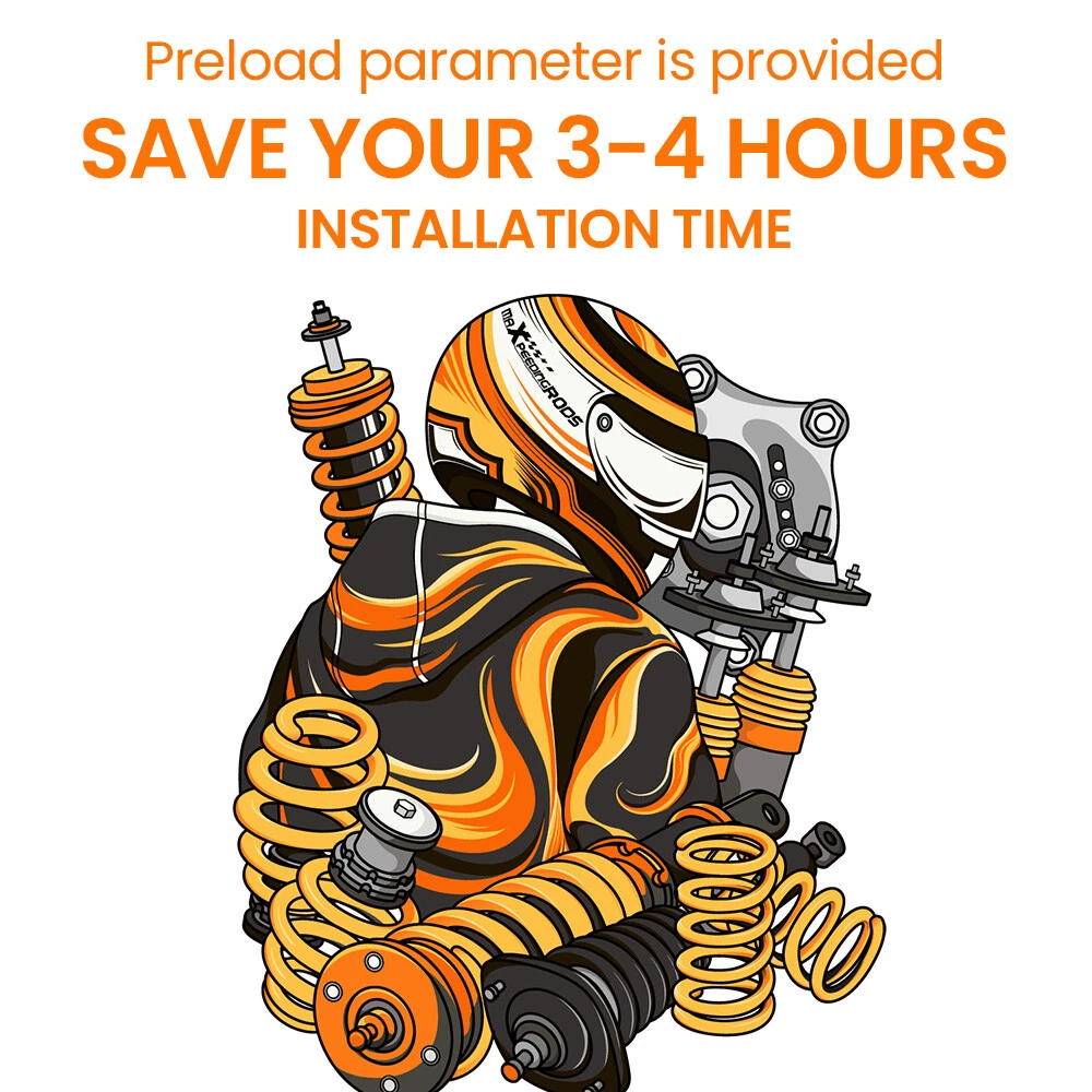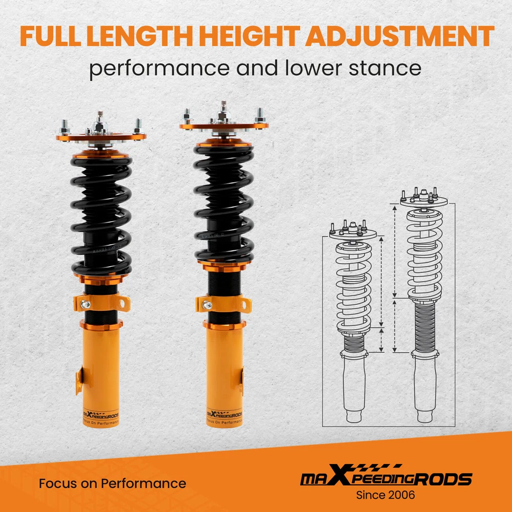 maXpeedingrods Canada Store Home About maXpeedingrods View Feedback Contact Us WHY CHOOSE US 24 Damping Levels Coilover For Toyota Corolla 9th Gen E130 _E12_ 2003-2008 Description Introduction MXR-SLC based on MXR-SNA coilovers, which is also height adjustable but adds damping adjustment ability by a knob the top of the shaft. They are also made for street use, but the 24 level rebound damping control allows you the ability to perfectly dial in your coilover setup. You will experience better ride quality in all road conditions. Application For Toyota Corolla 9th Gen. (E130) 2003-2008 USA For Toyota Corolla 9th Gen (_E12_) (01/2001-12/2007) other markets For Toyota Matrix XRS (E130) 2003-2008 Note: Please note this item does not fit for Corolla E150 "Ascent" model .Only fit Corolla Matrix E130 2003-2008 Specifications Top mount: Front camber plate; Rear rubber Damping: 24 levels rebound damping adjustable Front spring rate:12kg/mm (672 lbs/in) Rear spring rate:8 kg/mm (448 lbs/in) Adjustable height: Yes lowering 1" to 3" Spring Preload: 7-10 mm Shock type:Twin tube Color: Gold body with black spring Package included Complete coilovers assembly 2 front and 2 rear A pair wrench for height adjustment Dimension Package dimension : 62*52*22 Weight: 22500g Features 1. Quickly Install: Preload parameter is provided to save your 3-4 hours installation time. 2. Lowered height adjustment from 1" - 3" which allow lower center of gravity and also add a more aggressive stance. 3. A 24 rebound damping adjustment level allows you the ability to perfectly dial in your coilover setup. You will experience better ride quality in all road conditions. 4.Camber plate top mounts help to eliminate the need for a separate camber kit. 5.Twin-Tube structure allows sufficient stroke within the shock absorber. 6.Complete Suspension Kit of 4 Shock Absorbers & 4 Springs for an easy installation. 7.Separate height adjustment does not affect damper stroke and height can be adjusted with coilovers installed on the vehicle. 8.High Tensile performance spring - STRESS TESTED OVER 600,000 times while the spring distortion is less than 0.04%. Plus the special surface treatment improves the durability and performance. 9.Most pieces in our coilover systems, including mounts, collars and spring perches, are designed from 6061-T6 Billet Aluminum resulting in lightweight, durable and rust resistant components. 10.Steel shock bodies with special surface treatment to improve the durability. 11. Full rebuildable Notice * Professional installation & alignment suggested. * Please check our store for other auto parts you may be interested in. Other items you might also like Coilovers Coil Spring Shock Strusts For Mitsubishi Lancer (CX/CY) 2008-2016 24 Ways Adjustable Damper Coilovers For Lexus IS300 IS200 JCE10L GXE10 1999-2005 Street Coilovers Suspension For Nissan S13 Silvia 240SX 200SX 180SX 1989-1998 24 Damping Level Coilover For Honda Civic 4-door Sedan FA1 FA2 FA3 FA4 FA5 06-11 24 Ways Adjustable Damper Coilover For Honda Civic EJ EK EM 96-00 Acura Integra Pair Front Coilover Shock For Nissan S13 Silvia 180SX 200SX 240SX 1989-1994 Coilover Lowering Kit For Toyota Celica 2000-2006 GT GTS ZZT230 1.8 VVTL-i 190 Coilovers Kit Coil Spring Struts For Mitsubishi Lancer CX/CY 2008-2016 Outlancer 24 Ways Adjustable Damper Coilover For Toyota Corolla E140 E160 E170 2014-2019 2 Pcs Rear Active to Passive Shocks Conversion Kit for Cadillac SRX 2004 - 2009 Height Adjustable Coilover Lowering Kit For BMW 3 Series E90 E91 E92 E93 05-13 maXpeedingrods T6 Adjustable Damper Coilover For Jaguar XJ8 XJR X358 2007-2009 About MaXpeedingrods Shipping Policy Returns Policy