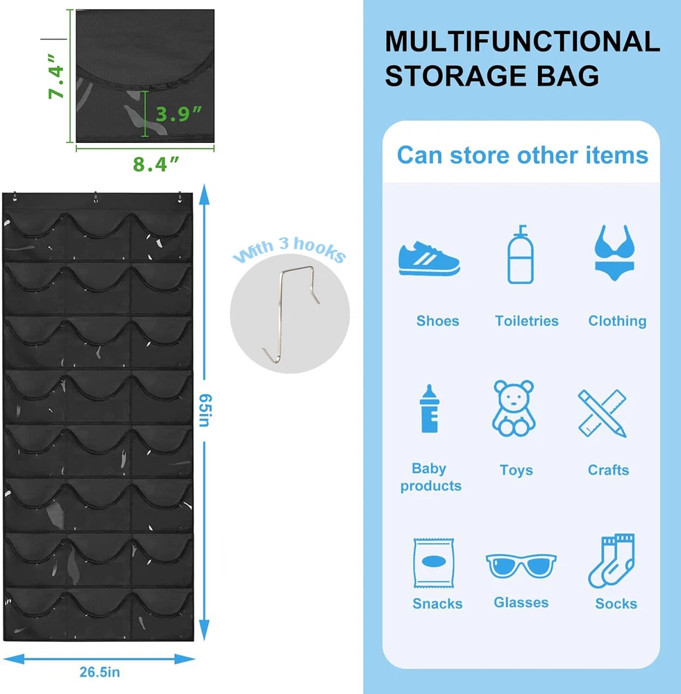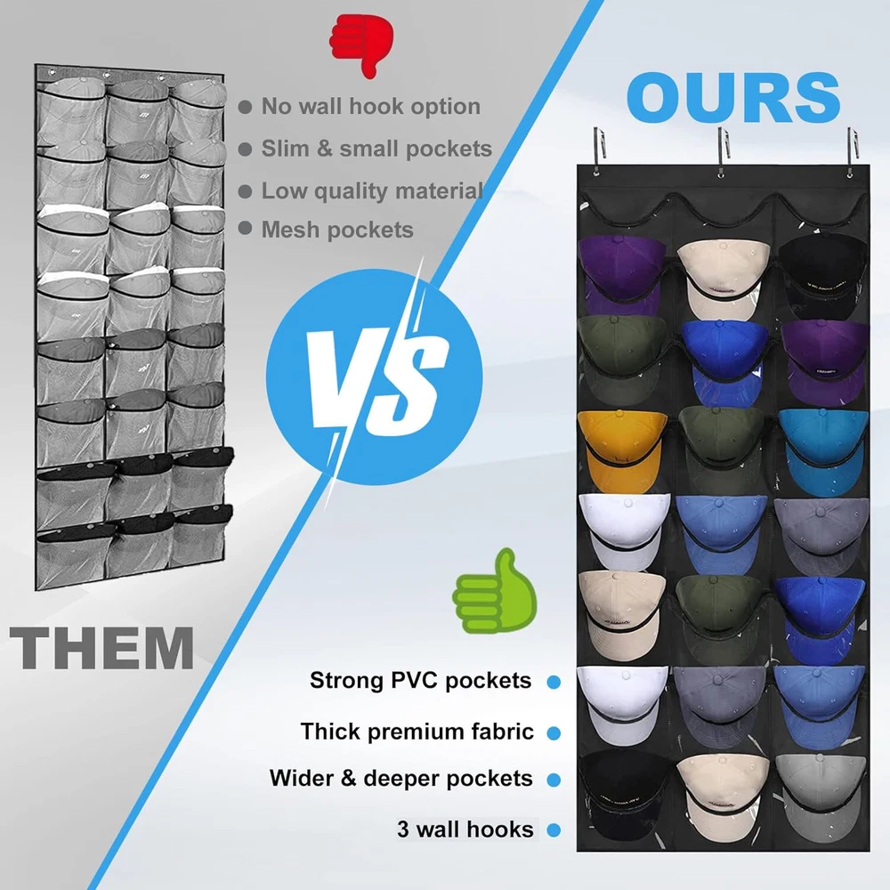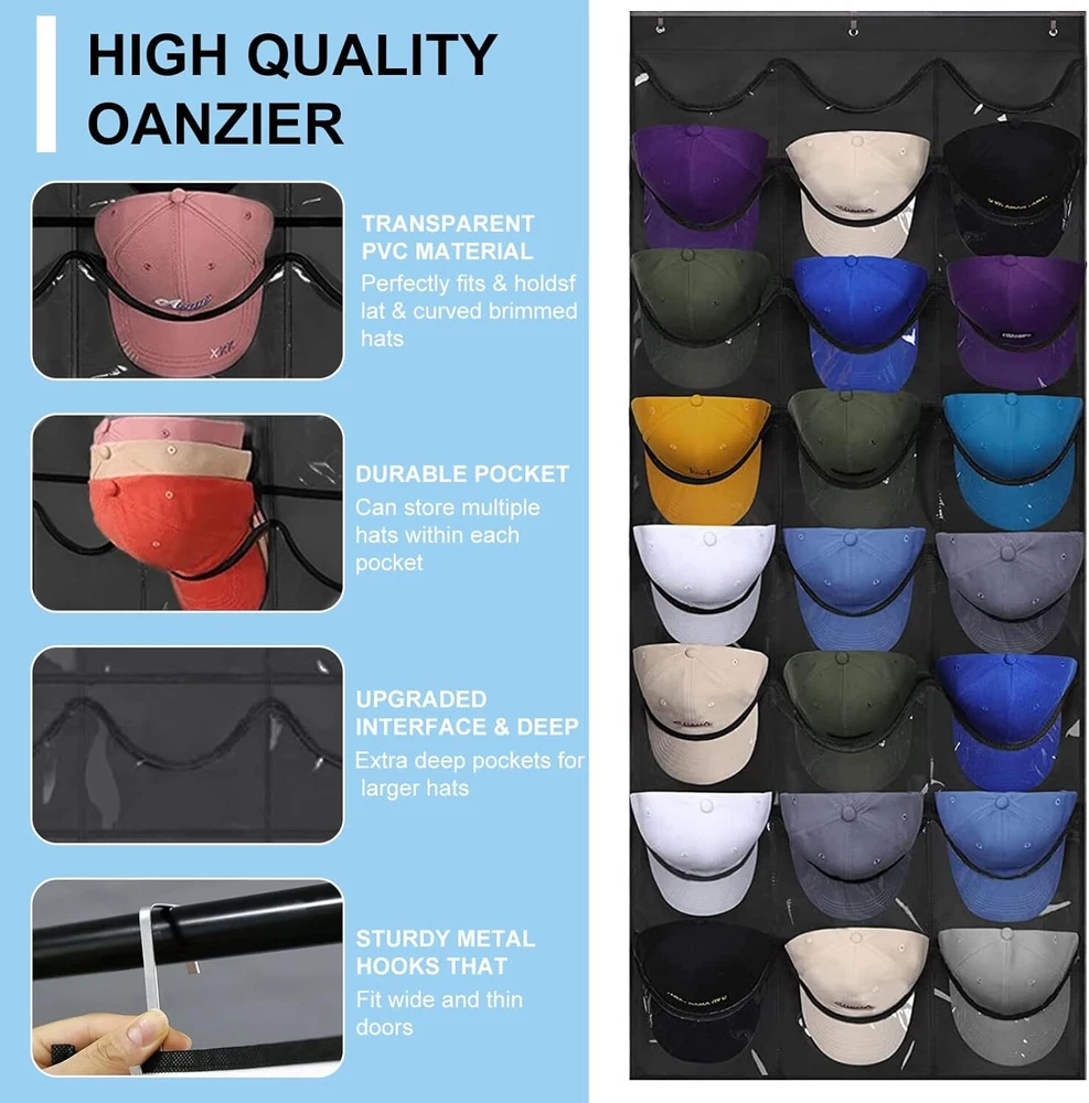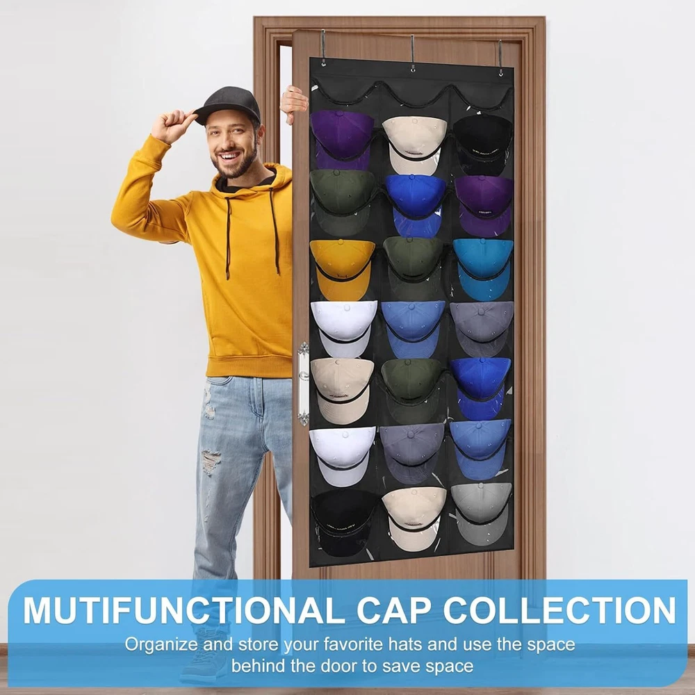 Space-Saving Helper For Your Home Troubled by the messy hat piled up on the ground or sofa? Hard to find the hat you need to match every time I go out? Look for a best way to Improve Home utilization & perfectly show off your hat collection with confidence? Rouceyxin hanging hat storage organizer over the door with 24 clear pockets would help you solve all issue! 24 PVC Clear Pockets Hat Holder for Door Closet Wall PRODUCT DETAILS Overall Size ( Baseball Cap Organizer): 65”L × 26.5” W 1 pack Hat Holder for Baseball Caps Organizers With 24 pocket 3 high-grade metal hooks.. Install in Seconds! Quick and easy installation NO tools or special skills needed. Just hang it on the door and you'll have instant storage space for your hats! Multiple Purpose The hat holder organizer for door or wall is not only a better organization of baseball caps, but also a good storage for toys, purses, snacks, socks, scarves, gloves and any other household items as you wish.
