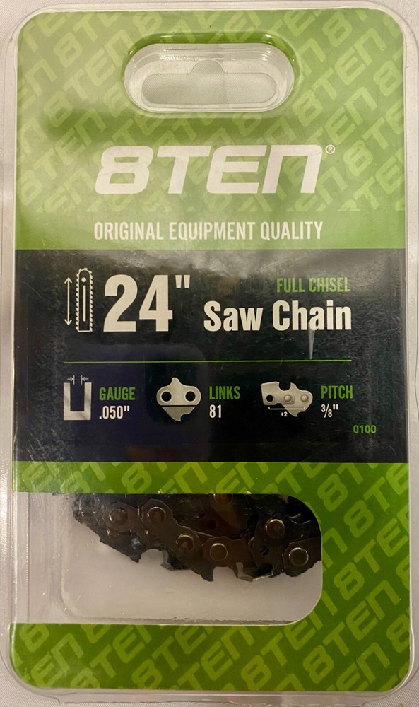 Tracking Number is provided for all listings! -- All items will be shipped out within 0-1 days after purchase! Feel free to ask us any questions you may have for our listings! -- 8Ten~ Full Chisel Saw Chain, 24", 81 Links, 2 Chains, NEW! Both Chains Are New, One New In Package One Without Package MPN: 810-CCC2322H UPC: 803467138657 Chain Gauge: .050 Inch Chain Length: 24 Inch UL Certification: No Chain Drive Links: 81 Chain Type: Full Chisel Chain Pitch: 3/8" / 0.375 Inch Material: Chain Material: 68CrNiMo33 Steel; Rivet Material: GCr15 Steel Brand Type Model Echo Chainsaw CS-590 Echo Chainsaw CS-600P Echo Chainsaw CS-620P Echo Chainsaw CS-620PW Echo Chainsaw CS-680 Echo Chainsaw CS-8000 Echo Chainsaw CS-800P Homelite Chainsaw 330 Homelite Chainsaw 35 SL Homelite Chainsaw 350 Brand Type Model Homelite Chainsaw 350 HG Homelite Chainsaw 350 SL Homelite Chainsaw 360 Homelite Chainsaw 410 Homelite Chainsaw 450 Homelite Chainsaw 460 Homelite Chainsaw 540 Homelite Chainsaw 550 Homelite Chainsaw 650 Homelite Chainsaw 700 G Brand Type Model Homelite Chainsaw 750 Homelite Chainsaw 825 Homelite Chainsaw Super XL 925 Homelite Chainsaw Super XL AO Homelite Chainsaw Super XL Homelite Chainsaw V 955 Homelite Chainsaw XL 12 Homelite Chainsaw XL 15 Homelite Chainsaw XL 400 Homelite Chainsaw XL 700 Brand Type Model Homelite Chainsaw XL 800 Homelite Chainsaw XL 850 Homelite Chainsaw XL 900 Homelite Chainsaw XL 922 Homelite Chainsaw XL 923 Tanaka Chainsaw ECS-505 Tanaka Chainsaw ECS-506 Tanaka Chainsaw ECS-650 Tanaka Chainsaw ECS-655