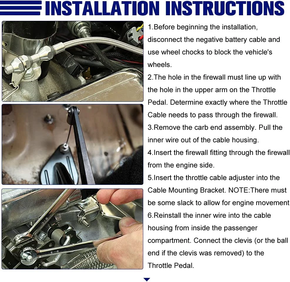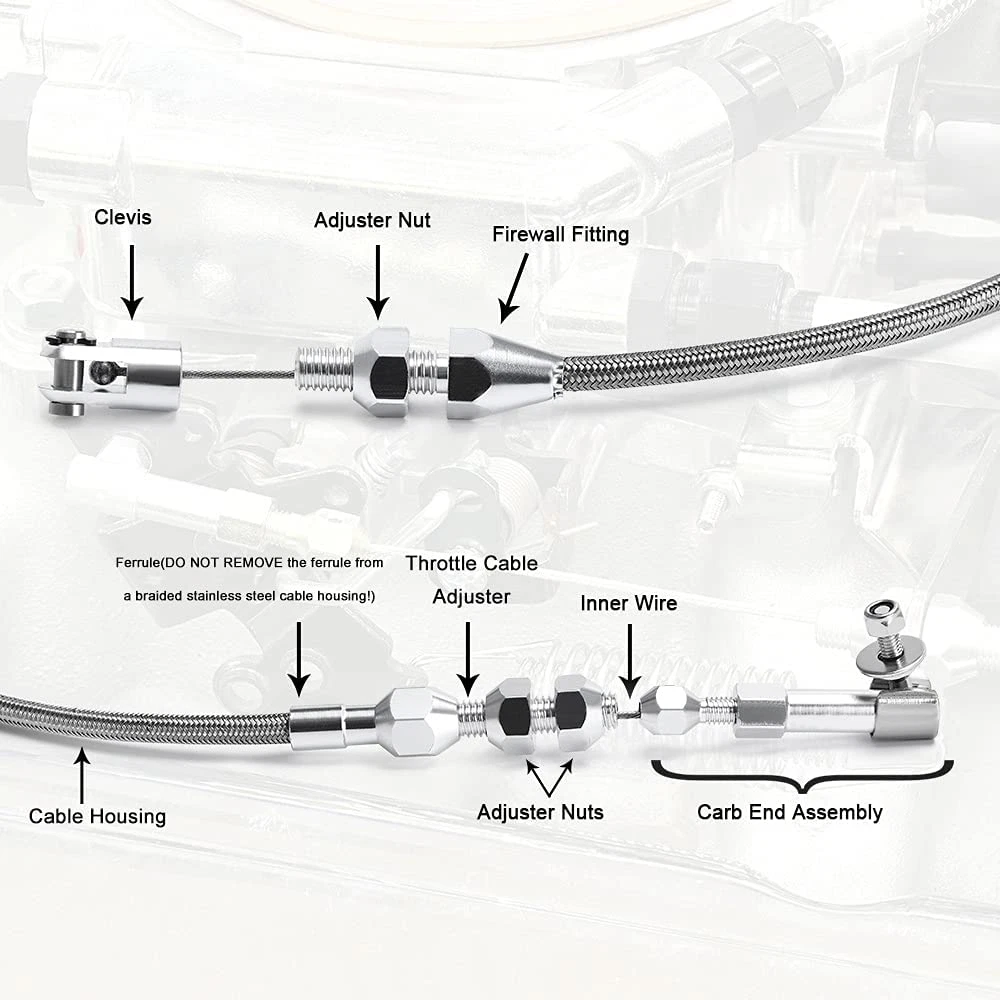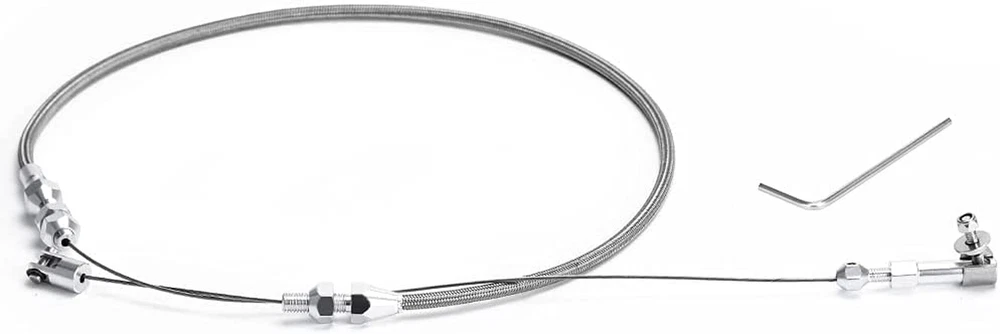 The braided throttle cable is universal to use, can be cut to fit any application.(you need additional parts to make it fit at some situation) The PQY throttle cable is made of high quality stainless steel,equipped with aluminum fittings and aluminum ferrules to eliminate fraying. has the U-cut-to-fit outer housing, is available in 24 or 36 inch lengths with a u-cut-to-fit stainless inner wire. The throttle cable is designed without cotter pins or set screws and adapt to factory and aftermarket pedals for an easy installation. Package include 1pcs 24 inch throttle cable and 1pcs allen wrench. Product Description Installation Tips: 1. Before beginning the installation, disconnect the negative battery cable and use wheel chocks to block the vehicle's wheels. 2. The hole in the firewall must line up with the hole in the upper arm on the Throttle Pedal. Determine exactly where the Throttle Cable needs to pass through the firewall. 3. Remove the carb end assembly. Pull the inner wire out of the cable housing,insert the firewall fitting through the firewall from the engine side. 4. Insert the throttle cable adjuster into the Cable Mounting Bracket. NOTE:There must be some slack to allow for engine movement. 5. Reinstall the inner wire into the cable housing from inside the passenger compartment. Connect the clevis (or the ball end if the clevis was removed) to the Throttle Pedal. 6. Attach the carb end assembly to the throttle arm. Tighten the nut. 7. Cut the inner wire off so that roughly 1" of the inner wire will remain inside the carb end assembly. 8. Insert the inner wire into the carb end assembly. Pull all the slack out of the inner wire and tighten the set screw in the carb end assembly. 9. Check for proper operation of the throttle (and Kickdown if equipped) and adjust as necessary. Make sure there is no binding in the throttle linkage and that the throttle returns to the closed position when the pedal is released.