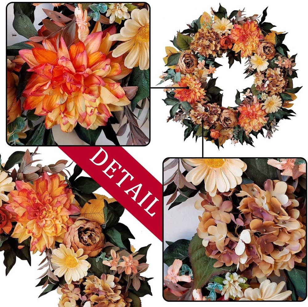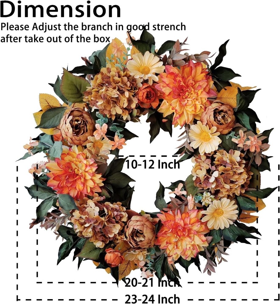 24 Inch Fall Wreath for Front Door with Vintage Hydrangea&Orange Peony and Dahlia Flowers-Fall Decoration for Home-Large Fall Decor Door Wreath for Autumn,Harvest or Thanksgiving ①【Size】24 Inch/61cm,please pay attetion how we measure the size ②【Material】Silk fall Hydrangea&Peony with vintage orange colors and yellow Dahlia Flowers,green to yellow leaves for fall decoration ③【Twig Base】The fall wreath is made of natural twig base for fall decoration ④【Decorative Wreath】Suitable to use for front door, window, fireplace, wall, porch,indoor or outdoor,fall decorations for home ⑤【Giftable】Delivered with a premium brown box,this fall wreath is ready for a sweet gifts for your family or friends 24 Inch Hydrangea Fall Wreath 24 Inch Fall Wreath for Front Door with Vintage Hydrangea&Orange Peony and Dahlia Flowers-Fall Decoration for Home