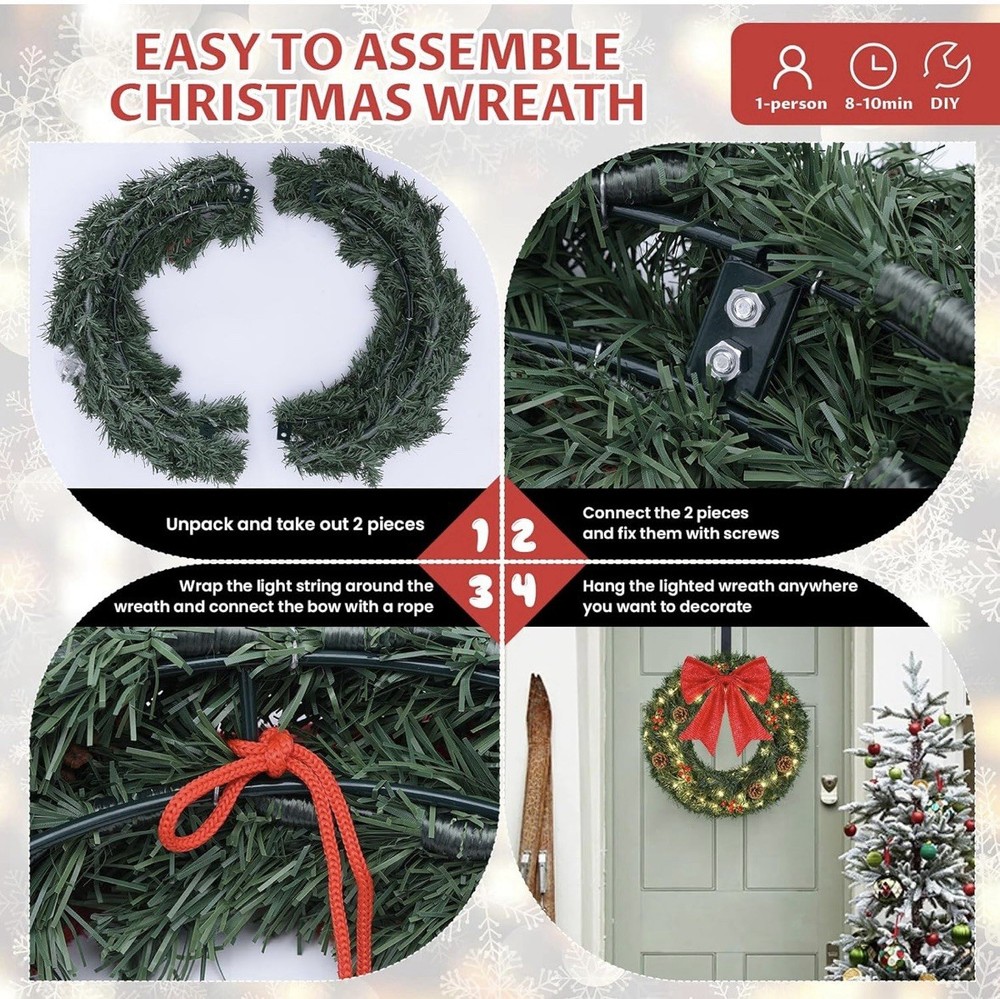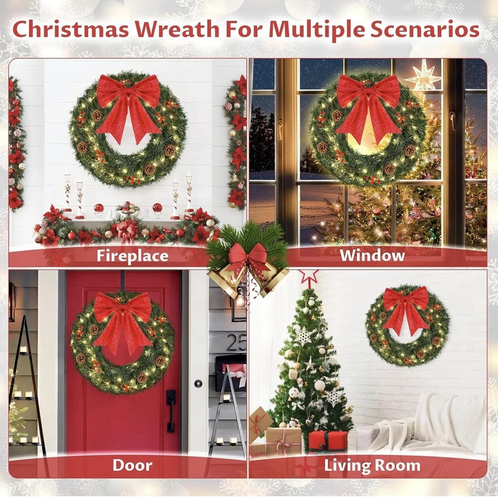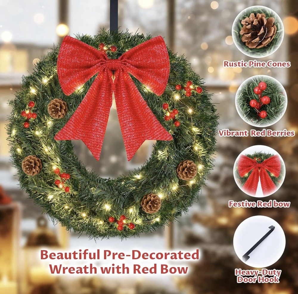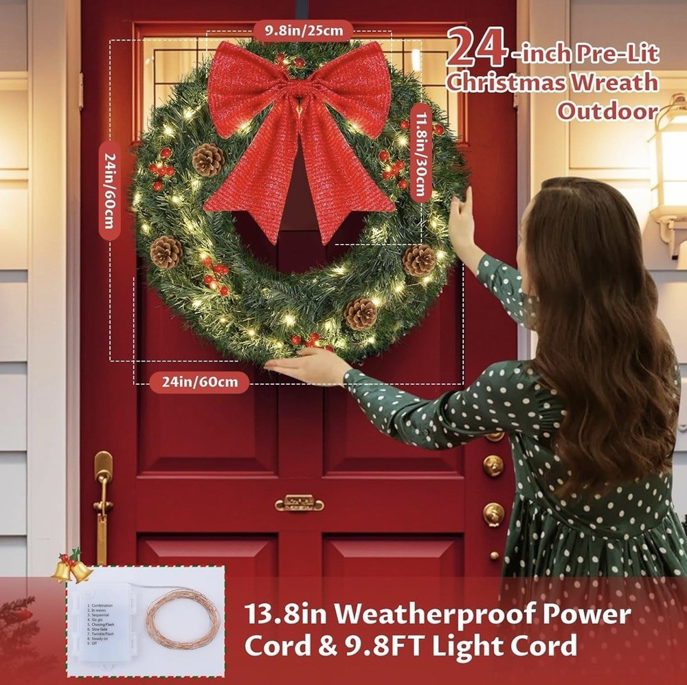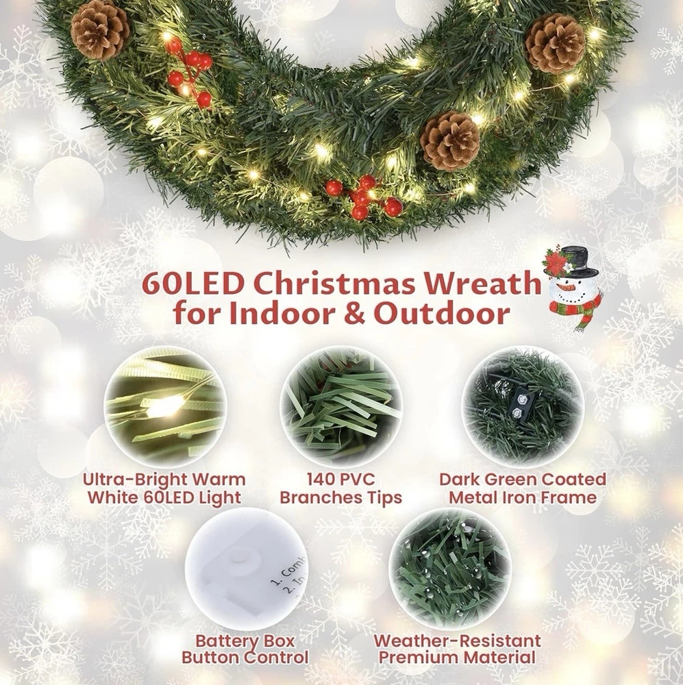 Add a festive touch to your home with this 24" Green Light up Christmas Wreath. It's adorned with warm white and colorful LED lights that create a charming and romantic atmosphere. The wreath comes with a convenient timer, ensuring that the lights turn on and off automatically, day and night. Crafted from durable plastic, this artificial wreath is designed to last for seasons to come. It features a delightful pug in a Christmas wreath style, complete with a bow, hanger, and pinecones for a natural look. Perfect for decorating your door or any space in need of a bit of holiday cheer. Item is New in Box. Box was opened to assure all pieces there. Small damage to box but does not affect wreath! See pics!
