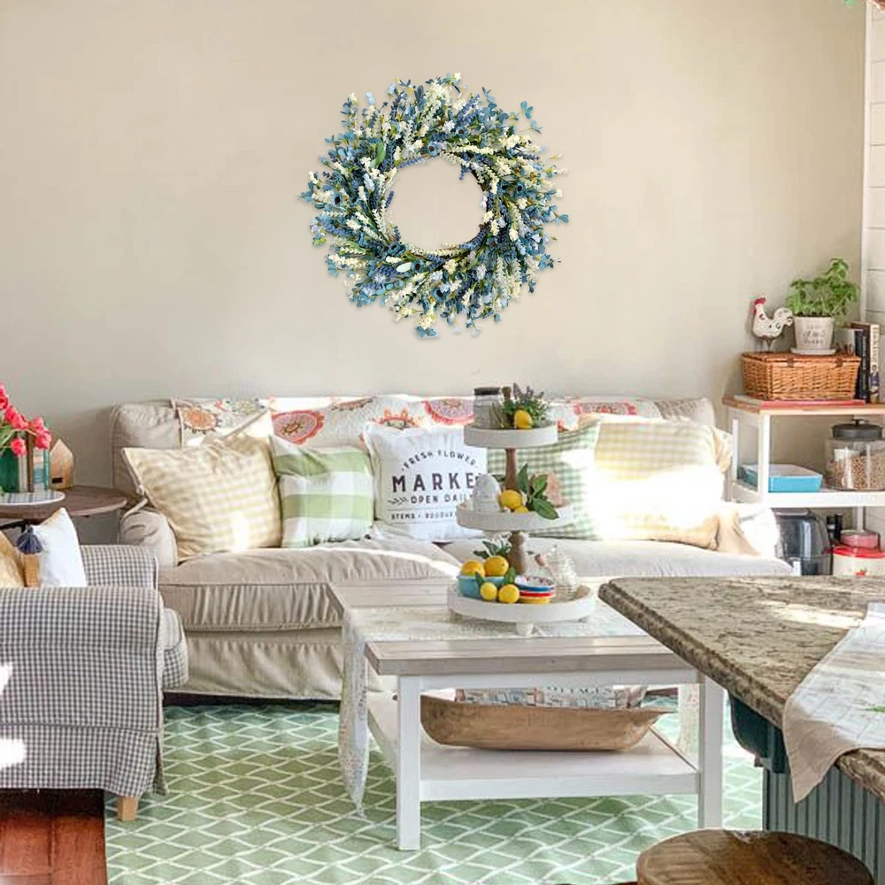 [Blue Flower Wreath For Front Door] Light blue wild flowers matches Lavender flowers and ivory flowers, kinds of flowers mix together makes the wreath thick and large, extra soft touching little leaves give the wreath additional lovely elements, and the whole wreath is life looking. [Blue Flower Wreath For Front Door] Light blue wild flowers matches Lavender flowers and ivory flowers, kinds of flowers mix together makes the wreath thick and large, extra soft touching little leaves give the wreath additional lovely elements, and the whole wreath is life looking. [24 Inch Summer Spring Wreath] The outer diameter of this Spring Summer blue wreath measures 24 Inch, this size is really suitable for who are seeking the large size and leafy full wreath for home decoration, such as hanging on the front door, back door, inside doors and decor your window and yards etc. [Wild Flowers & Lavender Wedding Wreath] If you are planning an romantic spring or summer wreath inside or outside party, this wild flowers lavender wreath will be a good choice as a wedding decorating wreath for hanging on the doors, windows, walls, chairs and cars etc. [Rustic Farmhouse Coastal Wreath] This Style of this floral wreath is rustic and farmhouse, this wreath can be easily matched all kinds of home decorating style, even your door is wood color or metal finish. This Coastal will bring elegant to your home. [Tips] 1.Fluff off the wreath to a perfect shape before hanging. 2.Please indoor use and covered outdoor use to keep the wreath long-lasting.