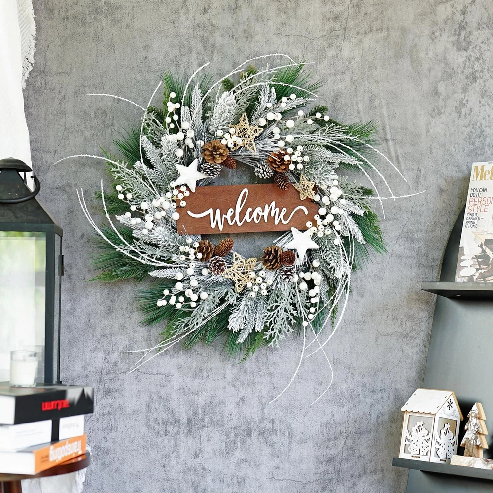 Eye-catching Christmas Wreaths for Front Door,Suitable for Farmhouse Home Door Decor and Spring Winter Christmas Festival Celebration Green Wreath Feature Handmade; Full and Realistic; Durable&High Quality; Premium Materials; Lush Appearance; Vibrant Colors We believe that when your guests or neighbors see this spring wreaths for front door, you will receive a lot of compliments. Designed for spring summer fall winter all season year round,hang this large winter wreath on your wall or front door to decorate your home. Green wreaths for front door will be a special gift for your family and friends. Materials Silk, Polyester, Foam, Grapevine. Size 22-24 Inch. Please Note The green wreath is durable and can be used indoors and outdoors, but please avoid direct sunlight and rain. So if you have any problems with our products ,please don’t hesitate to contact us,we will reply in time and solve the issues as soon as possible Unique Christmas Door Wreath:The Christmas wreaths for front door is based on green and white pine needles, adorned with white berries of varying sizes and brown pine cones. It features an eye-catching "Welcome" wooden logo in the center. This simple but exquisite design makes this greener wreath a bright landscape on the front door, instantly enhancing the festive atmosphere High Quality Welcome Wreath:The vibrant and realistic winter front door wreath handcrafted by professional florists,they have rich experience and skills with great attention to detail and craftsmanship! So the winter wreath for door is very sturdy and durable,not easy to fall off Full In Shape & Premium Materials:This fall outdoor winter wreath's fake greenery, various grain berries and colorful flowers are made of premium silk, sponge, professional paper and natural vines base! Sufficient materials were used for each greener wreath,so the winter outdoor wreath looks very full and no bald spots Multi-functional Christmas Decorations For Home:The large winter front door wreath could be used indoor outdoor fall door decor,Winter welcome sign.Of course the winter pinecones wreath also Ideal for farmhouse home wall,door,window,kitchen,living room,window,fireplace,front porch decor.It can also be used on harvest day and Thanksgiving,Christmas to add holiday color and warmth to your home Easy To Adjust:To prevent the winter outdoor wreath from being damaged during transportation,the big outdoor christmas wreath packed tightly in a sturdy 14 inch box.So before hanging,please refer to product instruction card to adjust the fluffiness of the fall leaves wreath between to make it look fuller and more beautiful Perfect Size:The winter wreaths for front door outside is about 22-24 inches in diameter when fully unfolded. It can be easily bent to reshape- please expand and fluff the roots to achieve the fullness required for the wreath. Reusable Cedar Wreath:The large everyday wreath is durable, can be used indoors and outdoors.Delivered with a premium brown box to store the front door wreath,which will protect your gorgeous winter wreath when the season is over. Also, it can be regarded as a gift for your family and friends