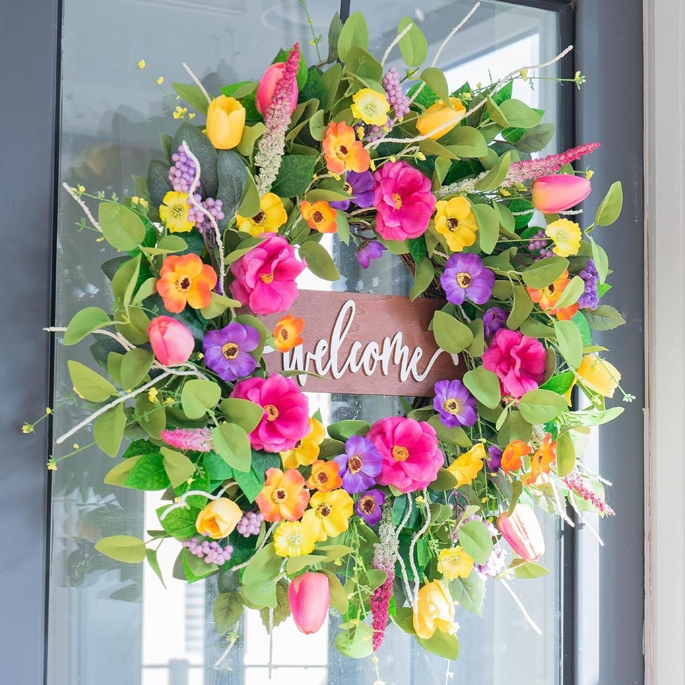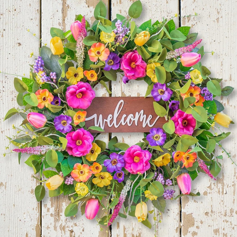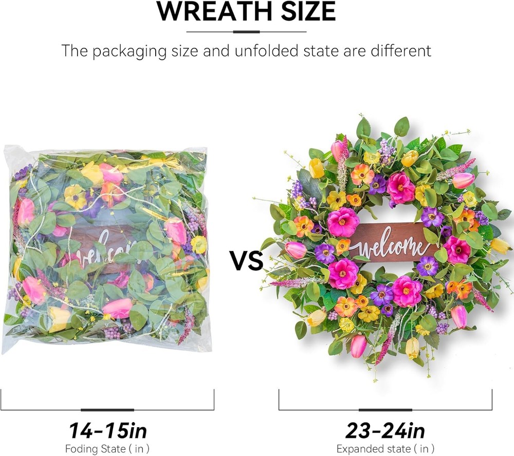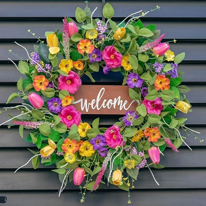 Spring Wreaths for Front Door Outside,24 Inch Summer Tulip Floral Wreath,Indoor Outdoor Green Eucalyptus Welcome Wreath with Colorful Wildflowers –Vibrant, Lifelike Wall Porch Door Decor Item Description About this item Lifelike & Full Appearance: Carefully crafted with high-quality, realistic artificial flowers and greenery, this spring door wreath boasts rich, vivid colors and a lush, full design. The colorful wildflowers and tulips pop against the greenery, creating a natural, beautiful look that brightens any room or outdoor space Welcome Your Guests in Style:The "Welcome" wooden sign adds a warm, inviting touch to the summer wreath, making it an ideal greeting for your guests. Whether hung on your front door, porch, or inside your home, this summer door wreath is sure to create a cheerful and welcoming ambiance Exquisite Craftsmanship & Handmade:The full and realistic green eucalyptus wreaths handcrafted by professional florists,they have rich experience and skills with great attention to detail and craftsmanship Full In Shape & Premium Materials:Outdoor spring wreath's fake greenery, various grain berries and colorful flowers are made of premium silk, sponge, professional paper and natural vines base! Sufficient materials were used for each floral wreath,so the the summer door wreath looks very full and no bald spots Versatile for Every Occasion:The spring front door wreath perfect for hanging on your front door, above a fireplace, on a mantel, or as part of your wedding decor, this spring flower wreath is also great special occasions like Easter,Valentine's Day, Mother's Day,St Patrick's Day,Birthdays, Housewarmings or Weddings or garden parties Easy to Hang:This outdoor spring wreath comes pre-assembled and includes a built-in hanging loop for quick and easy setup. Simply hang it on your front door, wall, or mantel to instantly add a festive, welcoming touch Easy To Adjust:To prevent the spring wreaths for front door from being damaged during transportation,the large spring wreath packed tightly in a sturdy 14 inch box.So before hanging, please refer to product instruction card to adjust the fluffiness of the door wreath between to make it look fuller and more beautiful › See more product details Payment We accept payment only through PAYPAL Shipping We ship products worldwide through standard express courier service, it will reach within 7 to 10 days to abroad buyers, we ship the product after recieved clear payment and give full information about shipment to the buyer Return We accept product return within 7 to 21 days from delivery date but product should be in original position and not in damaged condition,the return shipping charges will be buyer responsibility