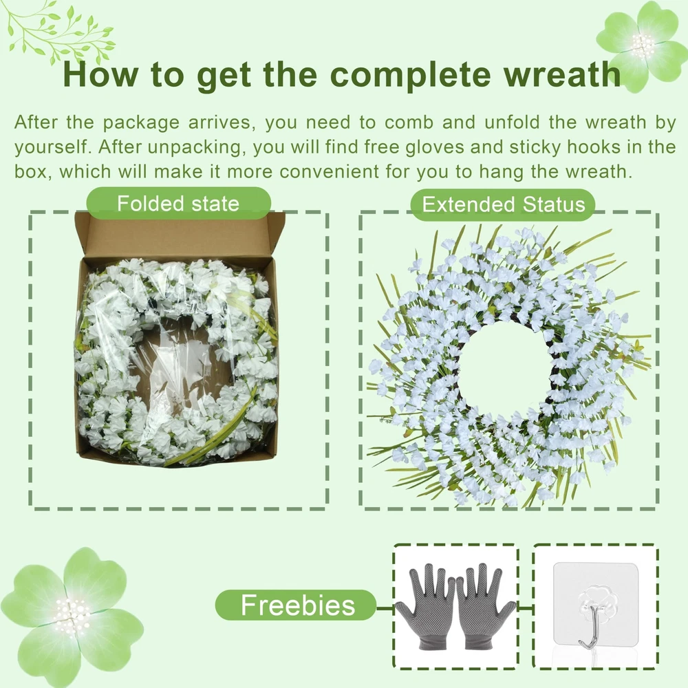Brand Concept The home furnishing brand was founded by Mr. Gong. The brand products are carefully developed by professional florists, integrating art and nature. insists on pure handmade production, allowing people all over the world to feel the charm of handmade craftsmanship. spring wreaths for front door made of high quality material The spring wreath is about 24 inches long, white winter jasmines, berries and long green leaves made from high quality materials Securely fixed to natural grapevine base, which can accompany you through a long summer full of vitality and spring atmosphere. After sales If you have any other questions about the summer wreath for front door, please feel free to , we will definitely give you a satisfactory answer within 24 hours. Package Contents The artificial spring and summer wreath comes in a beautiful box that measures approximately 14 inches and includes a set of gloves for organizing the wreath and a hanger with an adhesive hook for your convenience to hang. Durable and long-lasting: The white flowers, berries and green leaves on the spring wreath are carefully designed and crafted by florists, firmly fixed on the natural grapevine base, not easy to fall off and durable. These spring wreaths for front door can add vibrancy and life to your home. Handmade:A 24-inch handmade artificial spring wreath is made of high-quality silk white flowers, green leaves and foam berries and is not easy to rot and fade. This spring and summer wreath is reusable and will accompany you through many springs and summers. Perfect for Various Occasions: This summer front door wreath is suitable for indoor and outdoor decoration, such as living room, porch, fireplace, window and farmhouse. It is also a perfect choice for housewarming and spring and summer home decoration, bringing a vibrant atmosphere to your home. Easy to install: The grapevine base of this spring wreath is equipped with an adjustable metal ring and comes with gloves and hooks. You can easily install it according to your preferences. Service : During transportation, the summer wreath may be squeezed and deformed, and 1-2 leaves and berries may fall off. This is normal, please rest assured. If you have any questions, please feel free to and we will provide you with a satisfactory solution within 24 hours.