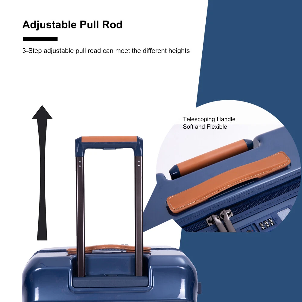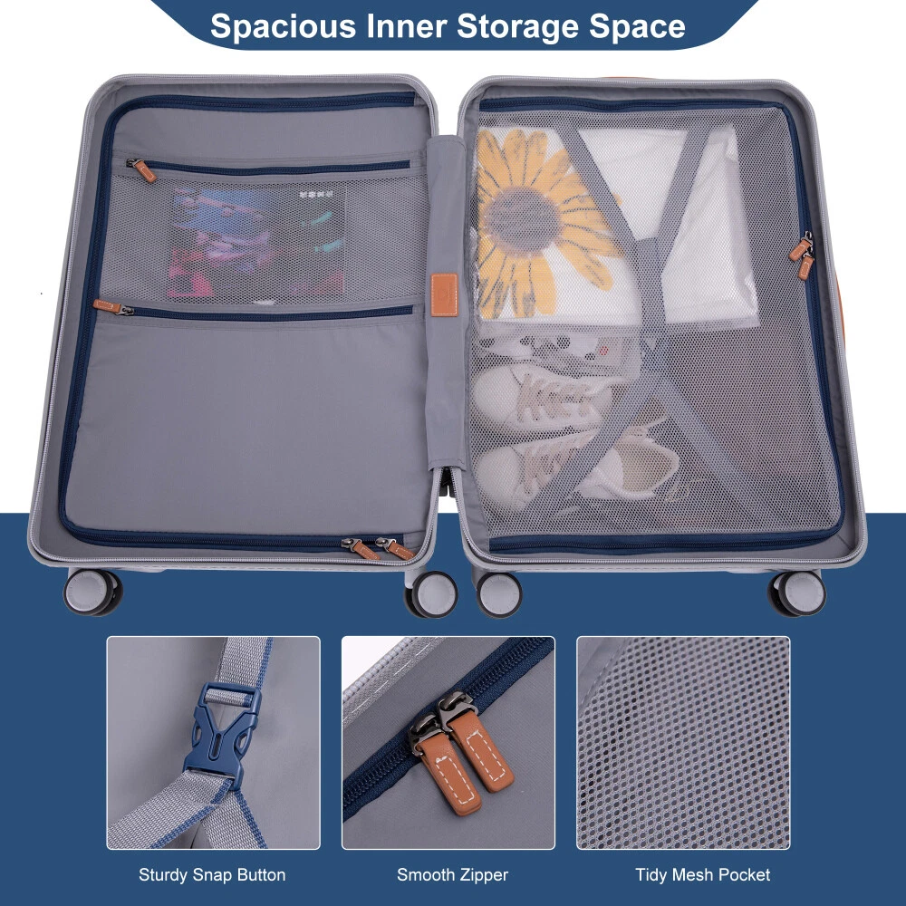 24" Luggage Lightweight Suitcase TSA Lock USB port Luggage Wheel lock Artificial leather Top handle Spinner Wheels Product Features Ergonomic padded top and side grip handles. 360°cardan wheel that you can move better. The wheel has a lock, you can better secure in special circumstances so that the box will not move at will. Spacious and Tidy Inner Storage Space: It has multiple pockets for organized packing of your toiletries and other travel necessities. Artificial leatherTop handle and smooth rolling wheels of the luggage. The sturdy top handle makes it easy for you to lift the luggage up. A built-in USB port on the side is always there for you to charge your mobile devices on the go. (Power bank is not included). TSA Lock Protects your privacy with the combination keys, while can be inspected by security authorities without damage. High-tensile-strength zipper pulls help you smoothly zip up or unzip the bag. The suitcase is made of durable ABS+PC, the luggage is built to be your trusted companion to travel with. Description USB cable Travel is no longer plagued by no data cable (Power bank not included). Artificial leatherTop handle A more comfortable feel makes it easier for you to lift the luggage up. Wheel lock You have more control over the movement of the wheel. Inner storage space Spacious and organized inner storage space. TSA Lock+USB Port Protects your privacy with the combination keys, while can be inspected by security authorities without damage.USB Port convenient for your travel. 360° Spinner Wheels Universal rotation wear-resistant and silent aircraft wheel, suitable for a variety of ground. Pull Rod Adjustable pull rode meets different height requirements.