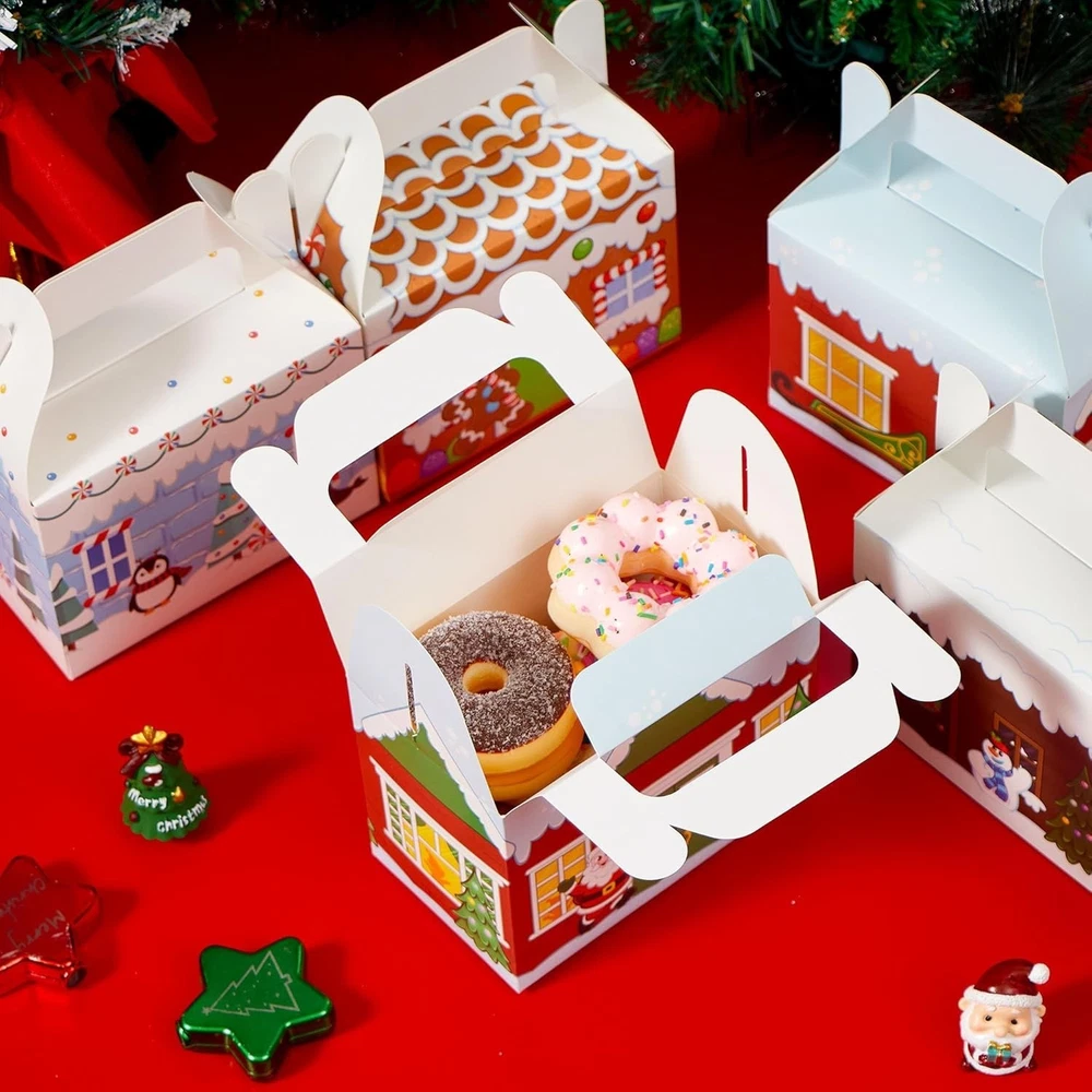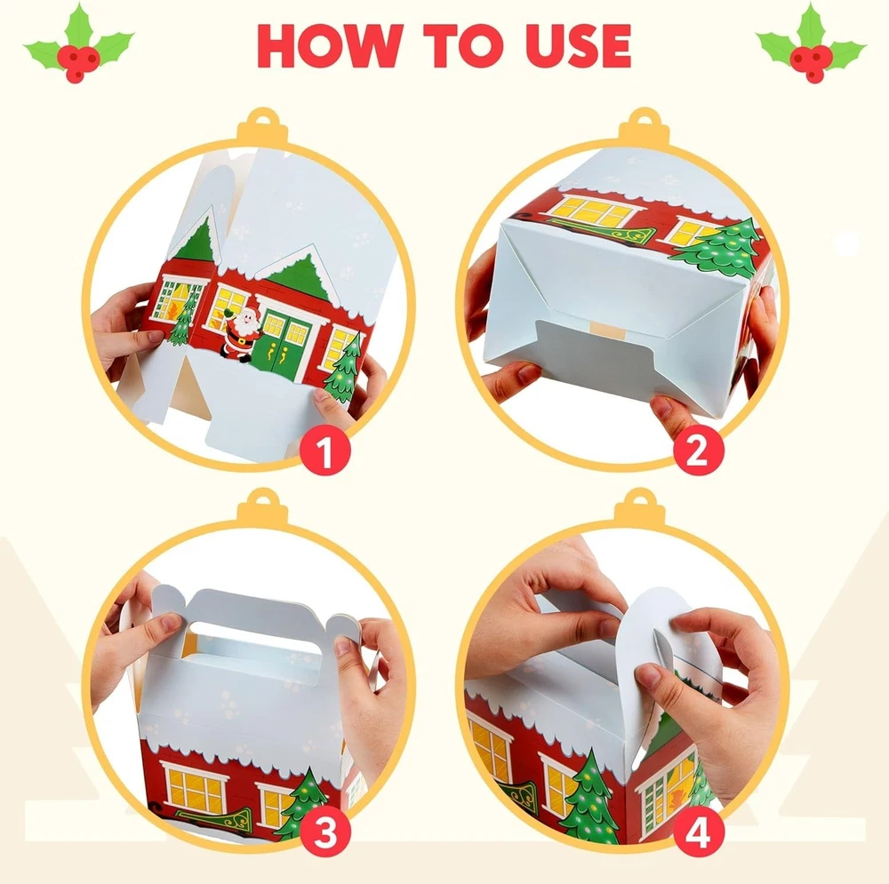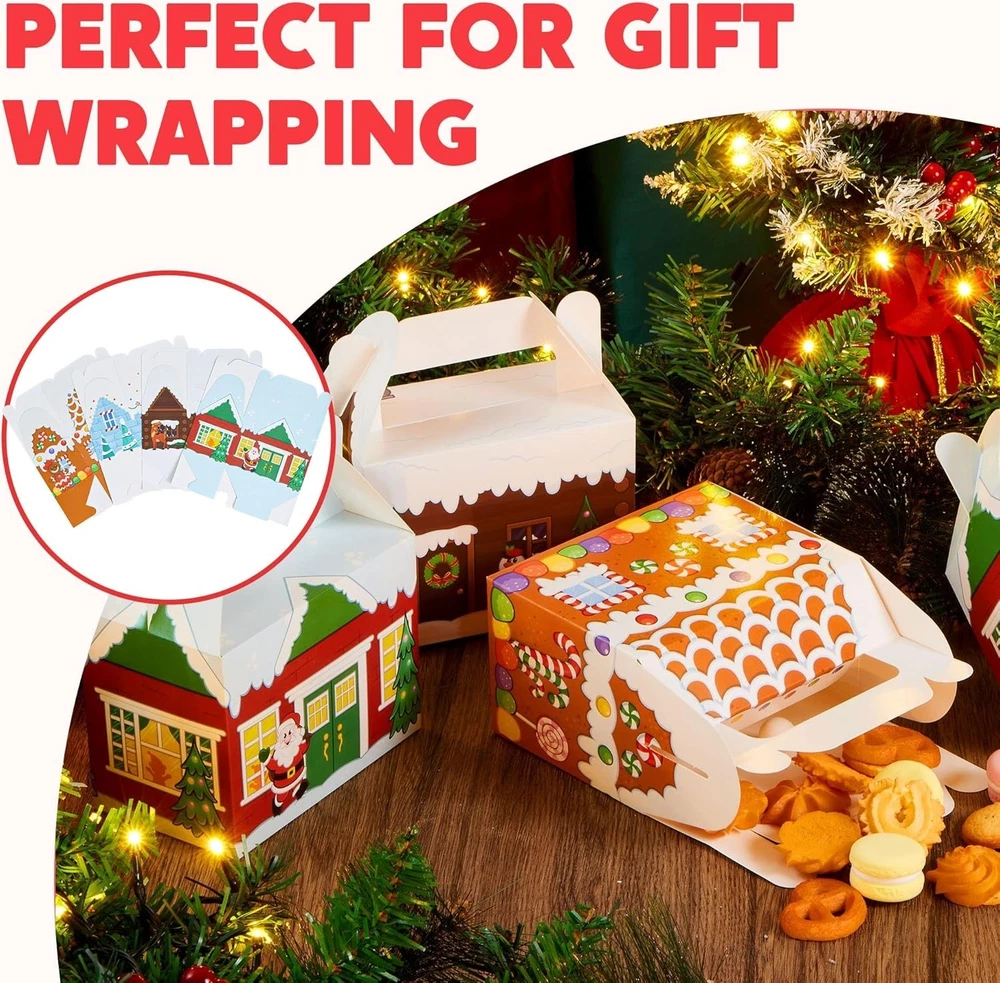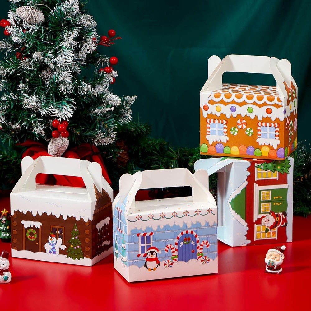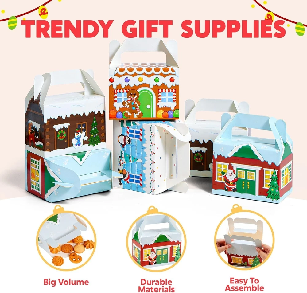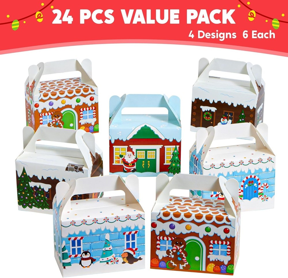 24 PCS 3D Christmas House Cardboard Treat Boxes for Holiday Xmas Goody Gift, Goodie Paper Boxes, School Classroom Party Favor Supplies, 4 Designs Candy Treat Cardboard Cookie Boxes Christmas House Cardboard Treat Boxes includes 24 Assorted Christmas Design Gift Cardboard Cookies Boxes with a Handle Feature When Box Up. 4 Designs in Santa’s Workshop, Gingerbread Candy House, and Snowman. High Quality: Permanent Ink; Thick and Sturdy; Reusable. Easy Assemble. Super Value Pack for present Wrapping. Perfect for Christmas Decoration, present Wrapping, Christmas Treaty Boxes, present Decoration, present Box Extra-Special, Decorating Parties, Weddings, Christmas Trees, Classrooms, Party Favors, Cookie and Candy Boxes, Art & Craft and more. Each Christmas present Box Measures: 6” x 3 ½” x 6” when Fully Constructed.