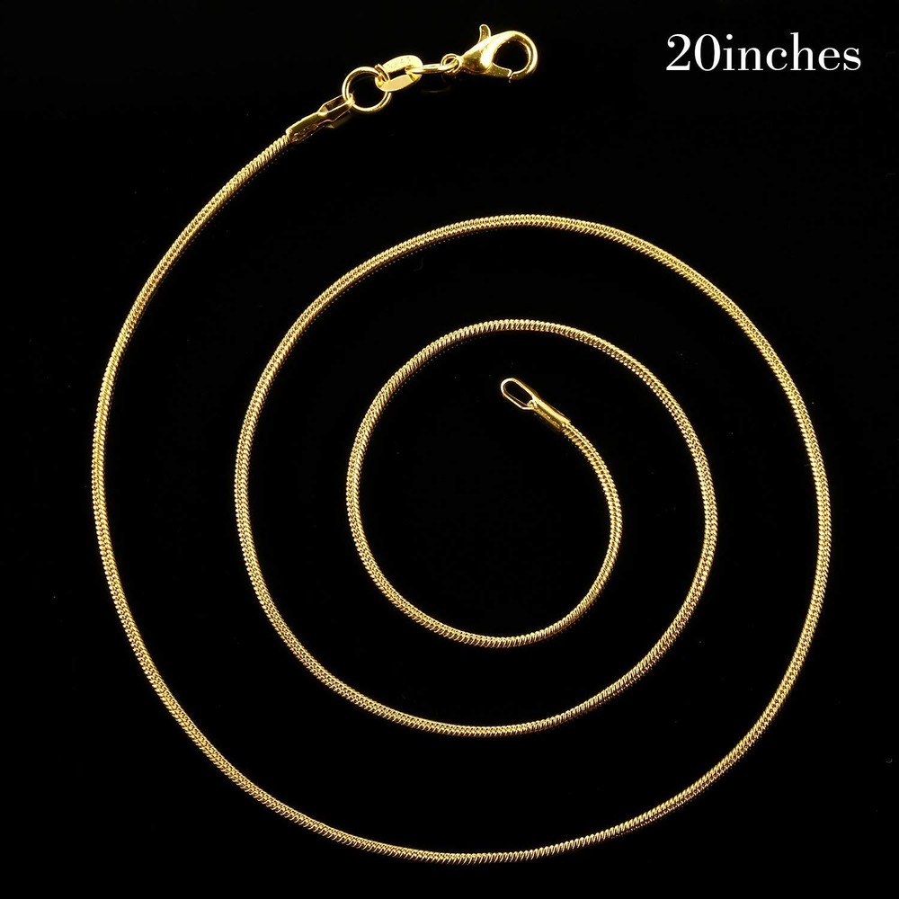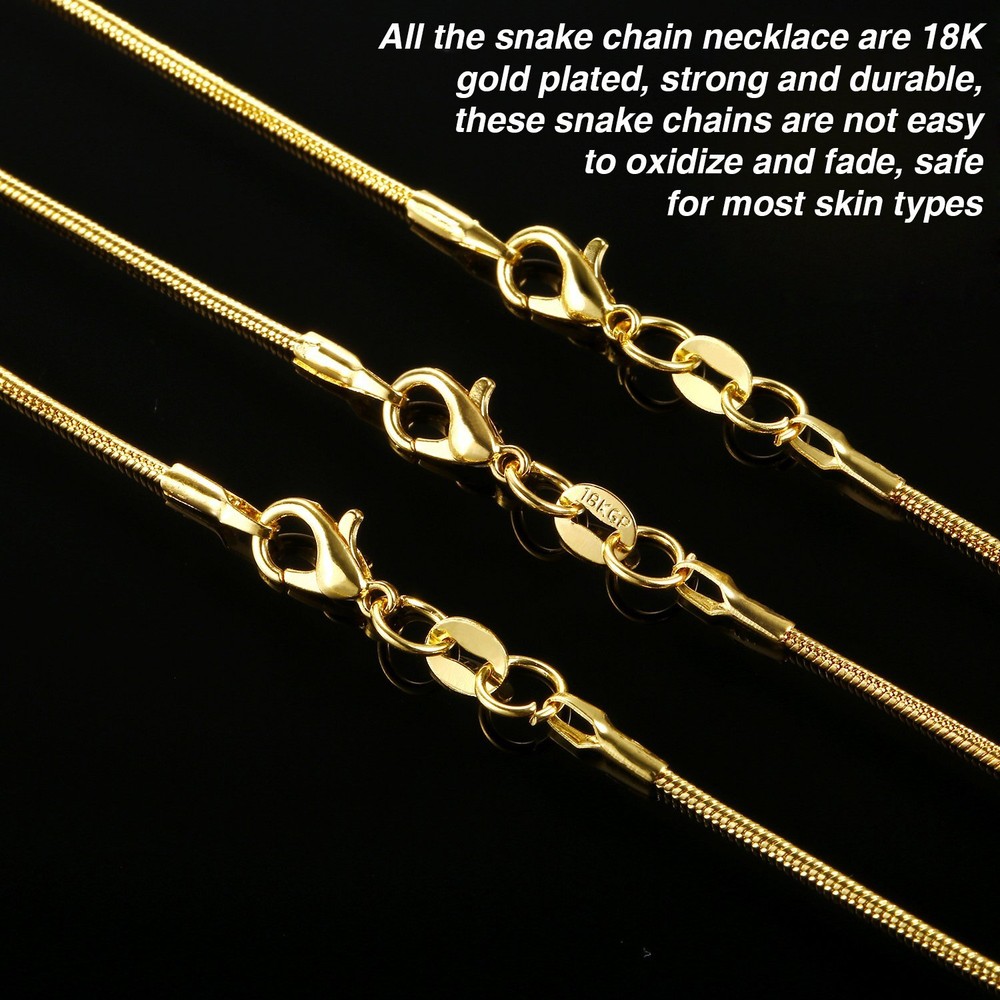 Features: All the snake chain necklaces are gold plated, sturdy and durable, these snake chains are not easy to oxidize and fade, safe for most skin types. For use in: These bright chains fit for most pendants, such as crystal pendant and many other charms pendant to make your own personalized necklaces. Specially designed chain necklace, suitable for banquet, date, shopping, party and so on; Good for DIY jewelry making, craft project, etc. Specifications: Color: gold Thickness: 1.2 mm Material: copper Package includes: 24 x Snake chain necklace Warm notice: Please refer to the size of this chain necklace before purchase. When you take a shower, please take down the women chain necklace for a long lifespan. The actual color tone of the item could be slightly different from the photo due to lighting effects and monitor's brightness. Package includes: 24 pieces of gold plated snake chain necklaces with spring-ring clasps come in one velvet bag, easy to put on and take off, convenient to wear Snake chain necklace size: each length is approx. 20 inches, thickness is approx. 1.2 mm, and lobster clasp width is 5 mm Gold plated: all the cable chain necklaces are gold plated, strong and durable, these cable chains are not easy to oxidize and fade, safe for most skin types Wide applications: can fit for most pendants, can be applied to make your own necklaces, bracelets, anklet, hang decorations, diy jewelry making, etc. Warm notice: when you take a shower, please take down the twisted cross chains for a long lifespan; Please refer to the size of this women chain necklace before purchase