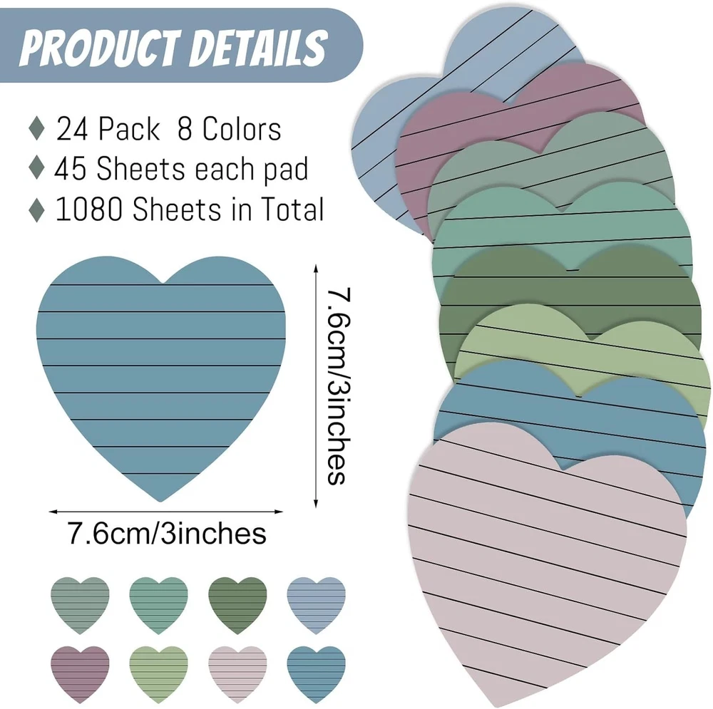 24 Pack Heart Sticky Notes - Valentine's Day Lined Memo Pads for School Office