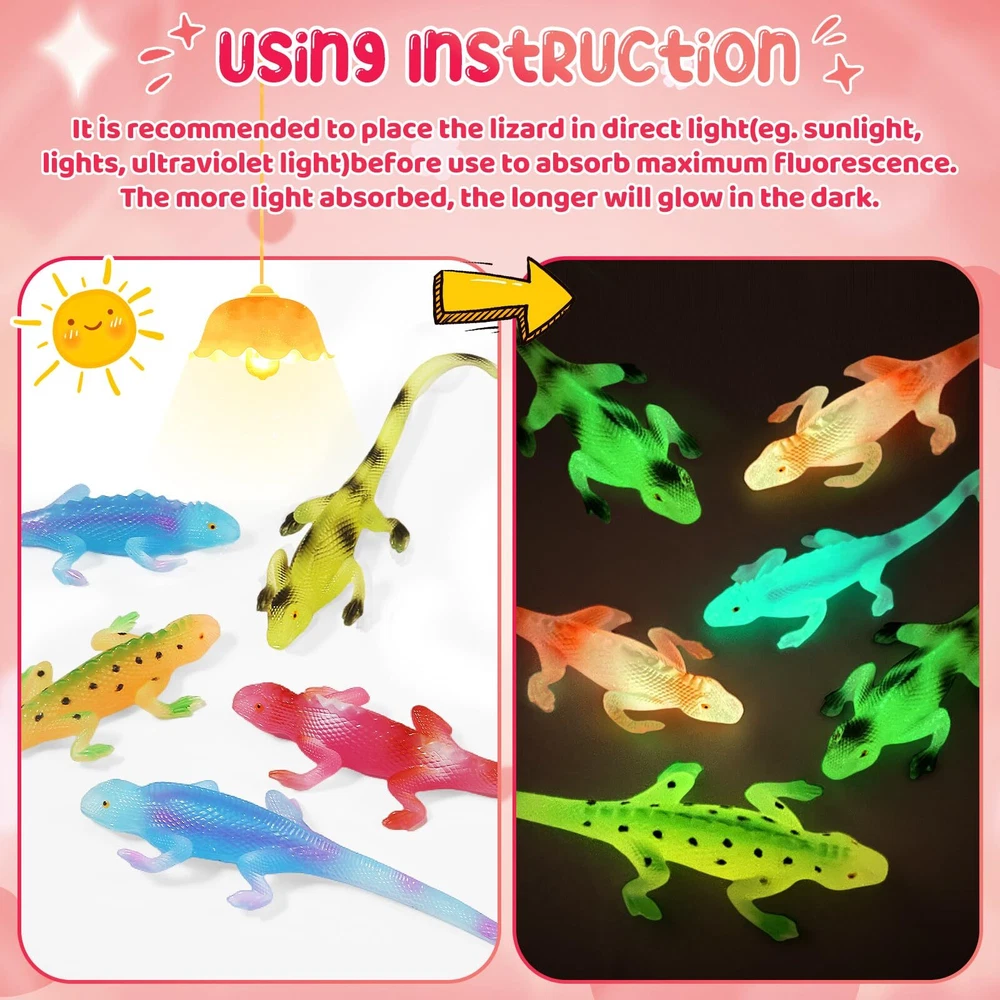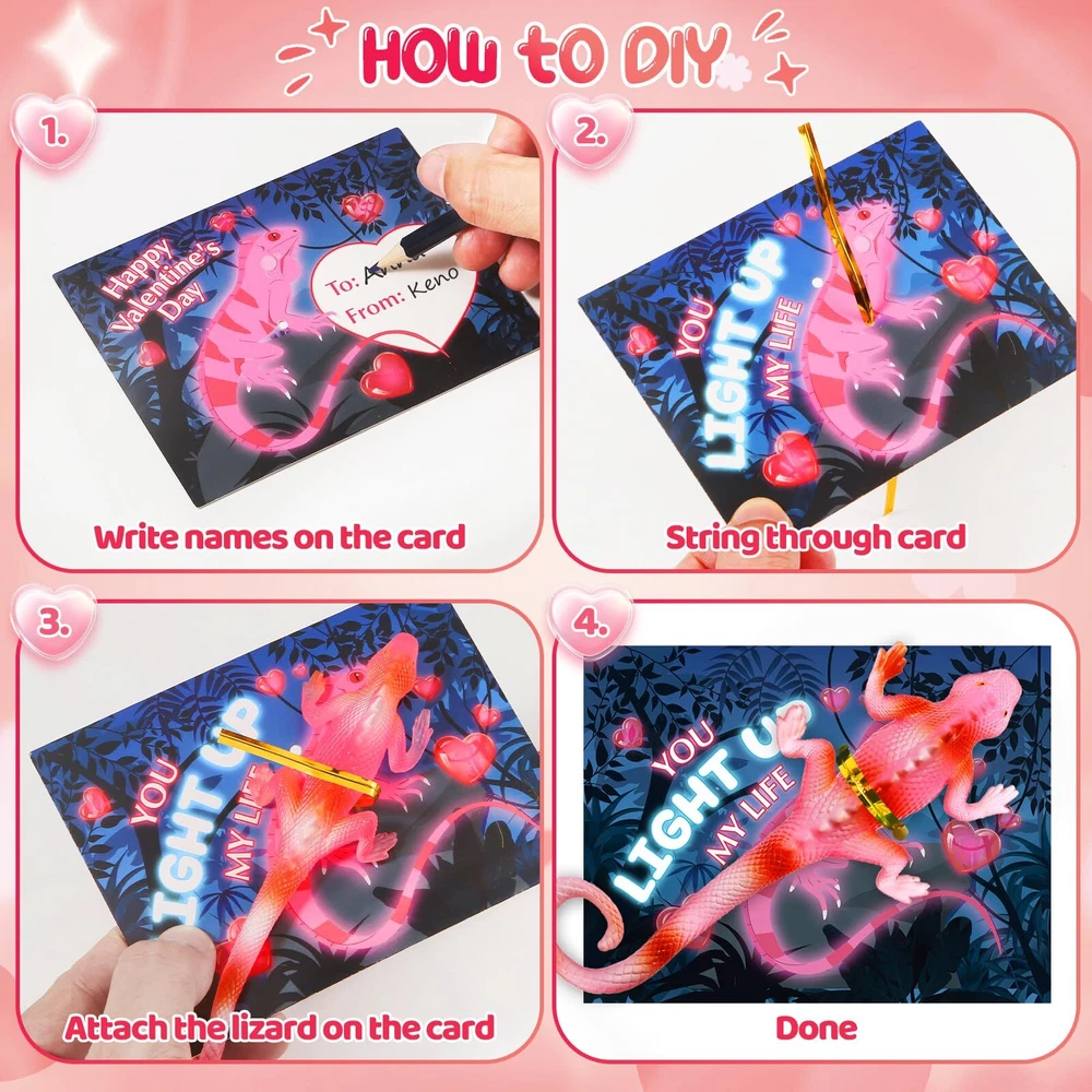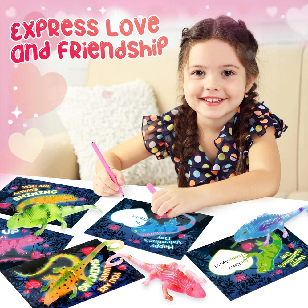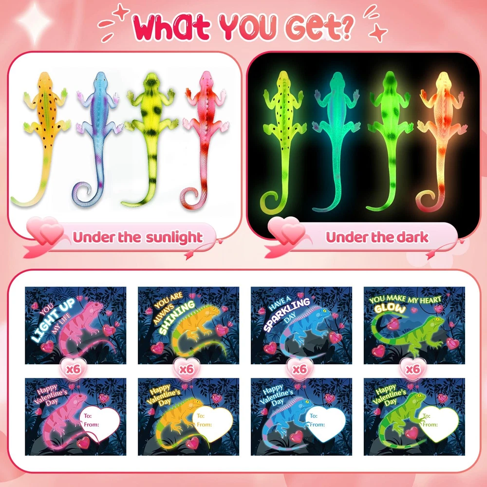 SUPER VALUE PACK! Our Valentine's Day Card Gift Set for kids includes 24 glow in the dark lizards and 24 Valentine's day cards in 4 fun designs. Enough quantity and good combinations can meet the needs in Valentine's parties and school classroom exchange gifts. Kids can share with friends or classmates and have fun together. A great valentine idea for classroom valentine parties. IDEAL VALENTINE'S DAY GIFT. Our Valentine's Cards Party Favors Set provides fun and entertainment for your kids. Valentine's greeting cards with toy lizards are perfect for kids classroom exchanges, preschool or elementary school Valentines parties, Valentine's event, or any Valentine's game prize, love notes, party favor supplies and more! Ideal Valentine's day gift for boys and girls. UNIQUE VALENTINE'S DAY CARDS. Each valentine's day card has a valentine punchline, making the cards more attractive. Valentine's day cards are thick, double-sided printed, and designed in lizard pattern which will be popular among kids. A perfect greeting card to your kids who like something special. MAGICAL TOY LIZARDS. These lizards are made of high quality and special TPR material which could glow in the dark when they have absorb light. Put it under the sun or light for a while and see the magic in dark. The kids will shout and jump for joy. Greet Valentine's toy Bulk for kids. EXCHANGE GIFT AND SHARE LOVE. Giving out the valentines cards is a fun way to encourage kids' social skill development and teach kids to share, love and make friends. A great chance to express love to families, friends and classmates.