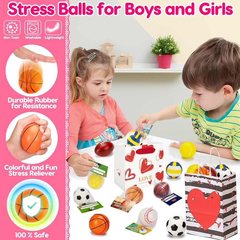 24 Pack Stress Balls Valentines Day Cards for Kids School Sport Party Favor Valentines Gifts Classroom Prizes Box Bouncy Mini Sports Ball Valentine Basketball Football Goodie Bag Boy Girl Toys Bulk Product Details Product Dimensions: 1 x 1 x 1 inches Item Weight: 1.04 pounds Country of Origin: China Manufacturer recommended age: 36 months - 15 years Manufacturer: AugToy Kids Valentines Day Balls SetOur abundant bulk valentines day gifts for kids school come with 24 pcs sports stress balls with valentines day cards and individual net bag packaging. There are 6 kinds of stress balls, 4 of each(Basketball Football Soccer Baseball Volleyball Tennis). Especially great for kids valentines day gifts for school and sport party favor, toddler valentines day gifts prizes and prize box toys for kids classroom, mini sports ball valentines, boys valentines exchange gifts. Creative Valentines Day Cards for Kids SchoolOur good quality sport valentines cards for kids class reverse side includes lines for filling in To and From, allow you to write your best wishes on these boys valentines cards for classroom. Show your blessing to your friends and classmates , let these greeting cards filled with good wishes strengthen your friendship. Best basketball valentines cards exchange, football valentines cards and soccer valentines day cards for kids who love balls. Premium Elastic Stress BallsThese squishy sports ball valentines for kids with bulk valentine cards for school are made of safe material foam, non toxic. It is super fun to squeeze because of the soft touch felling, ideal valentines day treats for kids 4-8 year old to help relieve stress and give lots of enjoyment. Stress relief toy is also suitable as indoor & outdoor toys, kids can carry and play everywhere. Best choice for baseball valentines decor or football party favors. Perfect Sizes For Kids and AdultsThe cool mini sport stress balls with toddler valentines day cards for kids school are 2 to 3 inches, portable for goody bag stuffers and bulk toys for kids prizes. Convenient for kids hands to grasp and can actually be thrown around as in playing catch. Fabulous addition for teachers and students, treasure box for classroom, sports and outdoor toys for toddlers 4-8 and kids ages 8-12. Children all love to play with these valentine gift bags for kids class. Cute Gift Idea Instead Of Valentines CandyThese mini sports ball valentines bulk toys feature exquisite packing. If you're a teacher looking for school valentine prizes box and small toys for kids classroom, don't miss our preschool valentines for kids sports ball. Perfect for valentine treats, basketball party favors, football party decorations, sports themed birthday supplies, prizes for kids classroom. Just take these amazing class valentines day gifts for boys & girls 3-5-8 year old.