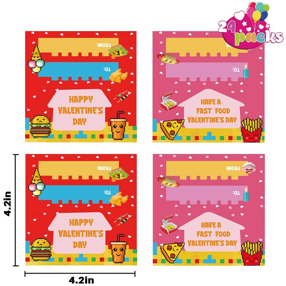 24 Packs Valentines Day Cards with Fast Food Building Blocks, Valentines Food Cars Set for Kids Valentines Day Gifts, Valentines Classroom Exchange, Valentines Party Favors, Valentines Greeting Cards Funny Fast Food Block Set: Our Valentines day party favor set includes 24 packs of building blocks. 12 different kinds of food, Burger, Chicken nuggets, Cola, Hot dog, Pizza, Cake, Kebab, Roast chicken, Fries, Ice stick, Ice cream, Pudding. High Quality: The fast food building blocks are made of high quality environmental ABS plastic material, 100% Safe and Non-toxic. But contains small parts, be careful to prevent swallow for kids under 3 years old. Unique Design: There are 12 different designs of fast food included. And each vehicles comes with a Valentine card, the card header is also a valentines gift card. Combine 12 different food together to build a fast food play car! Unlimited imaginative fun for your little builders. Creative & Fun: The fast food building blocks set for boys and girls is an excellent educational toy. It can also encourage children to widen their imagination and practice their creativity while keeping them away from other electronic gadgets. Perfect Gifts: This food building block kids Valentine party favors set brings joy to many occasions, suitable for kid's Valentine's Day, especially for classroom exchange gift, Valentine's party favors, classroom prizes. Exchanging these novel valentine gift cards, share your love and gratitude to classmates, friends and families, the one who receive the gift cards must be surprised and happy.