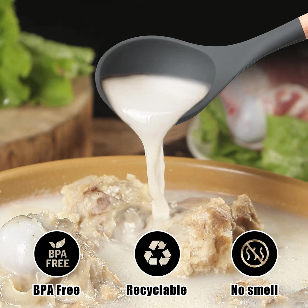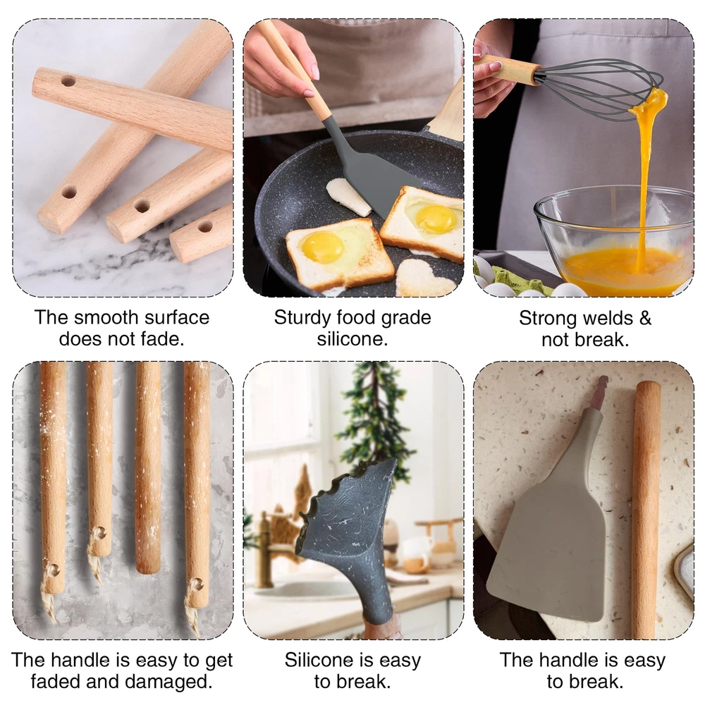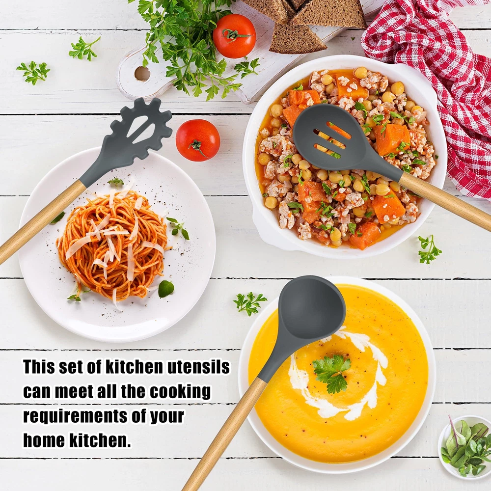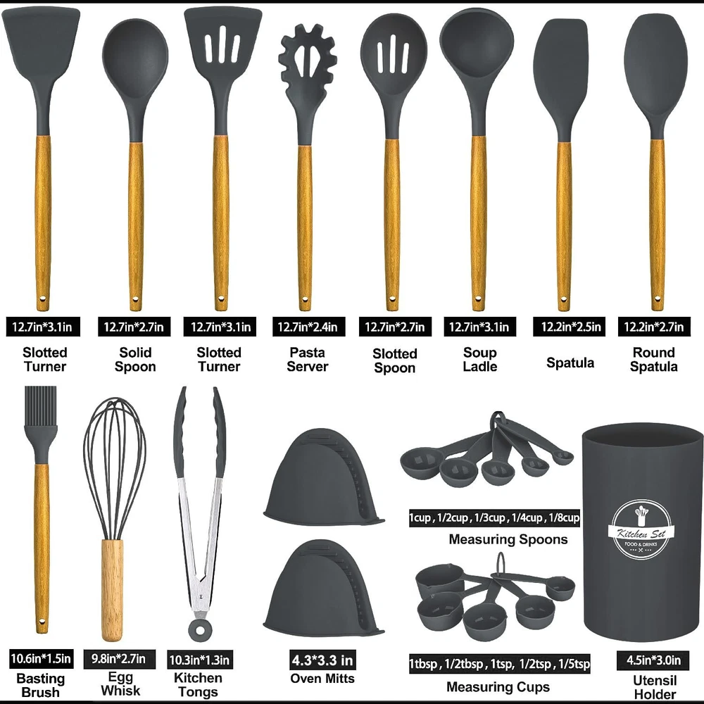 【Kitchen Utensil Set】- The silicone kitchen utensils set is made of food grade silicone and has no odor.Before the first use, we recommend soaking the tableware for half an hour and exposing it to the air for about 3 hours before the odor will disappear 【Cookware Health】- Silicone cooking utensils can withstand high temperatures of 446 ° F/230 ° C. Don't worry about food sticking to your cooking utensils. Silicone tips can protect your pot from scratches or dents on the surface of the cooking utensils. Extend the service life of all kitchen pans. They are scratch resistant, not as easy to melt as plastic and rubber tableware, nor as non stick pots that can harm you like metal kitchenware 【24Pcs Kitchen Utensils to Use】- This silicone tableware set can fully meet your kitchen needs, including a deep soup spoon, solid spoon, flexible spatula, circular spatula, spaghetti server, measuring cup and spoon, and more. Both cooking and baking tools are available. You will have all the basic cooking tools you need in your kitchen 【Large Kitchen Utensils Set】- integrated stainless steel core, seamless, easy to clean, enhances durability and toughness, helps maintain its shape and flexibility, and ensures no warping. Please note that due to the wear and tear on wooden handles caused by dishwashing, these silicone kitchen utensils used for non stick pots are not suitable for dishwashing with a dishwasher 【High Quality Service】- If you have any questions about the utensils set, please feel free to contact our customer service, and we are always at your service. We are committed to providing fast and supportive assistance to address any questions or concerns you may have. Please feel free to contact us through the Amazon buyer page. We will listen carefully and respond promptly within 12 hours