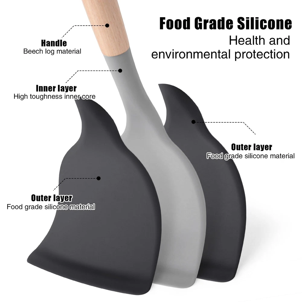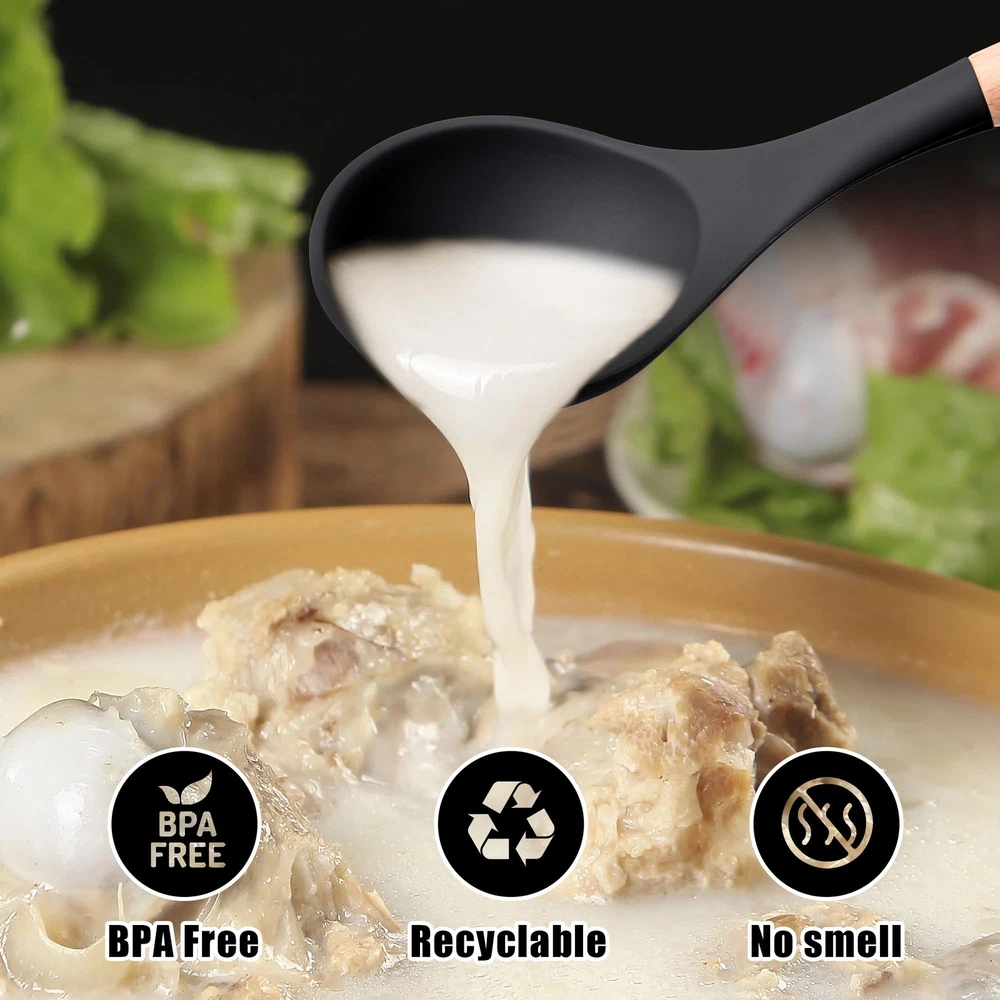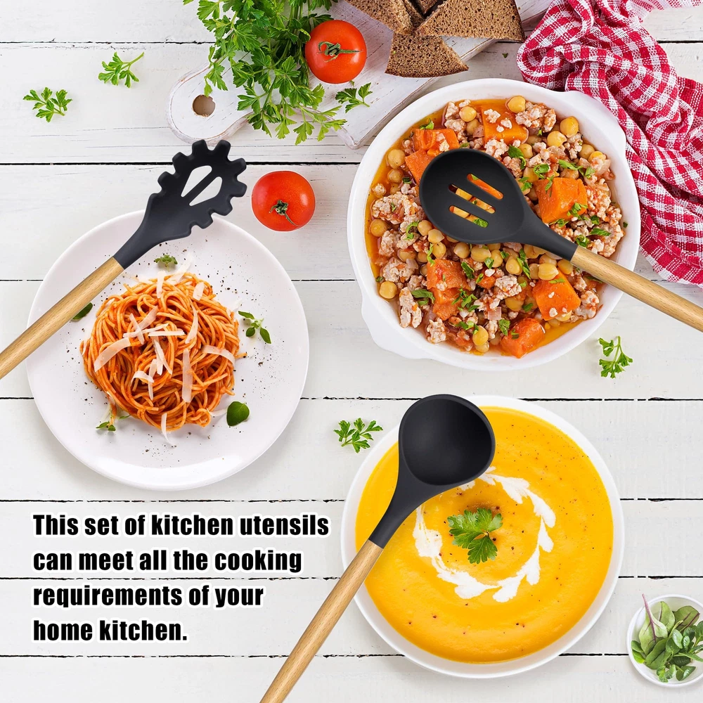 【Kitchen Utensil Set】- The silicone kitchen utensils set is made of food grade silicone and has no odor.Before the first use, we recommend soaking the tableware for half an hour and exposing it to the air for about 3 hours before the odor will disappear 【Cookware Health】- Silicone cooking utensils can withstand high temperatures of 446 ° F/230 ° C. Don't worry about food sticking to your cooking utensils. Silicone tips can protect your pot from scratches or dents on the surface of the cooking utensils. Extend the service life of all kitchen pans. They are scratch resistant, not as easy to melt as plastic and rubber tableware, nor as non stick pots that can harm you like metal kitchenware 【24Pcs Kitchen Utensils to Use】- This silicone tableware set can fully meet your kitchen needs, including a deep soup spoon, solid spoon, flexible spatula, circular spatula, spaghetti server, measuring cup and spoon, and more. Both cooking and baking tools are available. You will have all the basic cooking tools you need in your kitchen 【Large Kitchen Utensils Set】- integrated stainless steel core, seamless, easy to clean, enhances durability and toughness, helps maintain its shape and flexibility, and ensures no warping. Please note that due to the wear and tear on wooden handles caused by dishwashing, these silicone kitchen utensils used for non stick pots are not suitable for dishwashing with a dishwasher 【High Quality Service】- If you have any questions about the utensils set, please feel free to contact our customer service, and we are always at your service. We are committed to providing fast and supportive assistance to address any questions or concerns you may have. Please feel free to contact us through the Amazon buyer page. We will listen carefully and respond promptly within 12 hours