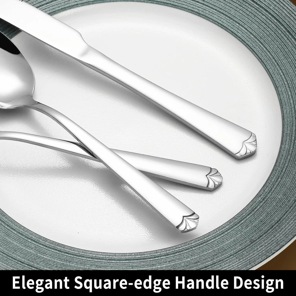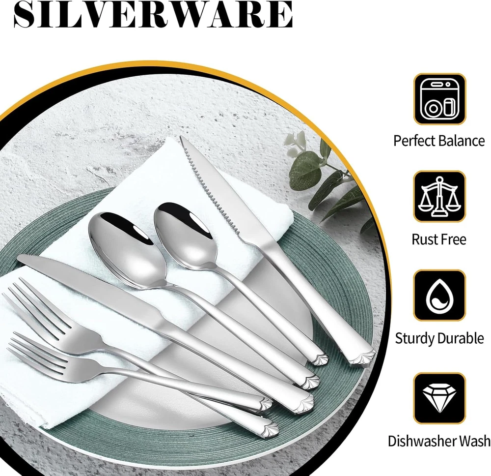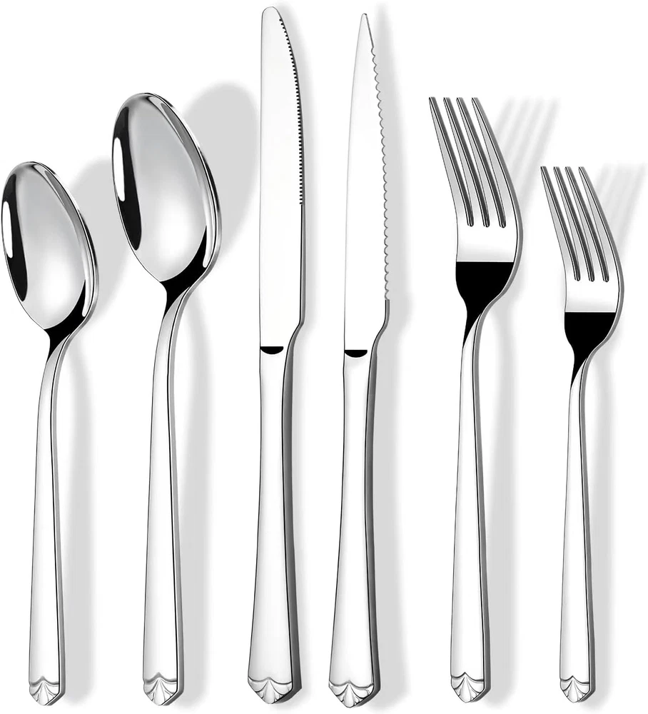 ELEGANT 24-PIECE SILVERWARE SET FOR 4: Includes 4 dinner forks, 4 salad forks, 4 dinner knives, 4 steak knives, 4 dinner spoons and 4 teaspoons. The knife spoon fork set is a necessary item for families and restaurants alike, serving as an invaluable asset for daily dining or for serving meals during gatherings and festivities. HIGH QUALITY STAINLESS STEEL: This silverware set is crafted from premium-grade stainless steel, renowned for its durability, corrosion resistance, and a nickel-free composition, ensuring a healthy and odor-free dining experience. Its robust build guarantees long-term use without any concerns of bending, and the cutlery set is easy to clean and DISHWASHER SAFE. 4 STEAK KNIVES INCLUDED: This pack offers 4 additional steak knives, these knives are designed with sharp serrations on their blades, making them exceptionally adept at effortlessly slicing through meat, making them perfect for any dining occasion, and the ergonomic design provides a comfortable and secure grip. UNIQUE APPEARANCE: The tableware set adopts a simple and generous design, the end of the handle is embellished with flowers, which makes the flatware set more graceful and elegant and elevates your dining experience. IDEAL FOR MANY OCCASION: Our kitchen utensil set is idea for family daily use, gatherings, banquet, Thanksgiving, wedding or other formal occasions. Also perfect for as a gift to family members, lover partner, friend or colleague because of exquisite packaging Product Description PACKAGE INCLUDES · 4 x Dinner Knives · 4 x Dinner Forks · 4 x Dinner Spoons · 4 x Teaspoons · 4 x Salad Forks · 4 x Steak Knives LUXURY SILVERWARE SET Prendcyx 24-piece Silverware Set is crafted from premium stainless steel, features a perfect balance of thickness and polished edges, providing a comfortable grip while enjoying your meals, can well match your kitchen style and dinnerware. USING INSTRUCTION: Please wash flatware set with warm soapy water before using them for the first time, In order to remove any residue left from the manufacturing process. Please drying the cutlery set in a dry place after cleaning Smooth edges protect the lips from being scratched, balance weight make it grip comfortable. Good use in soup and ice cream. Ergonomic handle design, comfortable and convenient to use, suitable for party entertaining guests and daily family dining use This flatware set have proper thickness and even distribution of weight, maintains a medium weight, comfortable to use will not be too heavy or too light, suitable for people of any age to use