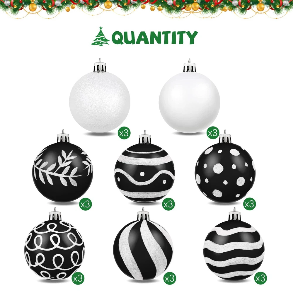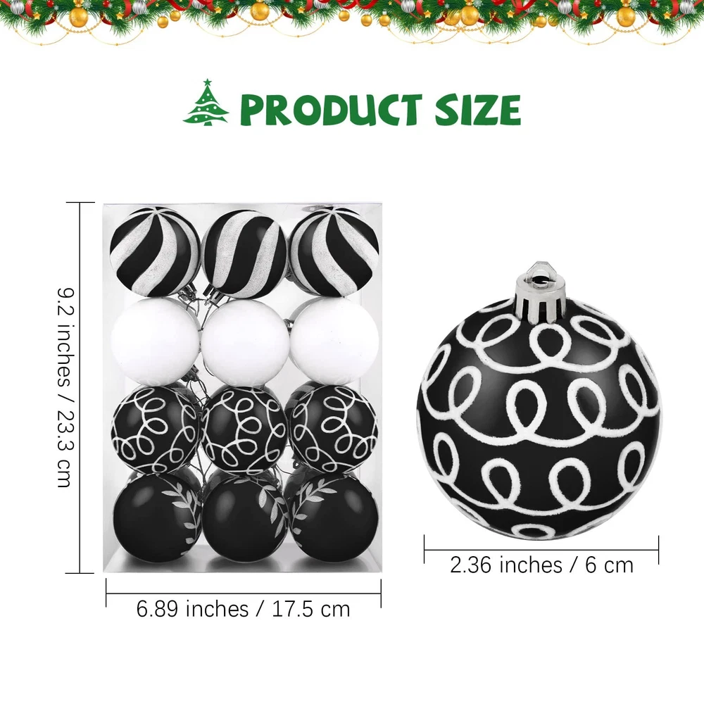 Specification: Material: plastic Color: as shown in the pictures Size: 2.36 inches / 6 cm in diameter Quantity: 24 Package includes: 18 x colored balls 3 x shiny balls 3 x glitter powder balls Warm note: Please allow slight difference on size due to manual measurement. Package includes: you will receive 24 Christmas balls in 8 styles, namely, 6 kinds of colored balls, 1 shiny ball, 1 glitter powder ball, 3 pieces for each style, with rich styles and quantities, Christmas ball ornaments can meet your Christmas decoration needs Shatterproof Christmas ball: the colored decoration baubles are made of durable and environment-friendly plastic with an excellent shatterproof property; the surface of the Christmas balls is decorated with glitter powder, the Christmas hanging ornaments are practical and decorative, ideal for home decoration Decorating your Christmas: we provide you with a variety of styles of Christmas balls, bringing joy and romance to your Christmas, you can enjoy the joy of decorating the Christmas tree with your family members, giving you a memorable and happy Christmas Wide uses: the Christmas ball ornaments can not only be used to decorate the Christmas tree, but also can be used to DIY wreaths to decorate living rooms and hallways, making your home attractive; the shatterproof decorative balls can also be used as ideal gifts for your family members and friends Color and size: the Christmas hanging ornaments are in black and white, the size of them is 2.36 inches / 6 cm in diameter; please note that there will be some glitter powder falling during transportation, you don't need to worry about affecting the appearance and use