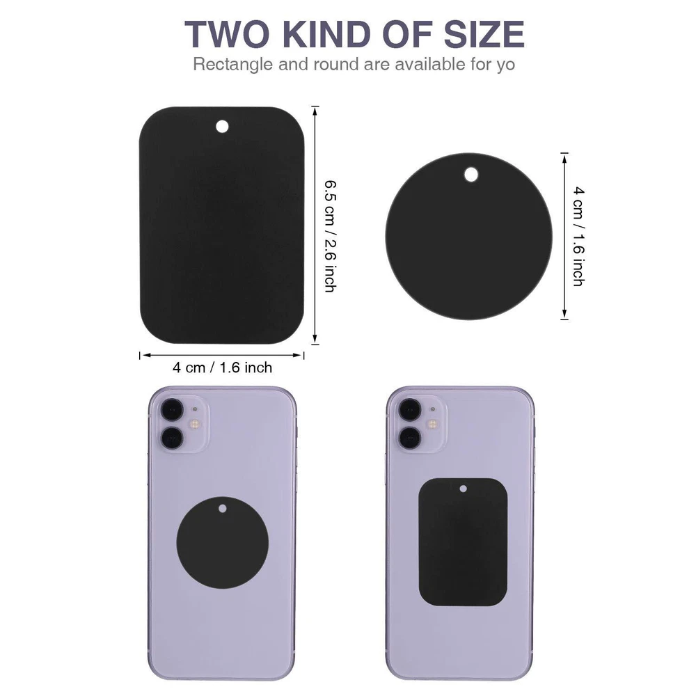 You will get: the metal plate for phone magnet is 6.5 x 4 cm/ 2.6 x 1.6 inch, 12 pieces; Round one 's diameter is 1.6 inch/ 4 cm, 12 pieces, 24 pieces in total; Give you enough options to use with bigger or smaller devices Strong adhesion: each universal metal plate has adhesives tape and easy to stick onto the back of phone or case, so these plates set your phone on the car mount more easier and securer and you can go hands-free even on the bumpiest of roads How to use: as long as peel off the film on both sides of the product gently, make sure the surface of the object is smooth and clean it before using, then you can stick them to any smooth place, the longer the adhesive time, the better the stickiness Features and please note: if you stick the phone metal plate for magnetic mount on the back of the phone or phone case, wireless charging may be disable; It is recommended to remove it when using wireless charging; And remove it will not leave any sticky residue on your phone Warm notice: this replacement metal phone plate itself is not magnetic; And it is recommended to use these metal plates with universal magnetic mounts; And the metal plates can use with most magnetic car mount holder