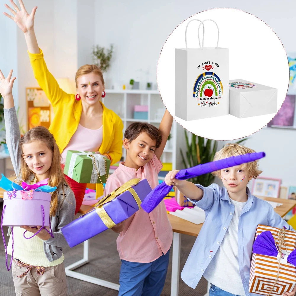 Features: Joyful atmosphere: These cute and funny designed paper party favor bags can put you in a better mood, you can use them to wrap gifts and make the person who receives them happier and feel the sincere thought Easy matching: bags design is simple and easy to match with various gifts, the colors are coordinated and will not stand out, not only as teachers appreciation day gift for teachers, but also for birthday gift packaging, candy bags, shopping bags, etc. Specifications: Material: kraft paper Color: as shown in the picture Size: approx. 15 x 8 x 21 cm/ 5.9 x 3.15 x 8.3 inch Package includes: 24 x Paper bags Notes: Manual measurement, please allow slight errors on size. The color may exist a slight difference due to different screen displays. The words printed on the product are not as trademark or brands, just for decoration. What You Will Receive: you will receive 4 styles, 6 of each style, a total of 24 teacher gift bags; Enough quantity and a variety of styles to meet most of your usage needs; The interesting design on the paper bag can make your mood happy and add fun to your life Size and Material Information: the size of each gifts bags is approx. 15 x 8 x 21 cm/ 5.9 x 3.15 x 8.3 inch; And we apply high impact kraft paper material to make our beautiful bags, the surface is very smooth, better aesthetics, very suitable as a teacher's appreciation day gifts to show sincere thanks and gratitude Reusable and Reliable: our teacher graduation gifts bags are made of high impact kraft paper, which is safe to use; Our products are also suitable for many occasions and can meet most of the daily storage and packaging of small items Gift Bags for Teachers: end of the year gifts for teachers bag printed with the words “T takes a big heart to help shape little minds, Teach Love Inspire, Teaching is a work of heart, Best teacher ever! Thanks!”, which are suitable for teachers of all subjects; You can give them to your male teachers, female teachers, Chinese teachers, English teachers, math teachers, etc Practical and Wide Application: teacher appreciation gift bag with thin paper are accessible for wrapping teacher appreciation day gifts such as flowers, chocolates, scarves, books, clothing, jewelry, home accessories or a range of small items; You can apply this teacher gift bag to wrap or package your gift to make your gift interesting