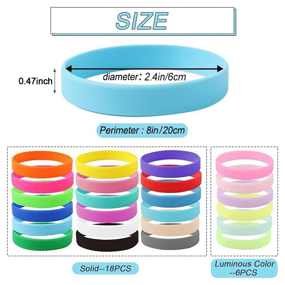 What you get - you will get 24 pieces colored silicone bracelets rubber wristbands, including 18 different conventional colors and 6 luminous colors. Enough quantity can nicely meet your daily use and different activities party gifts. Size - each rubber silicone wristband measure same size, 1/2inch width and 8inch length. Good extensibility of color silicone bracelets can be stretched to fit different hands, suitable for most teenagers and adults. Material - our solid color silicone rubber wristbands made of quality silicone with no burden on the wrist, durable, comfortable to wear and easy to take off. Waterproof rubber band bracelets make you no need to be remove even when you are taking a shower. DIY wristbands - our blank silicone rubber wristbands can add your name, , telephone number, company logo, special date or any reminder, personalized silicone wristbands can help you keep important things well in your mind. Wide usage - our solid color silicone wristbands can used as cups, bottles, cans, mugs tag marker, cat toys, camera circlet-band and etc, also perfect for sports, games, sports clubs, school activities, group activities, parties, banquet, dinner, training, a nice gift choice for family and friends!