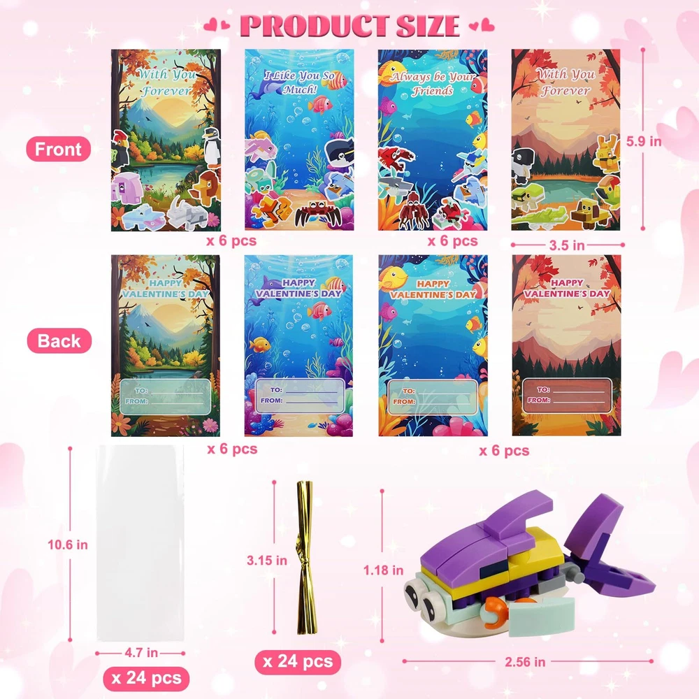 Value Valentine's Day Gifts for Kids Set: Our Valentine's Day cards set includes 24 packs of un-assembled building blocks with 12 animals & 12 sea creatures, 24 cute Valentine's Day cards, 24 clear OPP bags & 48 * twist ties (Two sizes, each with 24 pieces). Abundant in quantity and variety of styles, your kids can learn about different animals by setting up by themself. Safe & Reliable: The sea animal & dinosaur building blocks are made of high-quality environmental ABS plastic material, non-toxic and durable, with rounded edges & corners, and no burrs, which won't hurt children's hands. But contain small parts, be careful to prevent swallowing for kids under 3 years old. Interesting Gift Exchange Methods: kids need to write [To] [From] who & blessing on the card, pick 1 building blocks pack and 1 write-completed card together in the OPP bag, tie the OPP bag with a twist tie. Finally, give Valentine's Day gifts to classmates, or the card has pre-punched holes that can be threaded through the twist tie, tie the completed building blocks together on the card and give them to a friend. Puzzle Early Education Toys: The Mini Building blocks exercise kids’ thinking ability during the building process, which promoting the development of fine hand movements, build their color shape cognition, widen their creativity and imagination,develop their patience and hands-on ability, lots of fun. Kids can also complete the construction process with classmates, share the results with each other and enhance friendship. Valentines Day Gifts for Kids: These Valentines gift card packs are perfect for boys and girls, Valentine's Day, class events, gift exchanges, school classroom prizes, love notes, and any occasions. They will amaze all the children at the Valentine’s Day party and bring more fun to boys and girls.