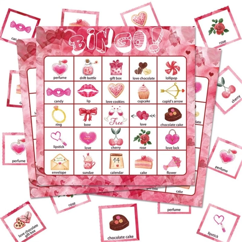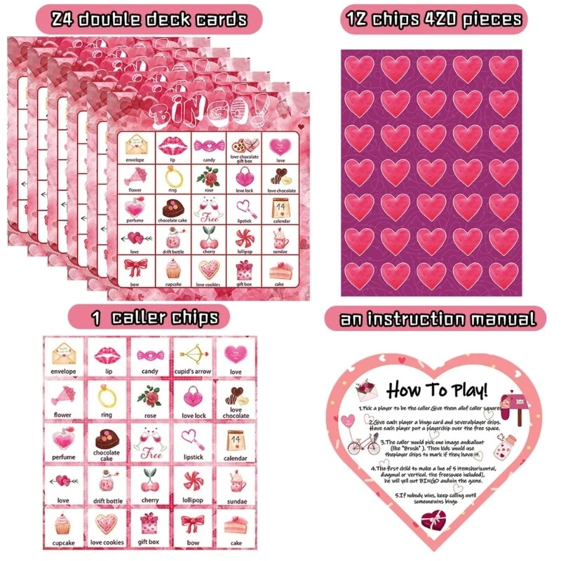 Features: Valentine bingo card party game includes 24 bingo player boards with 12sheet stickers, and 25 caller chips die cut bingo markers with through window. Reusable,quality material durable. easy to use.create hours of fun. Perfect for valentine children entertainment,excitement builds,valentines presents,valentine goodies and toy,party supplies,novelty gift toy,goodies bag fillers,valentines treats for kids,school classroom games, valentine party card games,classroom game,and family home activity. Wonderful gift,sweet warm gift for friend family and yourself. Safe to kids. Specifications: Material;Paper Package Includes: 1Set Valentines Day Bingo Game Cards note: Please allow 1-2cm errors due to manual measurement. Due to the differences betweeen different monitors,the picture may not reflect the actual color of the item.