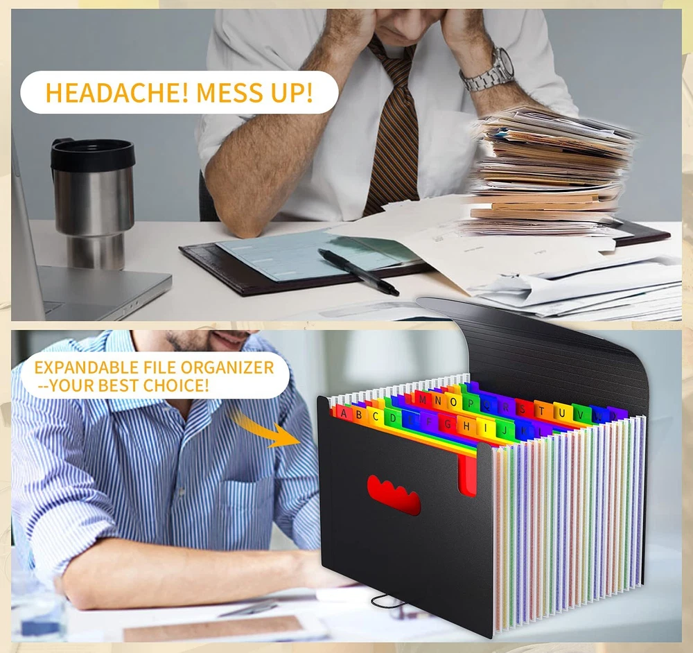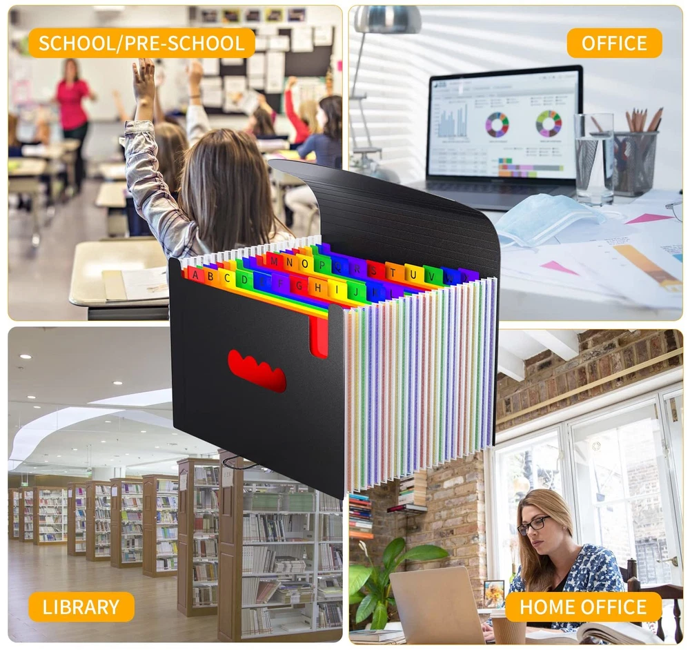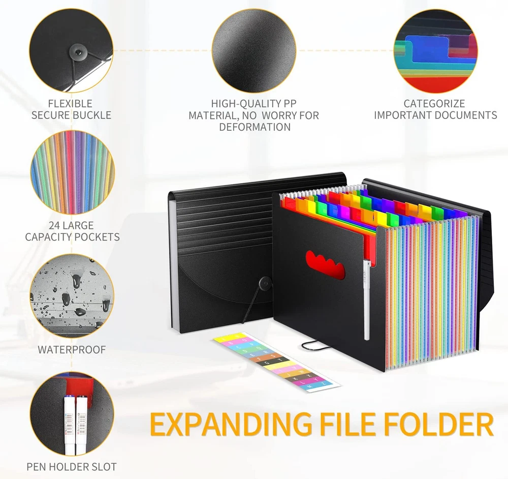 ㉔【EXPANDING & LARGE CAPACITY】Expandable 24 colorful individual pocket accordian file folders letter size is perfect file organizer for you organizing all kinds of important documents. It can be expanded from 1.18inches to 27inches. Each rainbow individual pocket of desk organizer can be expanded to 1.3inches. Accommodate approximately over 3000 sheets at one time. ㉔【MULTIPLE USAGE】Office important documents managing such as contract/ agreements/invoice/ bills/ receipt/meeting notes/notice/personal files...etc; Kids memories file managing such as special school projects/report cards/pictures/letters/medical information/ handed paintings...etc.; Lover’s memories managing such as special letters/special cards/special time record/small gifts/secret agreements...etc. Organizing of expanding file folder make fun! ㉔【EXCLUSIVE DESIGN】11 hot pressure strip and flexible secure buckle with non-specification stripe are designed on the lid of file folders, It looks very fashionable,artistic and unique. Elastic straps and secure buckle make sure safe transport and security. Humanized pen holder is designed at the front which is perfect to hang pens and use any time. Colored tabs design for each filing folders are ensuring each section can be instantly identified for quick access. ㉔【SAFETY&DURABLE MATERIALS】Accordion file organizer are made by high quality polypropylene and polyester, durable, not easy to be broken and deformed. 100% Waterproof, Non toxic, Non Odor, Anti-wear, tear and Moisture resistant. ㉔【PORTABLE & TIME SAVING】Colored High quality plastic file folders letter size is suitable for portable use. It is the best choice for taking files to library, school,studio,meeting...etc wherever you want to go, Take it safely and easily. It will save a lot of time for your office organizing, kids files organizing, school memorabilia organizing.