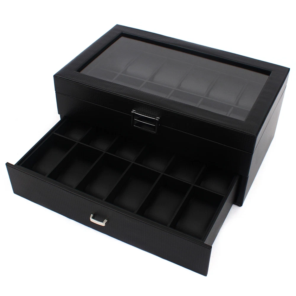 24 Slots Mens Watch Box Case Organizer Watches Jewelry Storage With Valet Drawer Watch Box 24 Mens Case Glass Top Black and Display Organizer Lockable Description The watch box is made of high-quality wood, carbon fiber, glass, plastic, and zinc alloy, which is strong, durable, and not easy to deform. It has two layers with a total of 24 compartments and a lot of storage space, which can meet your daily storage needs. Specification Color: Black Material: Wood, Carbon Fiber, Glass, Zinc Alloy Pillow Inner Material: Plastic Number of Compartments: 24 Shape: Rectangular Mounting Type: Freestanding Closure Type: Electroplated Latch Number of Drawers: 1 Net Weight: 3.4kg/7.5lbs Package Weight: 3.7kg/8.1lbs Product Size: 34*21*14.8cm/13.4*8.3*5.8inch Package Size: 34.5*23.5*17.5cm/13.5*9.2*6.8inch Package Included 1* Watch Box Details Exquisite Workmanship: This is a carefully crafted watch box. The premium carbon fiber grain and fine workmanship give it a luxurious texture. Dust-proof Design: The top lid and drawer can prevent dust from entering, which can keep the interior clean to save you a lot of cleaning time. High Light-transmitting Glass: The high light-transmitting glass at the top of the watch box provides a clear view of the watch's storage position and also allows for a better display of your watches. So you can easily find the watch you want. Good Materials: The watch box is made of high-quality wood, carbon fiber, glass, plastic, and zinc alloy, which is strong, durable, and not easy to deform. Good materials can extend its service life. Delicate Designed Pillow: The surface of the pillow is made of soft carbon fiber, which is anti-slipe and comfortable to touch so that the watch is better cared for. Compartment Design: This watch box has 2 layers of compartments for classified storage. This can make the space neater. You can easily find the watch, bracelet, necklace, earring, ring, and brooch you want. Large Storage Space: This product has two layers with a total of 24 compartments and a lot of storage space, which can meet your daily storage needs. Versatile: This product can be used to store not only watches in the first layer but also other items inside the second one. It is versatile and can meet your daily needs. Beautiful Appearance: The luxurious black casing with silver locking clasp gives the box a stylish, classic look. The black lining shows off the luster of your watch even better. A Good Gift: This watch box is an ideal gift for your mom, wife, husband, daughter, or girlfriend. It will be a practical and memorable gift. Key Features A Handle: There is a handle on the outside of the drawer for easier opening and closing. Electroplated Latch: The electroplated latch can prevent corrosion and rust, so it's durable. You can use it for a longer time. Guaranteed Customer Service: We aim to provide quality products and services. If you have problems, please feel free to contact us. We will reply and solve the problem for you as soon as possible. Application: It can be used to store watches, bracelets, necklaces, earrings, rings, brooches, and other accessories . It is also a great gift for your mom, wife, husband, daughter, or girlfriend. Notes Please allow the slight color difference caused by the shooting light and 1-3cm error due to manual measurement, and make sure you do not mind before ordering. Payment Delivery details Terms of sales About us Contact us Payment We accept ebay payment 。 Fees such as import duties, taxes are not included in the item price or shipping costs. These charges are the buyer's responsibility. Delivery details Shipping: 2-9 working days to: USA Terms of sales We maintain high standards of excellence and strive for hundred percent customer satisfaction. Feedback is very important to us. We hope that you contact us immediately before you give neutral or negative feedback, so that we can address your concerns. It is impossible to address issues if we do not know about them! About us Your satis faction is our ultimate goal. We work hard to earn your trust and future business. Our certified technicians have tested each item before shipping. The unit comes with 1 year limited warranty on all manufacturing defects. a) If you receive a defective item, you may return it or ask for a discount. Please contact us within 14 days after you receive the package. b) What you returned must be intact and in its original packaging as re? u. Customer is responsible for shipping costs of the returned item. c) We will cover the cost of shipping back t with the shipping rate indicated in the registration page. We will send you a new unit or refund the full payment you paid. Thank you. Contact us Business Hour Business Hour: Monday To Friday: 8:30 AM to 5:00 PM (Beijing China time) Due to time zones, our reply to your questions may not be immediately. But within above working time, we will reply your email within 24 hours. If it's non-workdays, please kindly be patient and wait till Monday. Please contact us with ebay message. Please feel free to contact us if you have any questions. Monday To Friday: 8:30 AM to 5:00 PM (Beijing China time) Due to time zones, our reply to your questions may not be immediately. But within above working time, we will reply your email within 24 hours. If it's non-workdays, please kindly be patient and wait till Monday. Please contact us with ebay message. Please feel free to contact us if you have any questions.