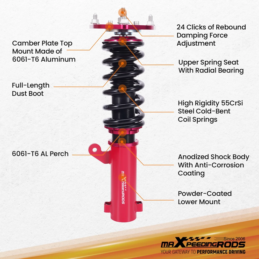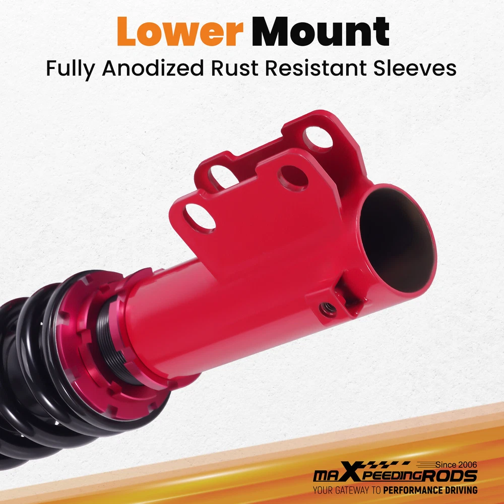 ZJPSS 24 Step Damper Coilovers Shocks Lowering Kit For Mitsubishi Eclipse 2000-2005 Coilovers 24 Way Damper Adjustable Lowering Kit for Mitsubishi Eclipse 2000-2005 Camber Plate with Pillow Ball Mount Provides More Precise Feel From Suspension And Steering Top Camber Plate with Pillow Ball Mount Provides More Precise Feel From Suspension And Steering Rebound Damping Force Adjustable 24 Step To Adjust Soft / Hard Adjustment According To Your Preference. Anodized Shock Body With Anti-Corrosion Coating Manufactured From High Quality T-6061 Billet Aluminum With Anodized Finish For Superior Strength And Corrosion Protection. Specification Front Spring rate 10 kg/mm (556 lbs/in) Rear Spring rate 7 kg/mm (392 lbs/in) Adjustable camber plate Yes Damping adjustable Yes, 24 levels of rebound damping force Height adjustable Yes, lowering 25-75mm depending on the vehicle models Package included 2 Front + 2 Rear Warranty 2 Years Maxpeedingrods' street coilovers are designed and developed for all motoring enthusiasts that want excellent handling without sacrificing comfort. This suspension system is ideal for daily driving and occasional, light track use. High quality components are adopted to ensure product durability and stability. Each application is fully test fitted and completely road tested to guarantee all our customers perfect performance and comfort expectations. Features 24 Clicks of Rebound Force Adjustment ---- Adjust Soft / Hard Adjustment According To Your Preference Height adjustable---lower your car 1-3 inches (depending on vehicle models) to get a performance ride Independent Ride Height and Spring Pre-load Adjustments Twin-Tube System for Comfortable Ride on Streets Coated finish to avoid rust Heavy Duty Steel Lower Mounts Simple install, easy to adjust. Application For Mitsubishi Eclipse (3rd-Gen) D53A/D52A 2000-2005 Specification Front top mount: Pillow ball with camber plate Rear top mount: standard rubber Damping adjustable: Available, 24 levels of rebound damping force Camber adjustable: Available Height adjustable: Yes, lowering 25-75mm depending on the vehicle models Front Spring Rate: 10 kg/mm (556 lbs/in) Rear Spring Rate: 7 kg/mm (392 lbs/in) Spring length Front: 200mm Spring length Rear: 200mm Spring Preload advised: 7-10 mm Color: Red body with black spring Package included 2 x Front coil-overs 2 x Rear coil-overs 1 x Allen wrench 2 x C spanners ★ 30-day Money Back & 12-Month Replacement Guarantee. Please feel free to contact us if there is any question. Height Adjustable Lowering Kit; 24 Clicks of Rebound Damping Force Adjustment; Independent Ride Height And Spring Tension Settings; High Rigidity 55CrSi Steel Cold-bent Springs; Anodized Shock Body With Anti-Corrosion Coating; Top Camber Plate with Pillow Ball Mount Provides More Precise Feel From Suspension And Steering; Full 1 Year Limited Warranty From Date Of Purchase. Other items you might also like MaXpeedingrods Coilover Suspension Lowering Kit For Mitsubishi Eclipse 2000-2005 Shipping Terms of Sales Payment Contact us All orders will be shipped within 1 business day after payment has been processed. For orders placed before 5:30 AM PST on business days, most items will be shipped out on the same day. All orders will be shipped with a tracking number via USPS, UPS, or FedEx Express and delivered within 2-6 business days We do not ship to P.O. Boxes, APO/FPO addresses, or Military Mail Boxes. Please ensure your address is confirmed by PayPal before checkout, as we only ship to confirmed addresses. 30-day free return and money back guarantee If you are not satisfied with your purchase, you can return the item with its original packaging to us for a full refund with no restocking fee. Please note that the return cost should be paid by the seller. One Year Unlimited Mileage Quality Guarantee If you receive incorrect items, items that are damaged during transportation, or defective items, we will accept returns and cover the return freight. Please note that the return cost should be prepaid by the buyer. After inspecting the faulty item, we will issue a refund of the return cost to the buyer. We offer a full refund or replacement for all faulty items, which includes the cost of original shipping. Please contact us before initiating a return. Our representatives will provide you with detailed instructions on how to proceed. Our guarantee covers only the cost of the item. We are not responsible for installation or other fees, such as labor, towing, additional repairs, or related expenses. We only accept payment through Paypal for all orders, which should be made through eBay. Paypal offers various payment methods, including credit card, direct debit, VISA, and others. For more information, please visit Paypal. Our customer service center is open 24 hours a day, seven days a week. If you have any questions, please don't hesitate to contact us. We are dedicated to providing excellent customer service and will do everything we can to ensure your satisfaction.