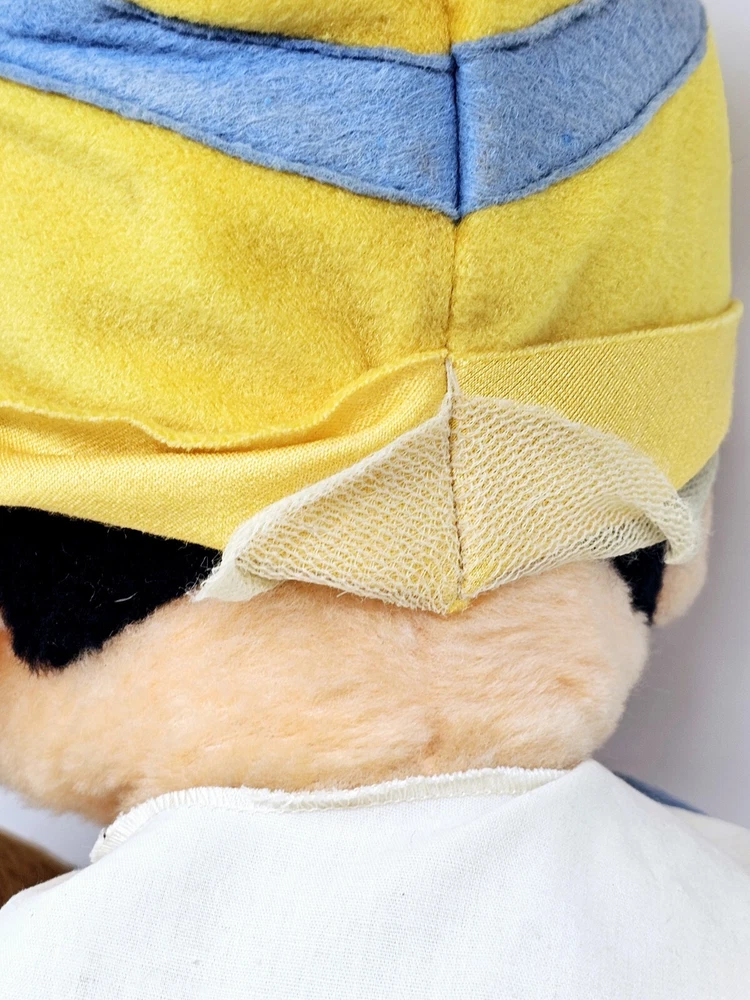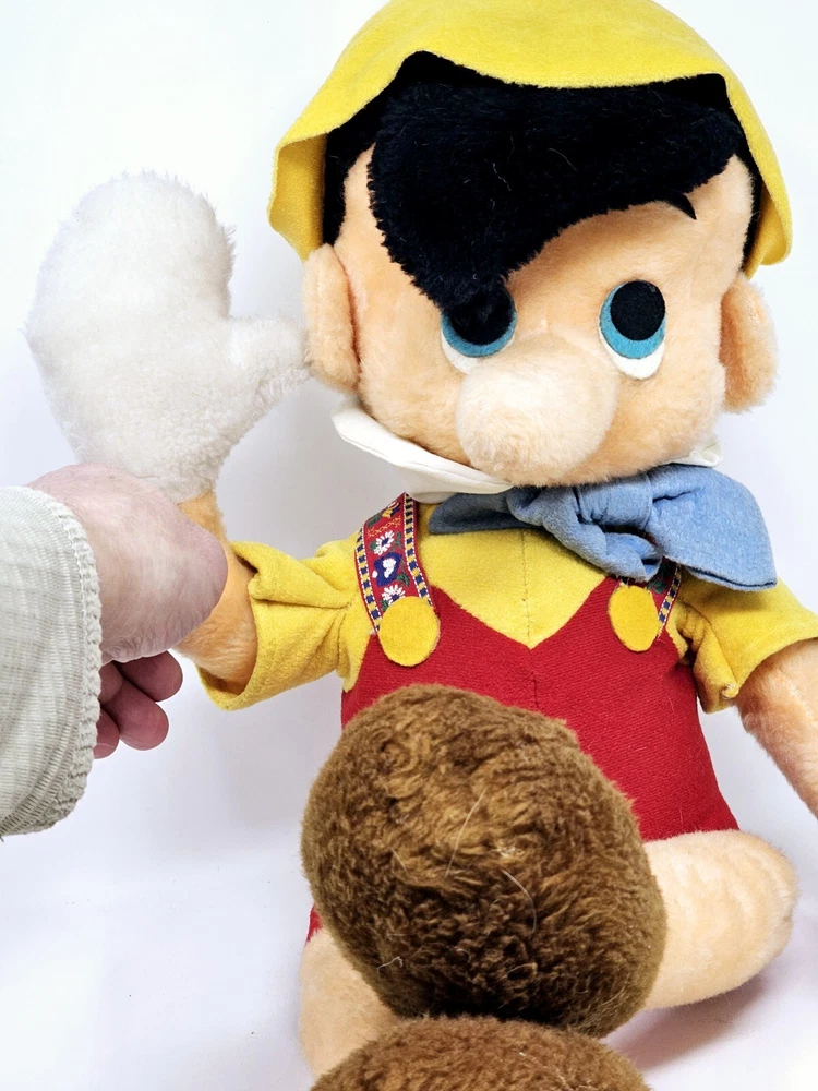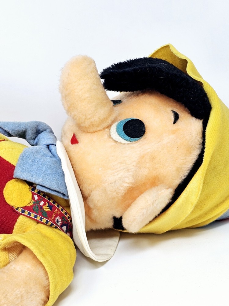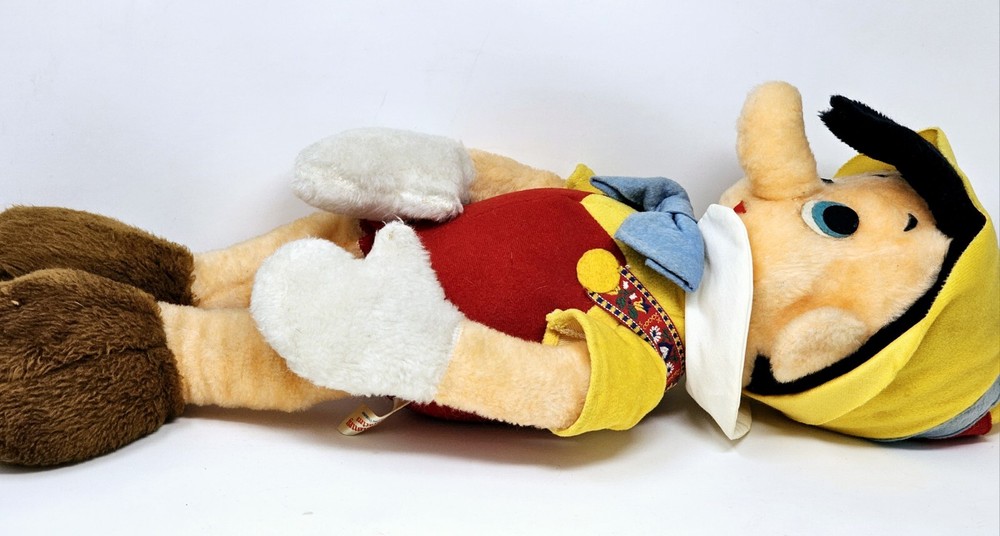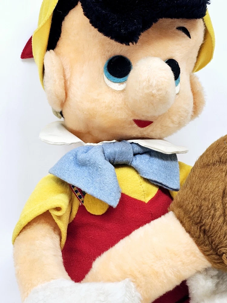 Large plush, shows some wear from the age. Eyes have some issues and small hole on right knee. Not sure about the back of head, but similar plush have the same thing. Please review pictures before purchasing to better understand the condition of the item. This is a 24" plush toy of the classic Disney character, Pinocchio. It features a cute and cuddly design that is perfect for Disney fans of all ages. The toy is made from high-quality materials and is based on the 1970s Disney movie, Pinocchio. It is a great addition to any collection of Disney memorabilia and is sure to bring joy and happiness to those who see it.