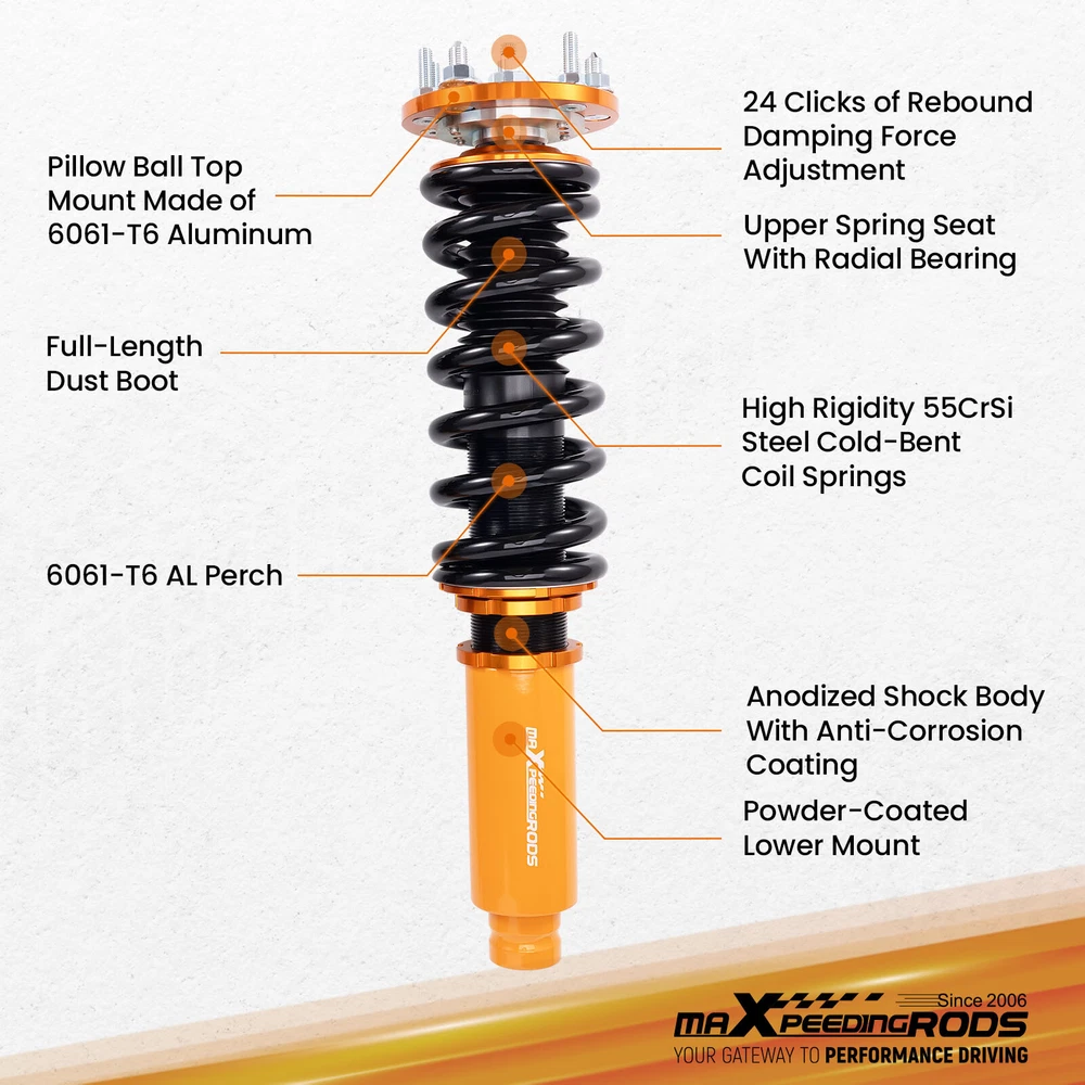 ZJPSS 24 Way Adjustable Coilovers Suspension Lowering Kit for HONDA ACCORD 2003-2007 Pillow Ball Mount Provides More Precise Feel From Suspension And Steering Pillow Ball Mount Provides More Precise Feel From Suspension And Steering Anodized Shock Body With Anti-Corrosion Coating Manufactured From High Quality T-6061 Billet Aluminum With Anodized Finish For Superior Strength And Corrosion Protection. Drops From 1 to 3 Inch From Factory Ride Height Full Threaded Absorber Tube Casing For Independent Height Adjustment. Durable Cold Wound Steel & Heat Treated Coils High Rigidity 55CrSi Steel Cold-bent Coil Springs - Over 600k Continuously Stress Test With 0.04% Distortion Rate. Pillow Ball Mount Provides More Precise Feel From Suspension And Steering Anodized Shock Body With Anti-Corrosion Coating Drops From 1 to 3 Inch From Factory Ride Height Durable Cold Wound Steel & Heat Treated Coils Specifications Adjustable damper Yes, 24 levels rebound damping adjustable Adjustable height Yes, Lowering 1-3 inch Front Spring length 230mm Rear Spring length 230mm Front spring length 10kg/mm(560 lbs/in) Rear spring length 6 kg/mm (336 lbs/in) Package Including 2 Front + 2 Rear Warranty 1 Year MaXpeedingrods coilovers offer excellent, versatile performance, durability and ride comfort over all road conditions. Featuring 24 levels of damping adjustment, the damper can be easily accessed and adjusted via a knob at the top of the damper mount. Simple adjustments can be made to tune to your desired style of driving and comfort level that you desire. This allows you to preset to soft damping for your daily drive and switch to hard damping for track days. Features - 24 Step to adjust soft / hard adjustment according to your preference - Ride Height Adjustable - Drops From 1 to 3 Inch From Factory Ride Height - 55CrSi high strength durable cold wound steel & heat treated coils - Manufactured from high quality T-6061 billet aluminum with an anodized finish for superior strength and corrosion protection. - Improved Handling and stability without premature tire wear - Improved Vehicle Stability and traction in hard cornering situations - Full threaded absorber tube casing for independent height adjustment - Twin-Tube System for Comfortable Ride on Streets - Fully Rebuildable With All Parts Available Application For Honda Accord VII 4-door sedan CM4/CM5/CM6 2003-2007 For Honda Accord VII 2-door coupe CM7/CM8 2003-2007 For Honda Inspire 2003-2007 (Japan market only) For Honda Acura TL/TL Type-S 2004-2008 Specificaions - Height adjustable: Yes, lowering 25-75mm depending on the vehicle models - Spring Rate Front: 10 kg/mm (560 lbs/in) - Spring Rate Rear: 6 kg/mm (336 lbs/in) - Front spring inner diameter: 70.5mm - Rear spring inner diameter: 70.5mm - Spring length Front: 230mm - Spring length Rear: 230mm - Spring Preload advised: 7-10 mm - Color: Golden body with black spring Product included 2x front coil-overs 2x rear coil-overs 2x C spanners ★ 30-day Money Back & 12-Month Replacement Guarantee. Please feel free to contact us if there is any question. Height Adjustable Lowering Kit; Independent Ride Height And Spring Tension Settings; 24 Clicks of Rebound Damping Force Adjustment; High Rigidity 55CrSi Steel Cold-bent Springs; Anodized Shock Body With Anti-Corrosion Coating; Top Pillow Ball Mount Provides More Precise Feel From Suspension And Steering; Full 1 Year Limited Warranty From Date Of Purchase. Other items you might also like Set(4) Full Coilovers Struts Suspension For Honda Accord 2003-2007 Height Adjust MaXpeedingrods Coiloves 24 Way Damper Suspension Kit for Honda Accord 2003-2007 MaXpeedingrods Coilovers Shocks+Springs For Honda Accord 03-07 / Acura TSX 04-08 Adjustable Coilover 24 Ways Shocks Struts For Honda Accord 2003 2004 2005 2006 Coilovers 24 Way Damper Adjustable Suspension Kit For Honda Accord 2003-2007 Coiloves Shock Kit w/ 24-way Adjustable Damper for Honda Accord 2003-2007 Front + Rear Coiloves 24 Way Damper Suspension Kit for Honda Accord 2003-2007 Coiloves Suspension Kit 24 Levels Adj. Damper for Honda Accord 2003-2007 MaXpeedingrods Coilovers Suspension Lowering Kit For Honda Accord 2003-2007 24 Way Damper Coilovers Kit For Honda Accord 03-07 Suspension Shocks Struts 24 Levels Damper Adjustable Coilovers Lowering Kit For HONDA ACCORD 03-07 Racing Coilovers Set Fit Honda Accord 2003-2007 Height Adjustable Struts Shocks Shipping Terms of Sales Payment Contact us All orders will be shipped within 1 business day after payment has been processed. For orders placed before 5:30 AM PST on business days, most items will be shipped out on the same day. All orders will be shipped with a tracking number via USPS, UPS, or FedEx Express and delivered within 2-6 business days We do not ship to P.O. Boxes, APO/FPO addresses, or Military Mail Boxes. Please ensure your address is confirmed by PayPal before checkout, as we only ship to confirmed addresses. 30-day free return and money back guarantee If you are not satisfied with your purchase, you can return the item with its original packaging to us for a full refund with no restocking fee. Please note that the return cost should be paid by the seller. One Year Unlimited Mileage Quality Guarantee If you receive incorrect items, items that are damaged during transportation, or defective items, we will accept returns and cover the return freight. Please note that the return cost should be prepaid by the buyer. After inspecting the faulty item, we will issue a refund of the return cost to the buyer. We offer a full refund or replacement for all faulty items, which includes the cost of original shipping. Please contact us before initiating a return. Our representatives will provide you with detailed instructions on how to proceed. Our guarantee covers only the cost of the item. We are not responsible for installation or other fees, such as labor, towing, additional repairs, or related expenses. We only accept payment through Paypal for all orders, which sho