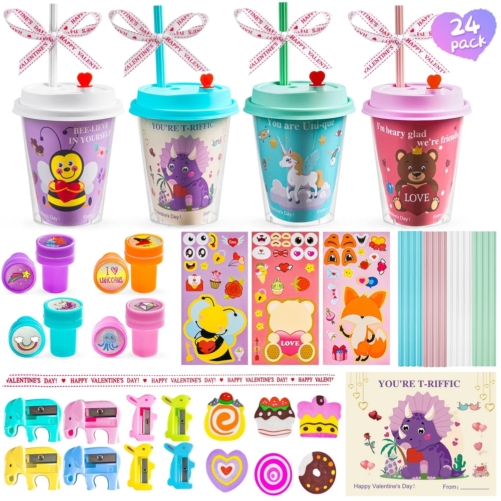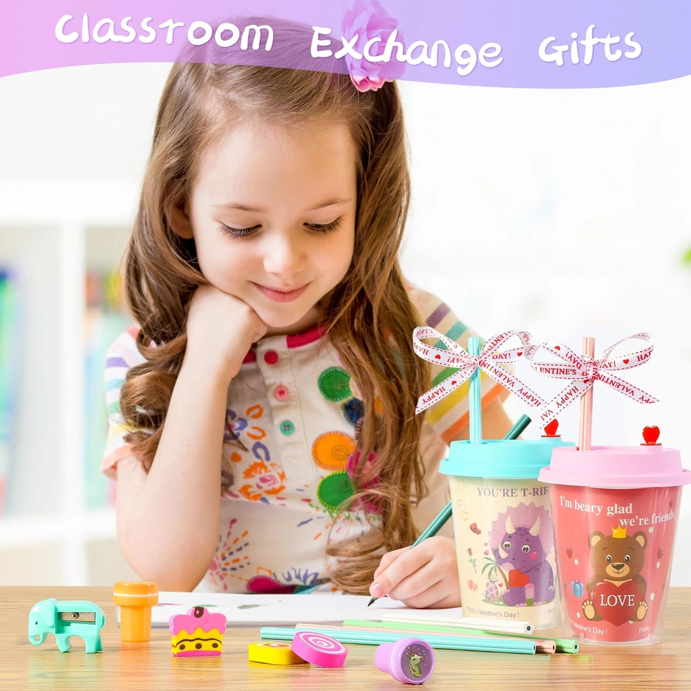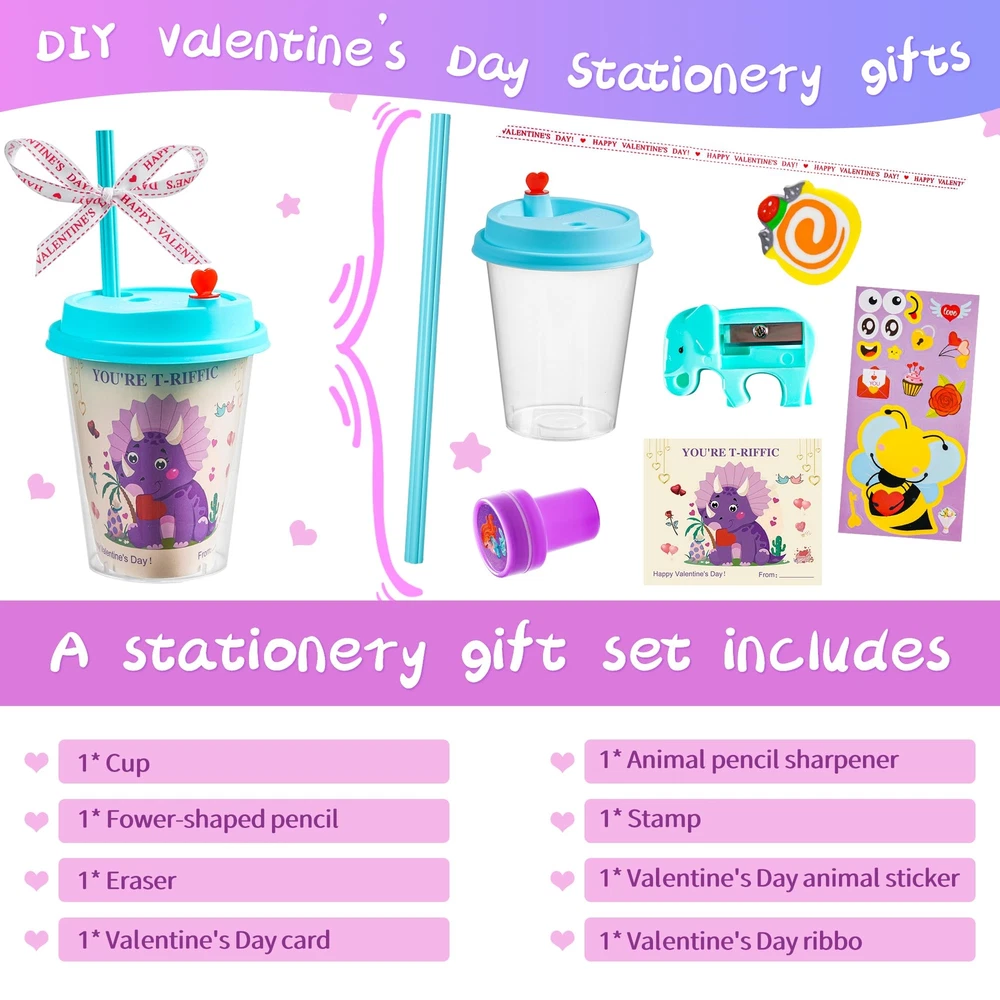 💖【VALENTINE’S DAY STATIONERY SET】: Includes 24 Mugs (4 colors), 24 Greeting Cards (4 styles), 24 Stickers (3 styles), 24 Erasers (6 styles), 24 Pencils (4 colors), 24 Pencil Sharpeners (2 styles), 24 Stamps (20 styles), and 24 Happy Valentine's Day Ribbons. The Valentine's Day Stationery Set is sure to be a hit with the kids with its macaroon colors.Note: The package you received we put the rubber in the cup, please open the cup! 💡【UNIQUE SWEET VALENTINE'S DAY DESIGN】: The items in the Valentine's Day Gifts for Kids have been carefully designed with sweet Valentine's Day elements, erasers and Valentine's Day stickers have cute and cozy heart shapes, the stamps come in 20 random patterns, and the pencils are in the shape of macaroon colored flowers. Kids Valentine's Day cards are designed with cute animals and funny puns. 🌸【SAFE MATERIALS】: the mug with four macaroon colored lids is 3.45 inches tall, the mugs are reusable, the mugs, stamps, and pencil sharpeners are made of safe plastic, non-toxic, and all stationery is safe to use. 💝【VALENTINE'S DAY CLASSROOM EXCHANGE】: The Valentine's Day stationery set is the perfect classroom exchange gift to enhance your child's interest in learning, let them celebrate Valentine's Day with these cute and practical stationery. 🎁【CHILDREN'S VALENTINE'S DAY GIFT】: Can be used as Valentine's Day party, exchange gift, children's classroom Valentine's Day gift, children's Valentine's Day card, Valentine's Day party favors, Valentine's Day pencils, Christmas gift, Thanksgiving gift, Birthday gift and so on!