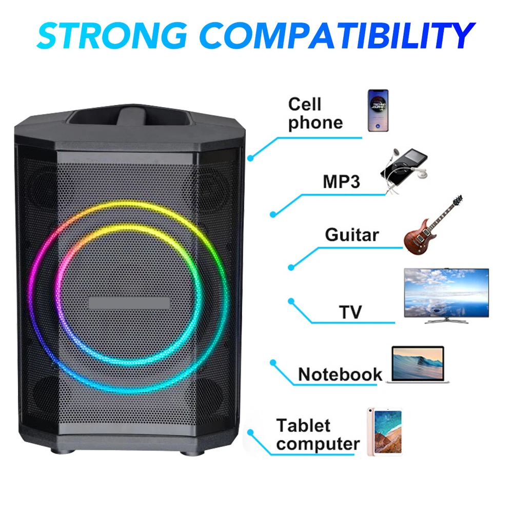 2400W Portable Tiltable Bluetooth Speaker Subwoofer Heavy Bass Sound System +Mic Features 🔊 Tiltable Design: Easily adjust the speaker angle for enhanced acoustics and a personalized listening experience. 🎶 Party Mode: Activate the sound-activated LED ring light to add an electrifying visual element to your gatherings. 🎚️ Audio Settings: Fine-tune your sound with volume, treble, and bass controls. Connect via Bluetooth, USB, TF, FM, or auxiliary for versatile listening. 📡 Wavesync Technology: Pair two SP-880RBT speakers for a powerful sound output that fills any space. 🔋 High Capacity Battery: Enjoy up to 5 hours of playback at 70% volume with the built-in 3000mAh battery—perfect for extended parties. 🏕️ Portable & Versatile: Take the music along, whether at backyard barbecues, beach parties, or camping trips! Specifications Material: ABS Size: 13.8 x 10.3 x 11 inches Weight: 8 LB Color: Black Charging Time: 5 hours Playing Time: 3-7 hours Audio Controls: Volume, Treble, Bass Light Feature: Sound-activated LED ring light with dedicated switch Sound Board: Dual channel Main Inputs: Bluetooth, USB, TF, FM, AUX Auxiliary Input: 3.5mm Jack Microphone Input: One 1/4” jack with volume and echo controls Woofer: 8” with a 100 oz magnet Tweeter: Piezoelectric Music Power: 2400 Watts Battery: Built-in 3000mAh 7.4V Lithium-ion Package Includes 1 x 8" Speaker 1 x Wireless Microphone 1 x Remote Control 1 x AC Adapter Shipping Payment Return & Refund policy Feedback Customer Support - Contact Shipping FREE SAME BUSINESS DAY MONDAY- FRIDAY SHIPPING FROM USA. All orders and payments received before 4PM EST (1PM PST) will be shipped the same business day. All other orders within 1 business day. No shipping on Weekends or US Public Holidays. No responsibility for any custom duty Shipping information will be updated when available. Payment We accept payment via PayPal. Use PayPal at checkout to pay with credit or debit. Immediate payment is required. Shipping will be arranged within 1 business day once payment is cleared. Return & Refund policy 1.We stand behind our items and offer 60 days warranty. All items are in new and working condition unless specified otherwise elsewhere in the description. 2.All Returns - defective or otherwise - MUST BE PREAUTHORIZED to guarantee refund or exchange. Please contact us to get an authorization and return address. 3.Buyer agrees to pay for the cost of re-shipment for undeliverable or wrong addresses. 4.Buyer is responsible for Return Postage as well as a 20% restocking fee if return/replacement is not a result of our mistake such as wrong item. 5.Replacement or Refund will be made upon receipt of the returned item. Please include tracking number so we can process ASAP. If you do not wish to wait for a replacement, please repurchase the item. 6.ALL REFUNDS will be processed via PayPal. Please double check via PayPal history and transaction for confirmation. PayPal will send it back to whatever you used to pay within 3-5 days. Feedback We strive to provide the best products and services. If anything about your transaction did not meet expectations, please CONTACT US and give us the opportunity to make things right. We are always here to help. Customer Support - Contact Please do not hesitate to CONTACT US. You can message 24/7 on eBay for all questions and inquiries. We will get back to you within 1-2 business days at the latest.