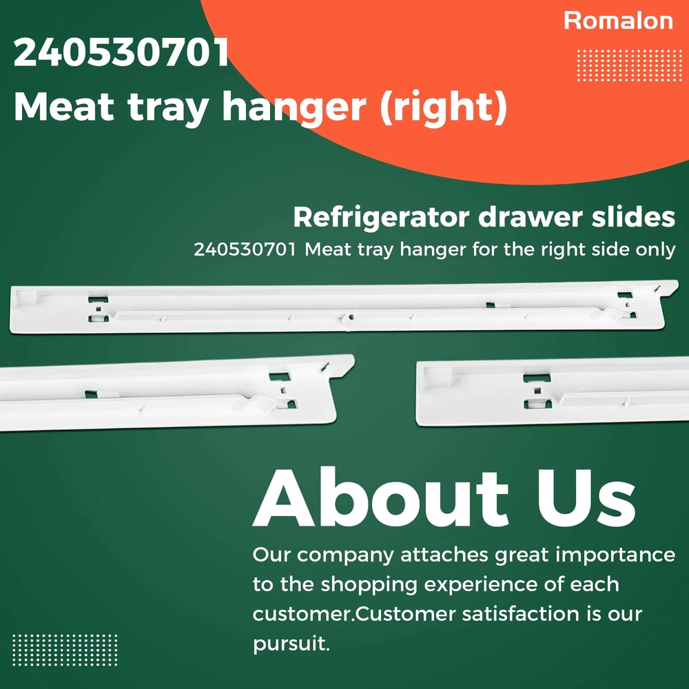 240530701 Right Pan Hanger make sure that everything in your refrigerator is safe and in place. Replaceable Part Number:AP2116590, PS430917, EAP430917, 917558, 240460501 High Quality: The part is made from durable high-quality material and well-tested by the manufacturer. Non original aftermarket part, fits OEM standards. Fix the following Issues: Broken tray rail Sliding pan fall out of its place Exact fitable Models for Your Reference: For Frigidaire:FFHI1817LB0, FFHI1817LS0, FFHI1817LW0, FFHI2117LB0 For Kenmore: 253.60525300, 253.63012300, 253.63014300, 253.60723300 For Crosley: CRTE183AQ0, CRTE183AW0, CRTE183IAW0, CRTE183IAW2 For White-Westinghouse:WRT18G4AQ0, WRT18G4AW0, WRT18MP5AQJ, WRT18MP5AW2 Ensure Proper Fit Tips: Make sure you put in the correct model number. For the Kenmore products, you need to know the model number plus the year as they are often listed with the year as part of the number on this site. It was super easy to fix. Remove the shelf, unscrew the old rails, put on the new rails, and screw them in. NOTE: The mention of brand names and any related model designation above is only for purposes of demonstrating compatibility. Replaceable Model: 240530701 Meat tray hanger for the right side only. 240530701 replaces 240460501, AP2116590, PS430917, EAP430917, 917558. Please check the size of your fridge pan rack before purchasing High Compatibility: This meat pan rail is designed to be fit for most top brands of fridges. It is fit for Cro-sley Frigi-daire Gi-bson Ke-lvinator Ken-more White Wes-tinghouse Superior Quality: 240530701 Fridge drawer slide bracket is made of high density durable plastic. It has a stronger resistance to wear and tear than the average product, making it more durable while ensuring a long product life. Choosing our durable fridge hangers will reduce frequent replacements and save you money Easy To Install: Remove the shelf, unscrew the old rails, fit the new ones and screw them back on. Super easy to fix. Note: Before installing the product, please disconnect the power supply and wear work gloves to protect your hands About Us: Our company attaches great importance to the shopping experience of each customer.Customer satisfaction is our pursuit