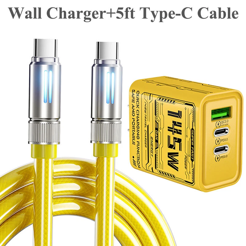 Description: 240W fast charging is universal High power to low power 240/140100/60/30W device data cable is fully compatible Multi-protocol full device support can be switched between mobile phones, tablets and other devices 240W fast charging PD full series compatible Support iPhone7-iPhone15 Samsung and other mobile phones compatible Colorful atmosphere lights make night charging more convenient With soft colorful atmosphere lights, you can clearly find your phone when charging at night Zinc alloy material anti-oxidation process Plug and unplug at will, intact as new, full of texture Bend at will, long-term use without breaking After 20000+ Bending test, wear-resistant and non-breakage, longer service life Thickened gold-plated copper wire, faster and more stable charging Increased conductive area, reduced resistance, smoother charging and transmission, more stable and faster Product name: liquid silicone data cable Interface: Type-C/USB-A/8pin Function: charging + data transmission Material: zinc alloy + liquid silicone Transmission speed: 480Mbp/s Current: 2.4A/5A Length: 1.5m Color: yellow Applicable models: Applicable to Apple/Android/Type-C interface devices Includes: 1 1.5m 240w liquid silicone data cable