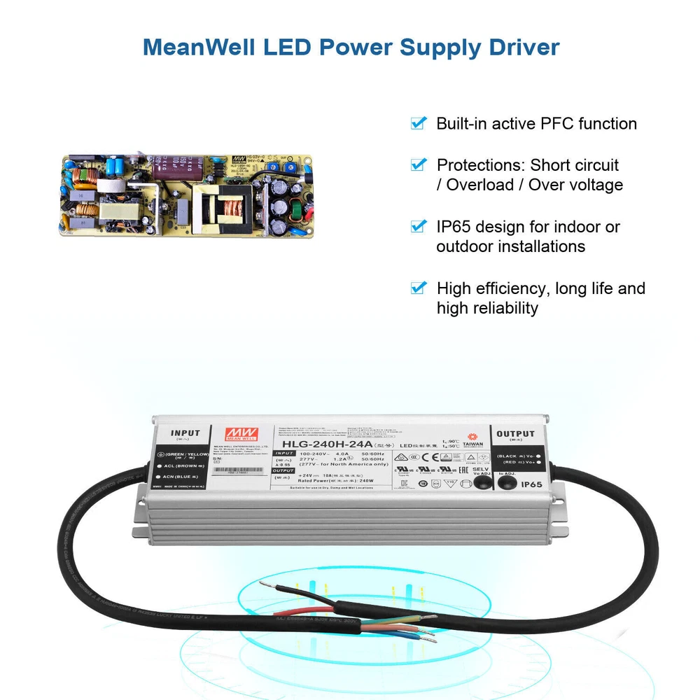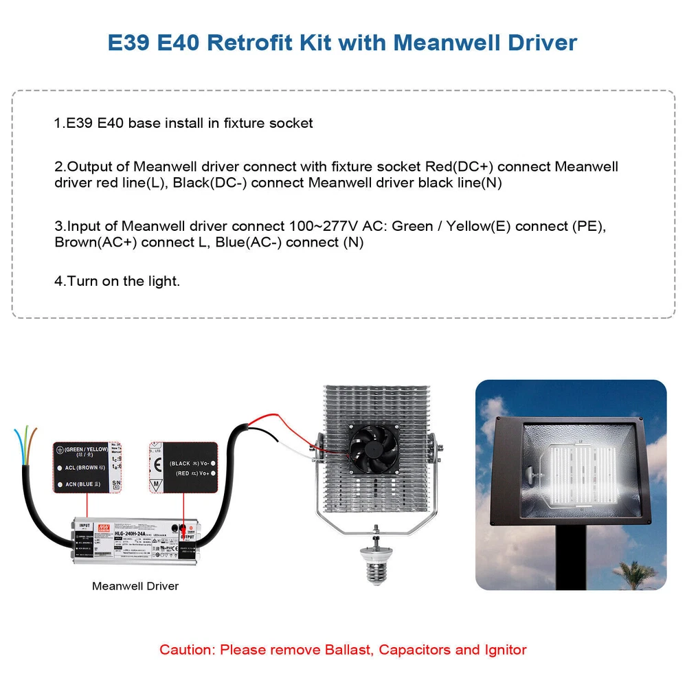 Product Description 240Watt LED Retrofit lIT fOR Parking Lights Replace 1000W HID MH Fixture 5000K The LED Light Retrofit Kits are commercial and industrial grade LED lighting solutions for area post top lights, shoe box parking lot lights and high mast lighting for large area lighting solutions. It's an ideal option for updating your parking lot lighting. Super Bright Shoexbox LED Retrofit Kits - With outstanding 145 lumens per watt, the led retrofit kit provides 34,800 lumen output. This 240 watt led light is a perfect replacement for a 1000W MH/HPS/HID bulb ,typically appearing brighter and also providing more than 90% in energy savings.80+ CRI Rating and 5000K for super bright outdoor large area lighting Maintenance Saving - Advanced SMD3030 LEDs and Meanwhile Driver for superior performance and longer lifespan.Excellent heat dissipation system with overheat protection sensor, aluminum heat sink and high speed fan to protect leds at lower operating temperature. Longer lifespan of 500,00 hours, that's about 23 years of 6 hours per day,which will reduce maintenance cost dramatically. Quick Installation - The led retrofit kits come with E39 Mogul Base - Just screw in. Replace the ballast with the LED Driver and old bulb with the LED light. No need to replace existing fixtures. Adjustable U bracket for horizontal and vertical mounting. Please check retrofit kit picture and dimensions to ensure fitment. Wide Application - High Bay led retrofit kit is perfect for retrofitting existing high bay,low bay, wall pack, led parking lot pole lights,led tennis court lights,led shoebox light, and many other types of fixtures. Great solution for commercial electrical contractor or project managers! 5 Year Warranty - ETL DLC listed, which ensures Rebate Eligible and lowest maintenance. We also offer 5 years warranty for the 1200 watt metal halide led replacement retrofit kits. Specification Rated Power: 240W Power Supply: MEANWELL Driver Input Voltage: 100V-277V 50/60Hz CCT: 5000K Operating Temperature:-31ºF-131ºF LED Chip: SMD 3030 Lifespan: > 50,000 Hours Materials: Aluminum Equivalent:500-1000W HID 240W Shoebox LED Retrofit Kit Equivalent up to 1000W led parking lot pole lighting with 34,800 lumens @ 240 watt parking lot led retrofit kits,typically appearing brighter and also providing more than 90% in energy savings. You can reduce a tremendous amount of energy consumption. Adjustable LED Retrofit Kit Comes with adjustable U bracket designed for horizontal and vertical mounting, you can adjust the light according to your needs. Please check the retrofit kit pictures and dimensions to ensure fitment. Better Cooling System The advanced cooling system uses a specially designed fan, heatsink and automatic thermal sensor which can protect the light from burning out and achieve 50,000+ hours lifespan. Great Solution for Contractor E39 Mogul Socket Mount Adapter Included. Reduce energy costs and maintenance costs dramatically Save money for your business or organization. Keep your old Light Fixture Retrofitting to retain your property’s existing aesthetics, especially when it already matches your desired architectural design. Lower your energy bills, often with government or utility rebates and no more maintenance. Superior MEANWELL Driver We use high quality components for long lifespan. Long will reduce maintenance cost dramatically. The power supply is separate from the light source, which is a big plus! Installation Steps: 1.Caution: Please remove Ballast, Capacitors and Ignitor. 2. Please fix the retrofit kit in fixture socket with screws(Recommended) Or E39 E40 install in fixture socket 3. Output of LED Power Supply: Red Wire (L) to connect Red Wire(DC+) of the light panel;Black Wire (N) to connect White Wire(DC-) of the light panel; Input of LED Power Supply(AC 100-277V): Green/Yellow Wire(GND) to connect Ground Wire; Brown Wire(AC+) connect Live Wire; Blue Wire (AC-) connect Neutral Wire 4.Turn on the light About Us Payment Shipping Returns Contact Us SHENZHEN NUOGUAN TECHNOLOGY CO. LTD founded in 2010. We are high-technology comany specialized in manufacture Commercial and industrial LED light. Advanced production equipment and excellend R&D ability help us to combining service ,production sell together provide top-level products to our customers. 1. Payment is expected within 7 days of auction close. Or Unpaid Items will be forfeited per eBay . 2. Taxes may be applicable at checkout as states adopt new laws and regulations regarding sales tax collection. 1. We ONLY ship to USA . 2. Orders processed within 1-2 business day of payment verification. There’s no Delivery service or courier service on Saturdays, Sundays or Public Holidays. 3. We have 3 different warehouse in US,so due to stock status and time differences, we will choose to ship your item from our first available warehouse for fast delivery. 4. We offer Free Shipping within the Lower 48 states! All packages are sent via UPS or USPS.The delivery time for UPS Ground is typically 2-5 business days. We strive to ensure 100% satisfaction for each and every one of our customers. we offer a 30-day 100% money-back guarantee on all eBay orders. If your item isn't just as you wished, simply send it back to us and we'll refund or replace your item. Please note that all returns must be authorized by our Customer Service department. please contact us though message first if you have any problem. USA Warehouse. Fast shipping! We are appreciated your purchasing form our eBay store. Office Time: 9:30 - 18:30, Monday - Saturday (UTC+8) Please contact us with eBay Message. We will respond you within 24 hours on business day. About Us SHENZHEN NUOGUAN TECHNOLOGY CO. LTD founded in 2010. We are high-technology comany specialized in manufacture Commercial and industrial LED light. Advanced production equipment and excellend R&D ability help us to combining service ,production sell together provide top-level products to our customers. Payment 1. Paym