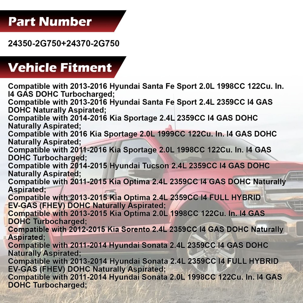 [100% Brand New] - Driver And Passenger Side Assembly Pair In Box [Fully Plug & Play] - No Rewiring Necessary [Whats Included] - Headlight Housing Only; No Bulbs Included [SAE DOT Approved] - Meets All Regulations In USA & Canada Only [60 Days Love It or Return It] - Money Back Guarantee Free Shipping 100% Quality Guarantee 30-Days Moneyback Rev up your ride with top-quality auto parts at our one-stop automotive store! Store Categories Pair Camshaft VVT Gears For HYUNDAI KIA Sportage Tucson Optima Santa 243502G750 Features Brand New - Fitment is 100% prefect as OEM fitment. Exact fit - No modifications required It is backed by our warranty (12 month). Part Number: 24350-2G750,24370-2G750 Fitment: For 2013-2014 Hyundai Santa Fe Sport 2.0L 1998CC 122CU. IN. L4 DOHC Turbocharged For 2016-2016 Hyundai Santa Fe Sport 2.0L 1998CC 122CU. IN. L4 DOHC Turbocharged For 2013-2016 Hyundai Santa Fe Sport 2.4L 2359CC L4 DOHC For 2011-2014 Hyundai Sonata 2.0L 1998CC 122CU. IN. L4 DOHC Turbocharged For 2014-2014 Hyundai Sonata 2.4L 2359CC L4 DOHC For 2014-2015 Hyundai Tucson 2.4L 2359CC L4 DOHC For 2011-2015 Kia Optima 2.0L 1998CC 122CU. IN. L4 DOHC Turbocharged For 2011-2015 Kia Optima 2.4L 2359CC L4 DOHC For 2012-2015 Kia Sorento 2.4L 2359CC L4 DOHC For 2011-2016 Kia Sportage 2.0L 1998CC 122CU. IN. L4 DOHC Turbocharged For 2011-2016 Kia Sportage 2.4L 2359CC L4 DOHC Components Intake Camshaft Timing Gear X 1 PCS Exhaust Variable Timing Sprocket X 1 PCS ABOUT AUTOTO Welcome to AUTOTO, your one-stop shop for automotive parts! We specialize in providing high-quality components for cars. With our extensive range of products, you can find everything you need to keep your vehicles running smoothly. Our number one goal is to provide the best online shopping experience for our customers. SHIPPING Orders are shipped from our warehouses located in Kentucky and New Jersey depending on availability. AUTOTO offers free shipping with free return on orders purchased within the 48 US States, excluding PO Box, Military APO/FPO, Hawaii, Alaska, Puerto Rico, Virgin Islands, and Guam. RETURNS Not satisfied with your purchase in any way? Return it for a full refund within 30-days. VIP BENEFITS We will open VIP customer treatment, if you meet the following conditions, please take the initiative to contact us 1.You are a wholesaler or retailer 2.You are equipment maintenance factory 3.You are an audiophile or heavy user 4.You have purchased products from our store/brand, have good experience and want to purchase again. Tell us and you will get different levels of coupons and one-on-one customer service! ABOUT VIPMOTOZ Based in Southern California, VipmotoZ has been in the aftermarket autoparts industry since 2012. Our number one goal is to provide the best online shopping experience for our customers. Love It or Return It. SHIPPING Orders are shipped from our warehouses located in California and South Carolina depending on availability. VipmotoZ offers free shipping with free return on orders purchased within the 48 US States, excluding PO Box, Military APO/FPO, Hawaii, Alaska, Puerto Rico, Virgin Islands, and Guam. RETURNS Not satisfied with your purchase in any way? Return it for a full refund within 60-days. CONTACT US Got a question, need a return/exchange or recommendation on a product? AUTOTO customer service team is here to help! AFTER SERVICE We are committed to providing high-quality, sustainable use of the product, but due to the diversity of product models, the complexity of the use of the scene, the differences in the conditions of transportation, it is still unavoidable to produce after-sales problems, but please rest assured that we will strive to give solutions; Message Us On Apr 25, 2025 at 00:16:44 PDT, seller added the following information:
