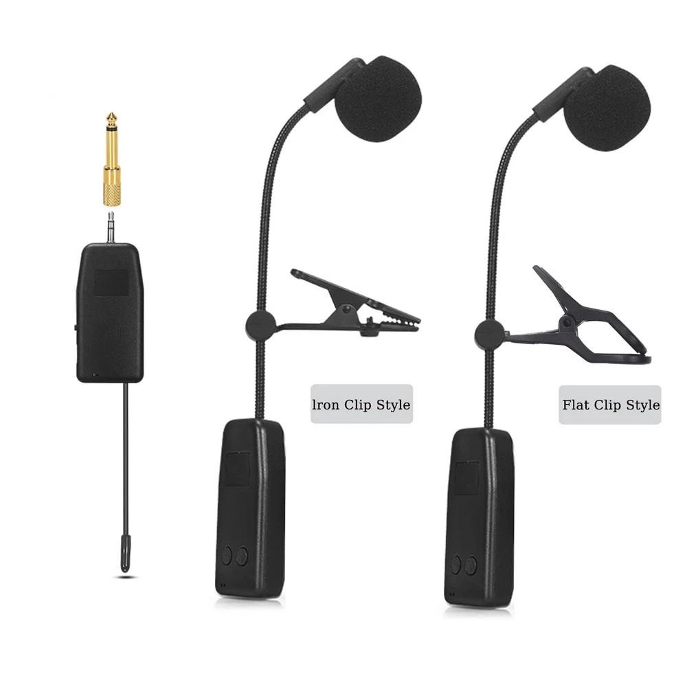 【2.4G Wireless Microphone】2.4G latest wireless technology, stable signal, no delay, no interference from home WIFI signal.The professional microphone is designed for Orchestra Trumpet Saxophone and other similar musical instruments, with better quality, bring your excellent experience. 【High-sensitivity Pickup Sound】Built-in highly sensitive condenser microphone,perfectly capture the soundtrack of the instrument,make the sound more clear and realistic. 【Detachable Clip & Handheld Design】: The Clip is detachable, you can fix the mic on the cloth or instruments, what's more, it is handheld, you can use mic in your hand freely, and it is made of special material, stable and enduable. 【Wide Application】The wireless mic with voice amplifier, speaker system etc.Apply for concerts, band performances, personal exercises, band exercises.Wind music wireless microphone,suitable for all kinds of brass instruments such as trumpet, large, horn, trombone.Included a 3.5mm(1/8") to 6.35mm(1/4") Adapter. 【Super Battery Life】built-in 450mAh rechargeable lithium-ion battery, 2 hours charge, 10 hours available, red light on when charging, red light off when fully charged.