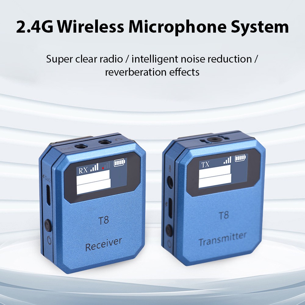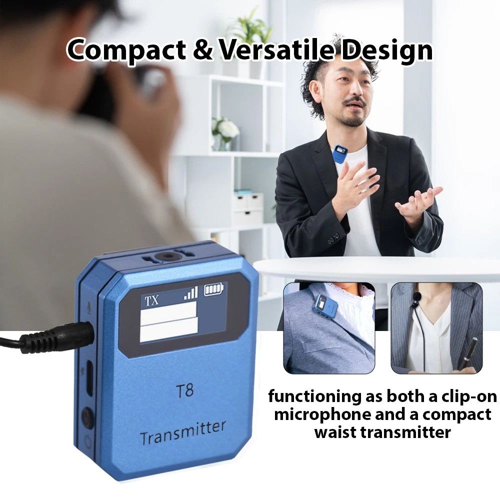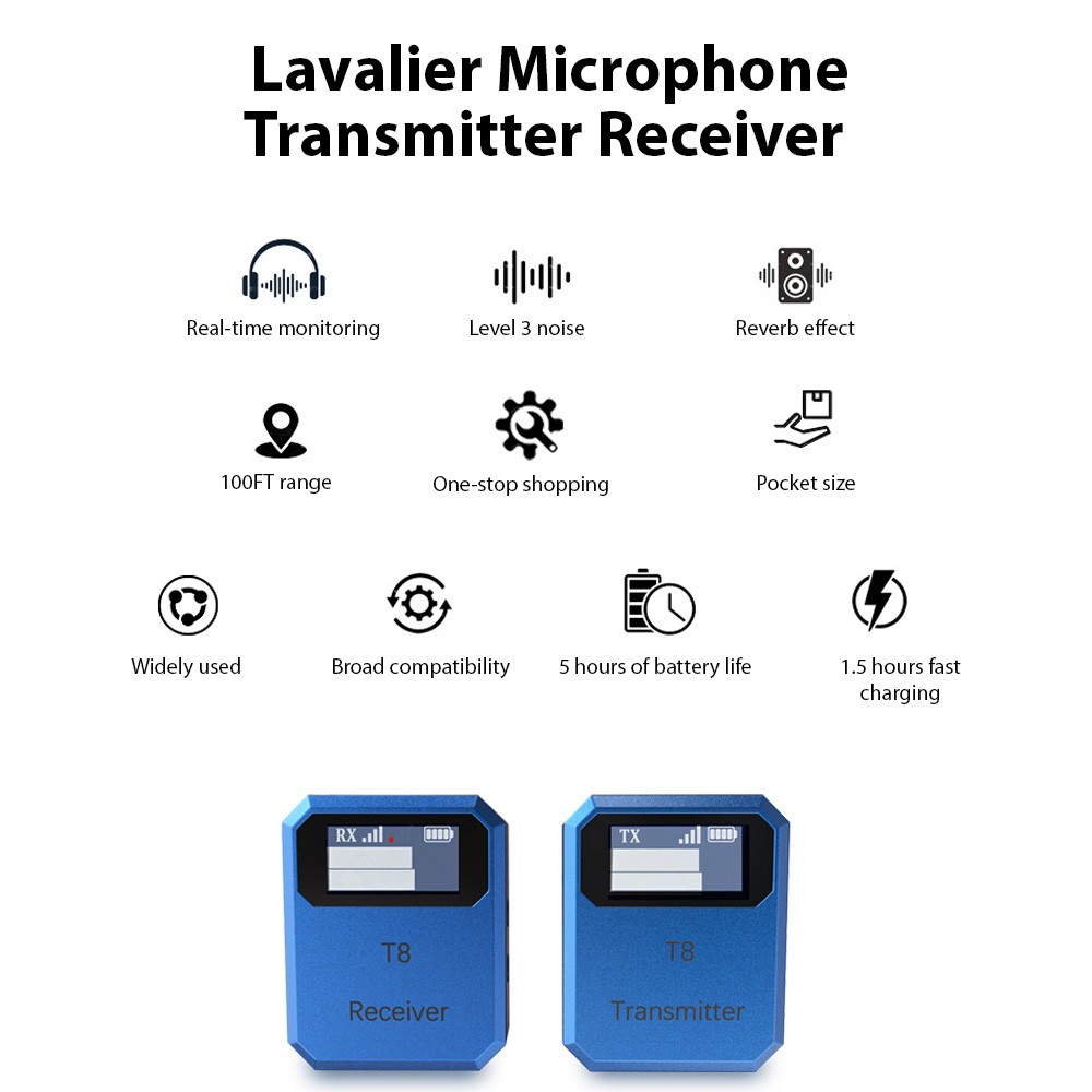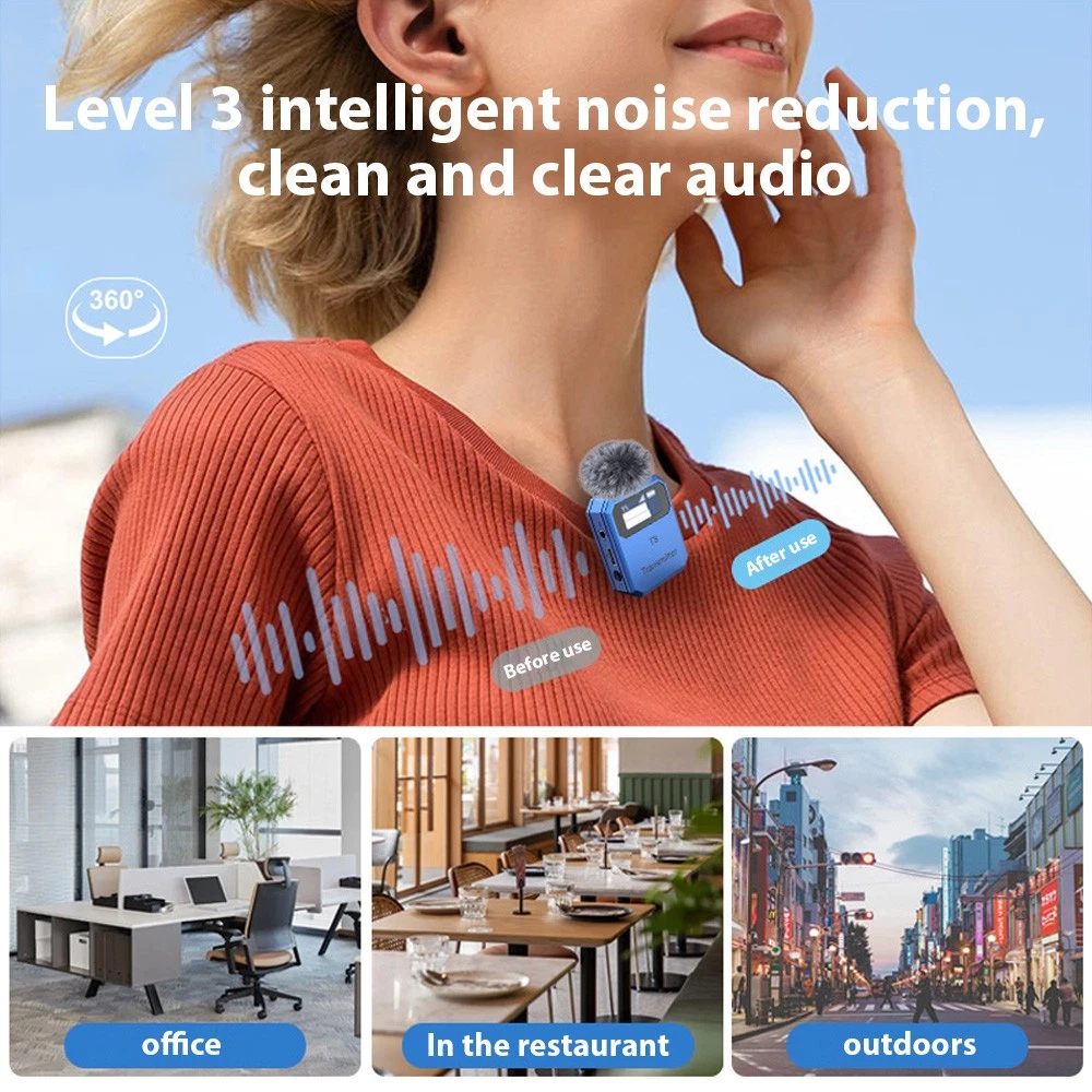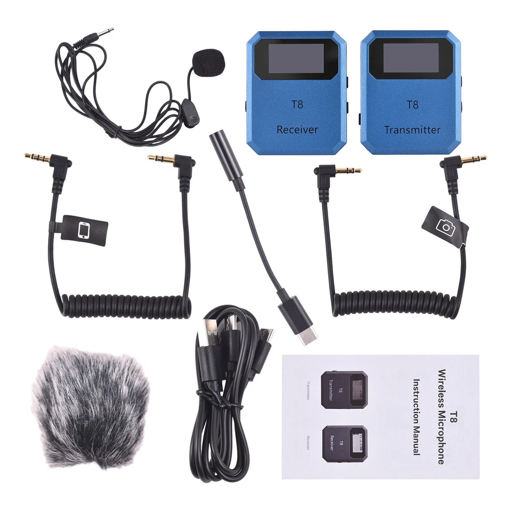 Feature: 1. Seamless Connection: Experience effortless audio capture with our Wireless Lavalier Microphone System, featuring automatic pairing for instant plug-and-play use. Simply turn on the microphone and mic receiver to start recording without any complicated setups. 2. Compact & Versatile Design: This mini microphone is designed for versatility, functioning as both a clip-on microphone and a compact waist transmitter. Its lightweight construction makes it easy to carry, ensuring you can take your wireless mics anywhere. 3. Exceptional Sound Quality: Our high-sensitivity lapel microphone provides 360° omnidirectional sound pickup, capturing every detail with clarity. Enjoy real-time monitoring and adjustments, allowing you to listen and tweak settings while recording. 4. Noise Reduction & Wind Protection: Equipped with an advanced noise reduction chip, this microphone minimizes environmental noise interference, making it ideal for outdoor interviews or VLOG shoots. The included fur windscreen effectively reduces wind noise in breezy conditions. 5. Broad Compatibility & Extended Battery Life: With a transmission range of up to 30 meters, this Wireless Clip on Microphones system easily connects to various devices including smartphones, cameras, and laptops. Featuring a rechargeable battery with 4-5 hours of runtime, it supports continuous use for video recordings, live streaming, and more. Specification: Frequency Band: 24GHz Dynamic Range: 108dB Audio Resolution: 24 bit/48KHz Frequency Response: 20Hz~20KHz,+1dB/-3dB Frequency Stability Value: ± 3PPM Transmission Delay: <4ms Battery Capacity: 3.7V/300mAh Voltage: 5V Charging Interface Type: Type-C interface Charging Time: 1.5 hours Battery Life: 4-5 hours (varies depending on actual usage) Transmission Distance: 30 m/98 ft (not suitable for partition walls) Product Color: Black, Blue (optional) Product Shell: ABS Product Size: 4.2 * 2.6 * 5.3cm/1.7 * 1 * 2.1inch Single Product Weight: 30g/1.1oz Package List: 1 * Transmitter 1 * Receiver 1 * Dual-ended Type-C Charging Cable 1 * Fur Windscreen 1 * Lavalier Microphone 1 * 3.5mm to 3.5mm cable (camera-labeled) 1 * 3.5mm to 3.5mm cable (phone-labeled) 1 * Instruction Manual