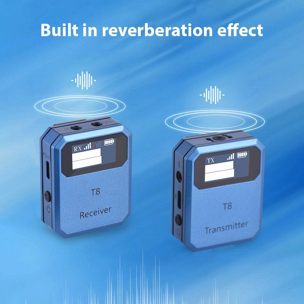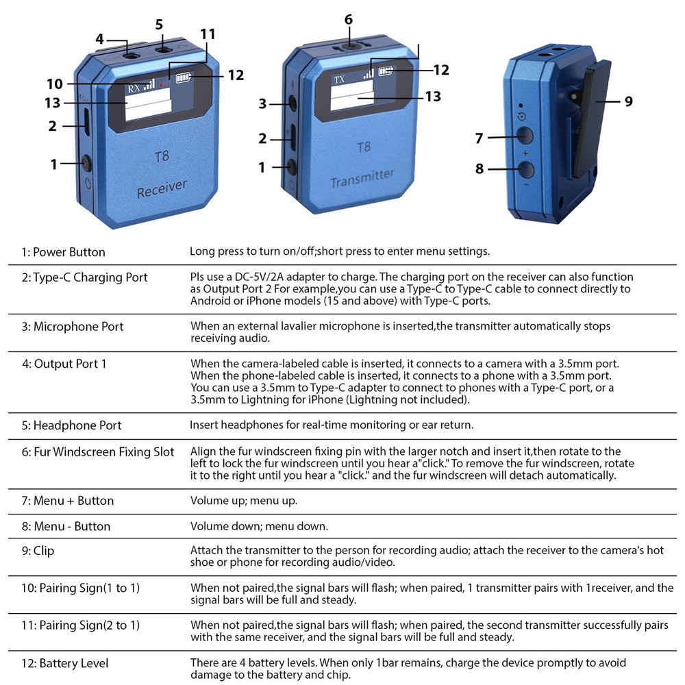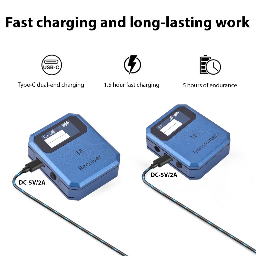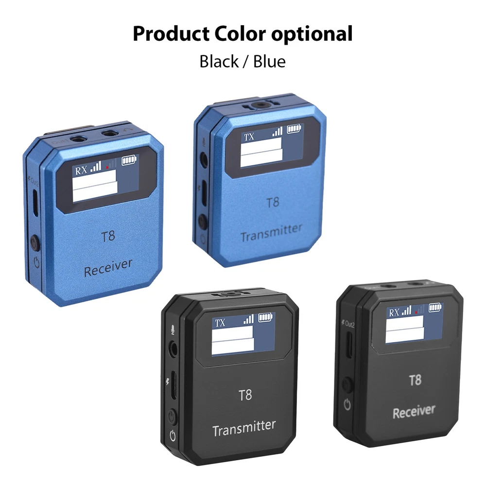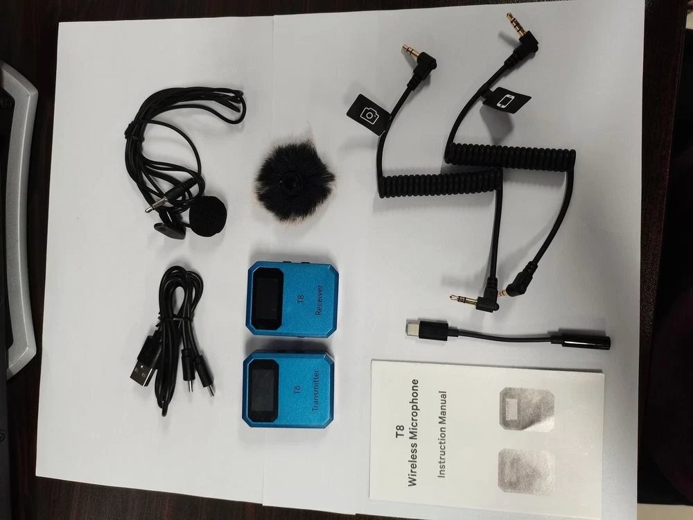Feature: 1. Seamless Connection: Experience effortless audio capture with our Wireless Lavalier Microphone System, featuring automatic pairing for instant plug-and-play use. Simply turn on the microphone and mic receiver to start recording without any complicated setups. 2. Compact & Versatile Design: This mini microphone is designed for versatility, functioning as both a clip-on microphone and a compact waist transmitter. Its lightweight construction makes it easy to carry, ensuring you can take your wireless mics anywhere. 3. Exceptional Sound Quality: Our high-sensitivity lapel microphone provides 360° omnidirectional sound pickup, capturing every detail with clarity. Enjoy real-time monitoring and adjustments, allowing you to listen and tweak settings while recording. 4. Noise Reduction & Wind Protection: Equipped with an advanced noise reduction chip, this microphone minimizes environmental noise interference, making it ideal for outdoor interviews or VLOG shoots. The included fur windscreen effectively reduces wind noise in breezy conditions. 5. Broad Compatibility & Extended Battery Life: With a transmission range of up to 30 meters, this Wireless Clip on Microphones system easily connects to various devices including smartphones, cameras, and laptops. Featuring a rechargeable battery with 4-5 hours of runtime, it supports continuous use for video recordings, live streaming, and more. Specification: Frequency Band: 24GHz Dynamic Range: 108dB Audio Resolution: 24 bit/48KHz Frequency Response: 20Hz~20KHz,+1dB/-3dB Frequency Stability Value: ± 3PPM Transmission Delay: <4ms Battery Capacity: 3.7V/300mAh Voltage: 5V Charging Interface Type: Type-C interface Charging Time: 1.5 hours Battery Life: 4-5 hours (varies depending on actual usage) Transmission Distance: 30 m/98 ft (not suitable for partition walls) Product Color: Black, Blue (optional) Product Shell: ABS Product Size: 4.2 * 2.6 * 5.3cm/1.7 * 1 * 2.1inch Single Product Weight: 30g/1.1oz Package List: 1 * Transmitter 1 * Receiver 1 * Dual-ended Type-C Charging Cable 1 * Fur Windscreen 1 * Lavalier Microphone 1 * 3.5mm to 3.5mm cable (camera-labeled) 1 * 3.5mm to 3.5mm cable (phone-labeled) 1 * Instruction Manual