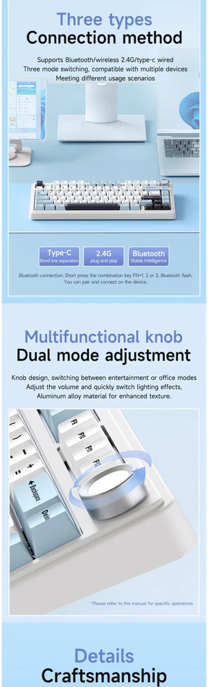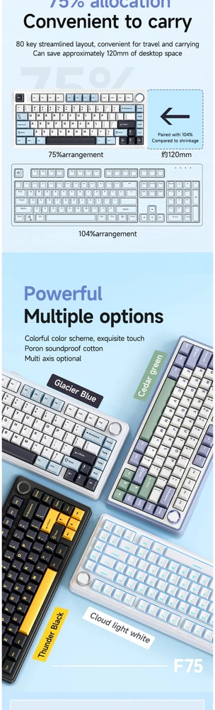 Wired USB RGB LED Light PC Computer Custom 2.4G Wireless Gaming Mechanical Switch 75% Keyboard Bluetooth Specification item value Full Size keyboard No Features Wireless, Plug and Play, Multimedia Keys Operation Style Mechanical Drive Interface USB 3.0 Private Mold Yes Style Mini, Standard, Gaming, Multimedia, Fashion Type 2.4Ghz Wireless Interface Type usb, Wireless Keyboard Standard 81 KEYS Wrist Support NO Products Status New Application Desktop Brand Name AULA Model Number F75 Axis Body Brand Kailh Keyboard backlit RGB Anti-ghosting FULL KEYS Mechanical Yes Programmable Yes Product Description